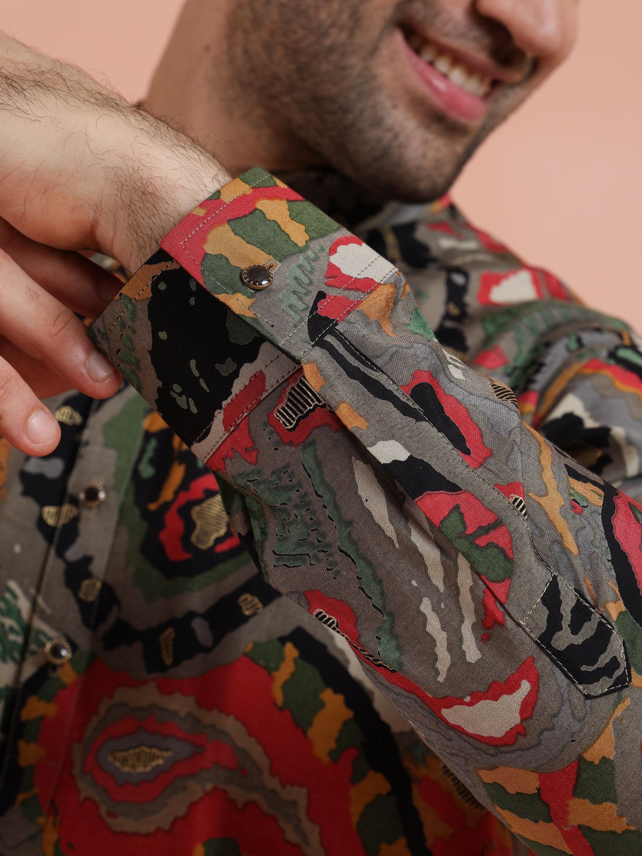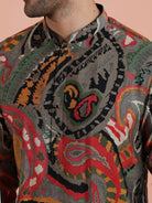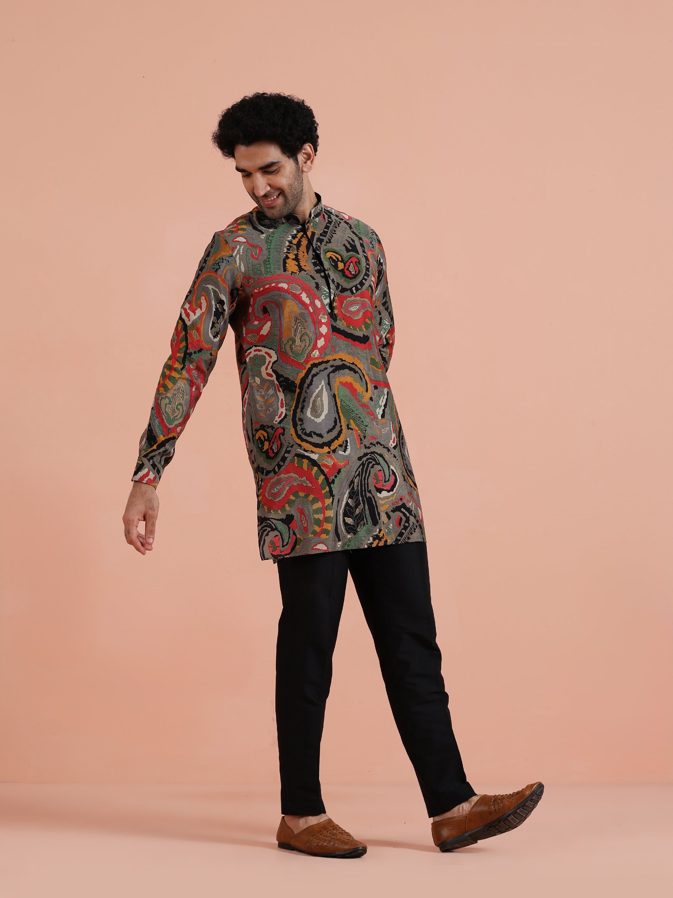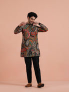 Kisah Menss Multicolor Paisley Mid Kurta Set with black trousers bold and festive ethnic outfit. Perfect for weddings, parties, and Indo-fusion celebrations.