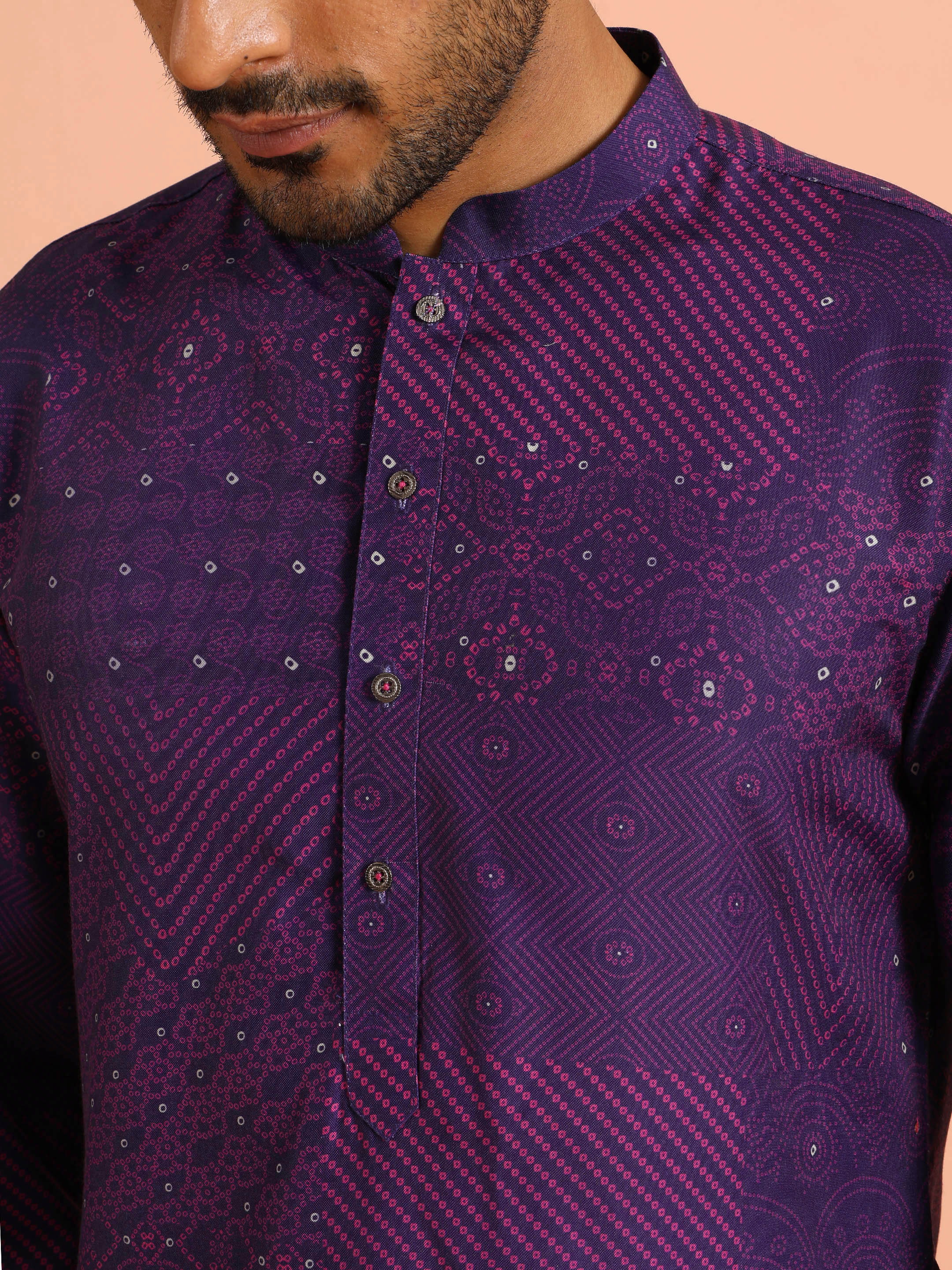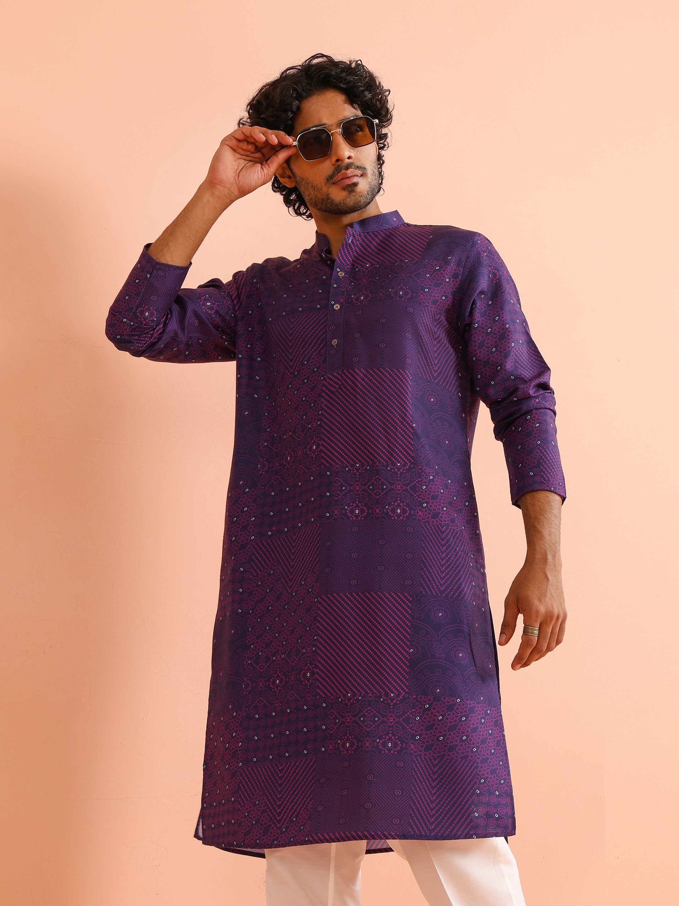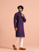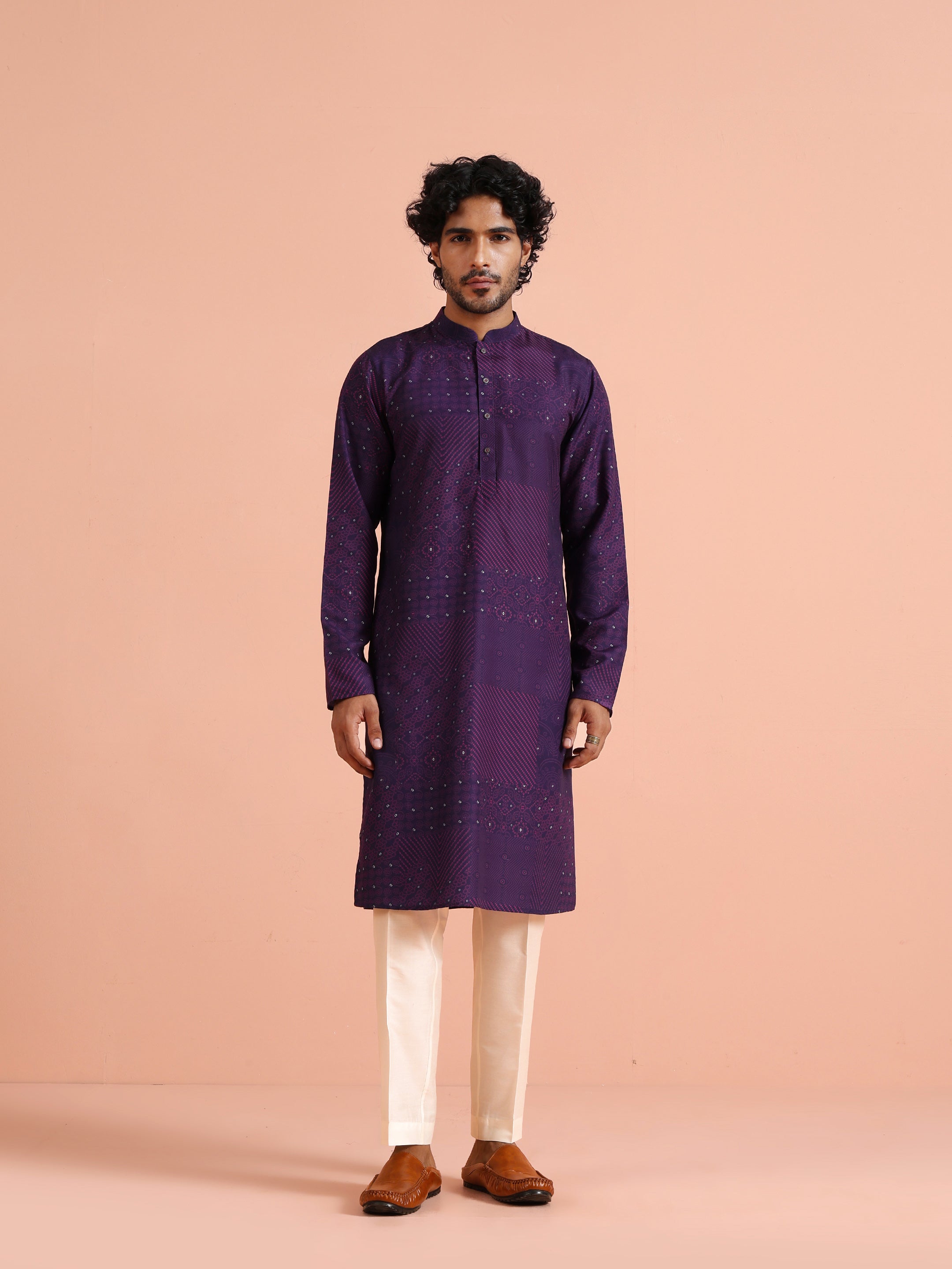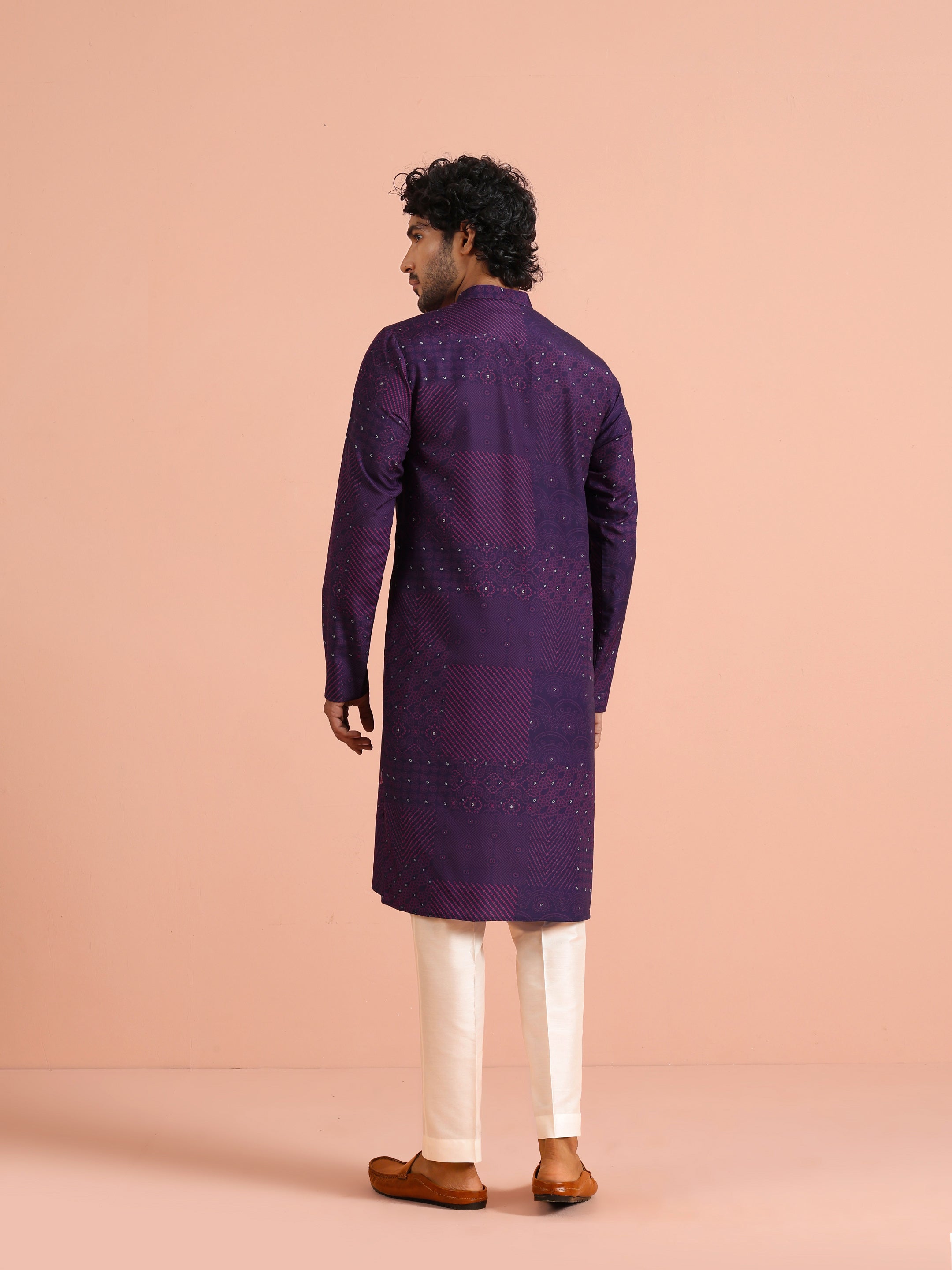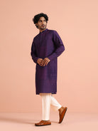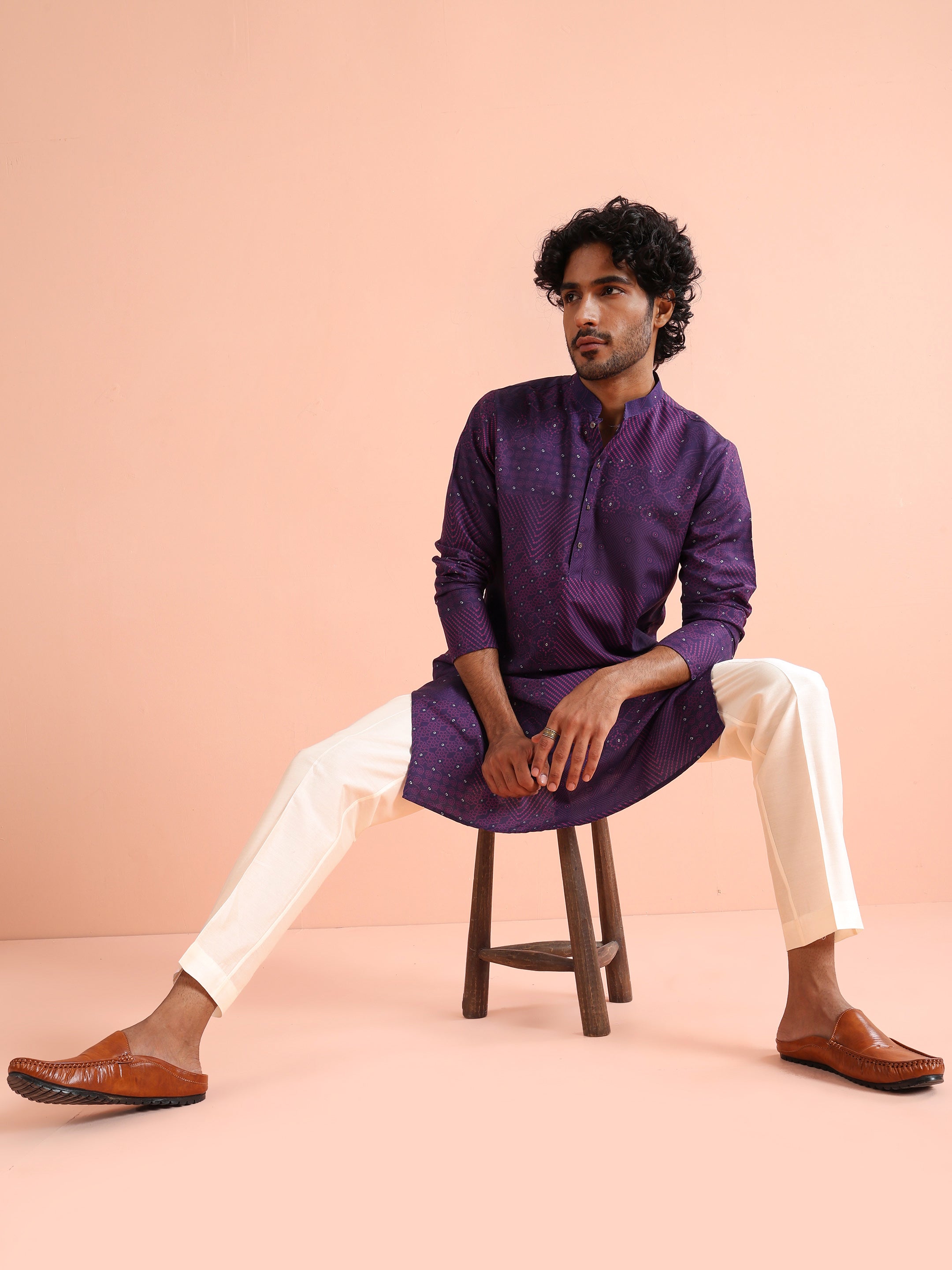 Kisah Menss Purple Cotton Blend Printed Kurta with Cream Trouser Elegant kurta trouser set for festive occasions, weddings, and pujas.