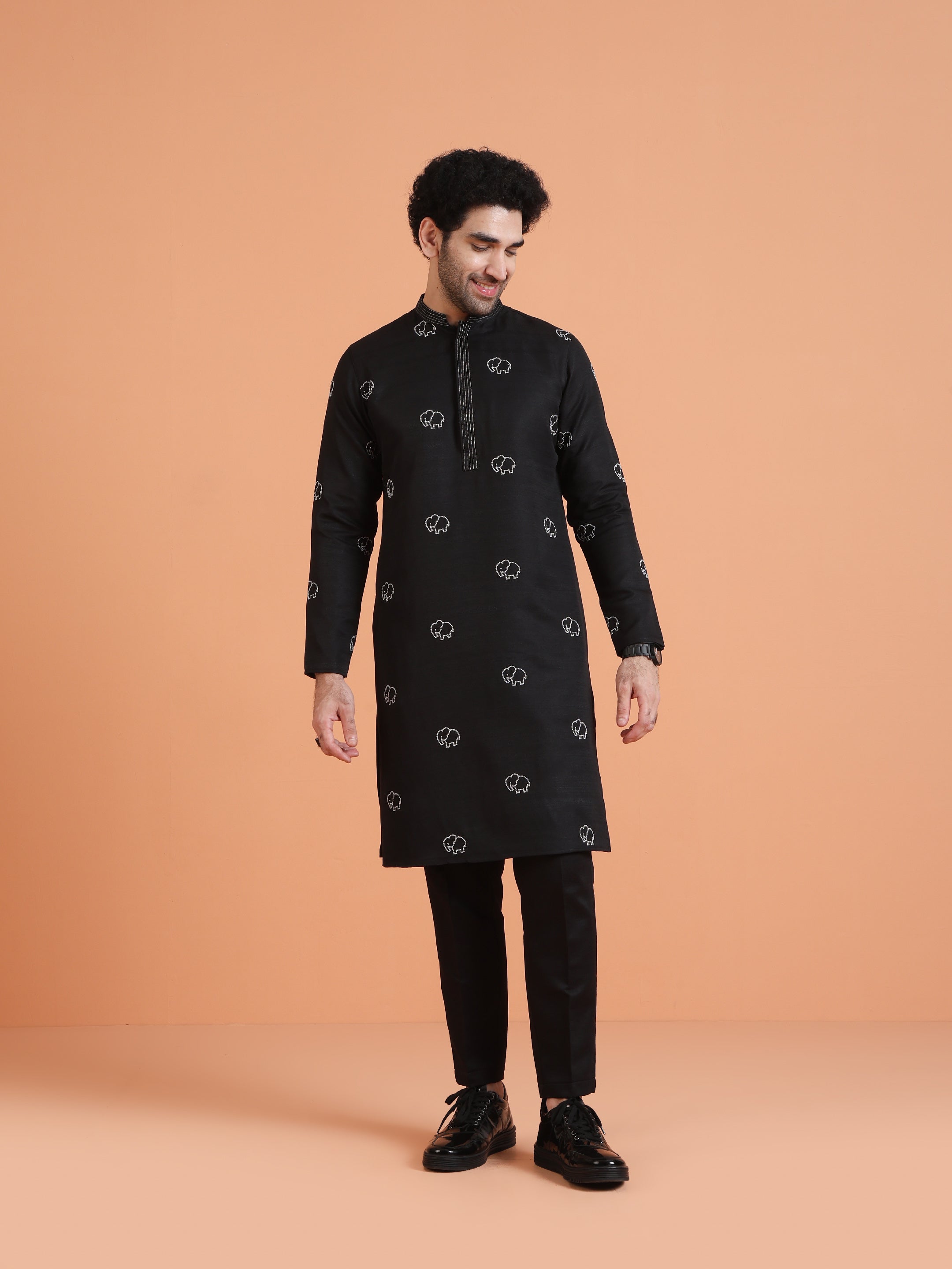 Kisah Black Embroidered Kurta with Black Trouser Set in silk blend, with pockets. A contemporary festive outfit for weddings and celebrations.