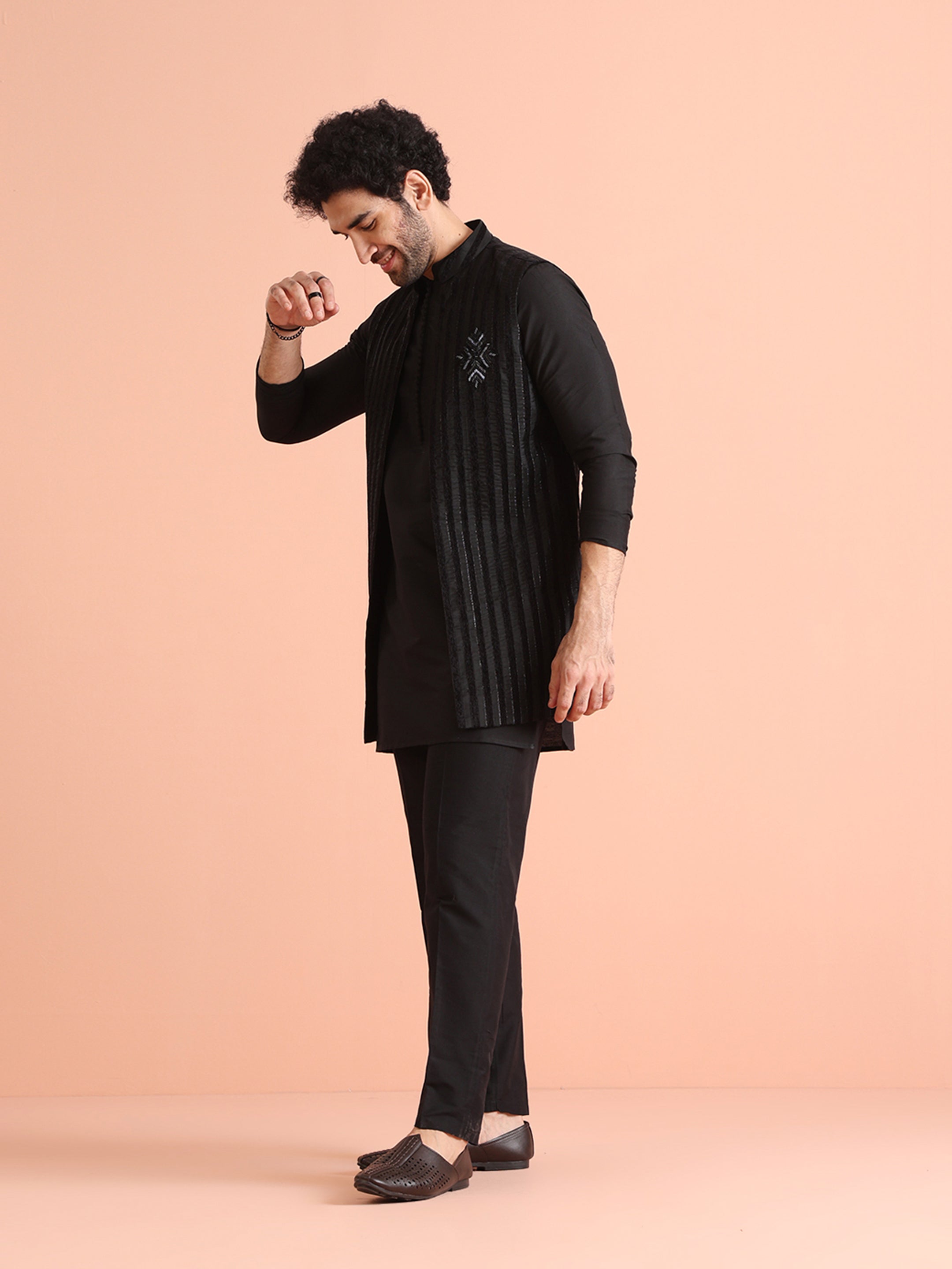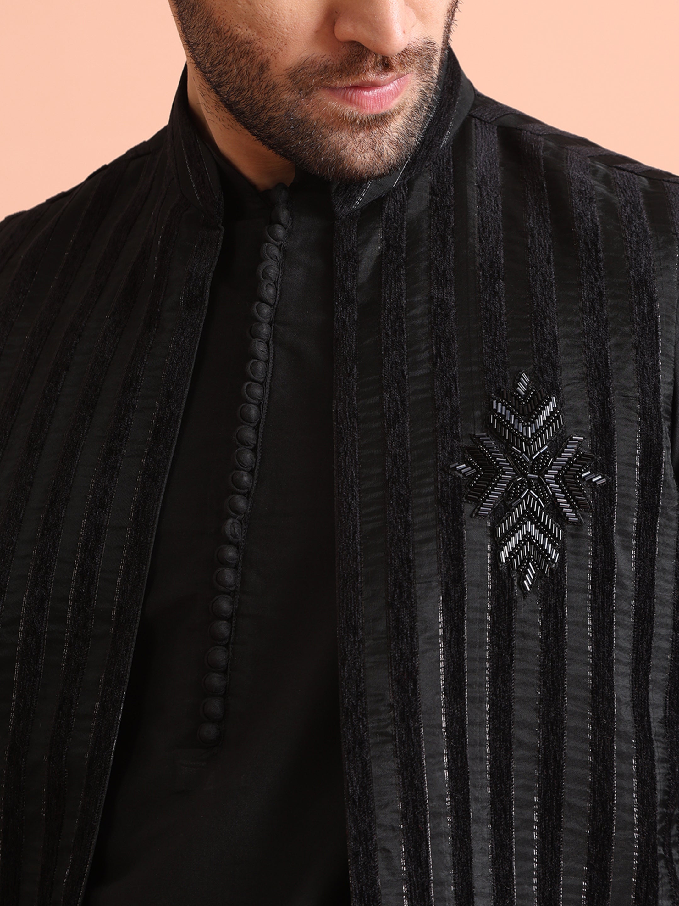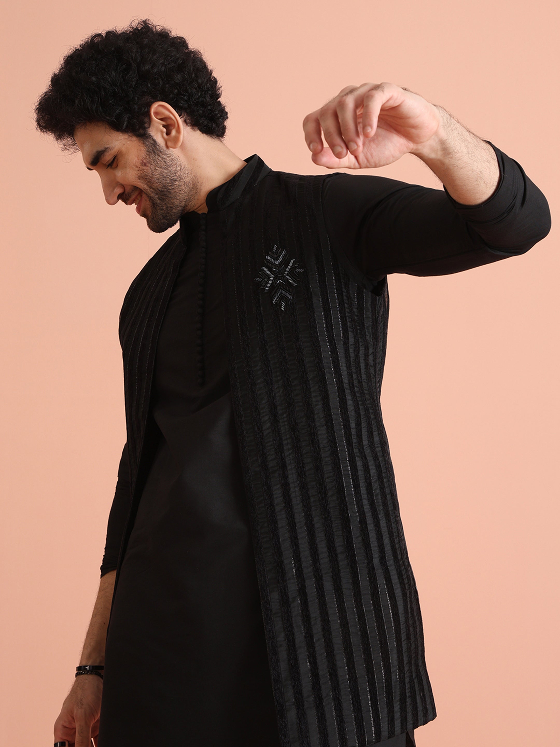 Experience classic elegance with this Men Black Sheer Kurta Jacket Trouser Set with Striped. The breathable Silk Blend fabric ensures comfort throughout the day. Ideal for festive events or casual wear.