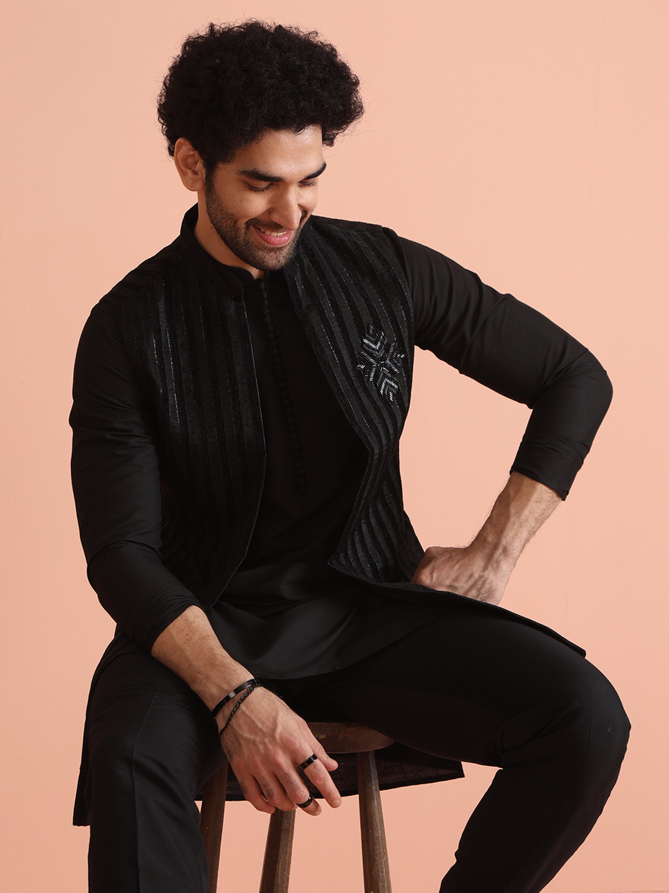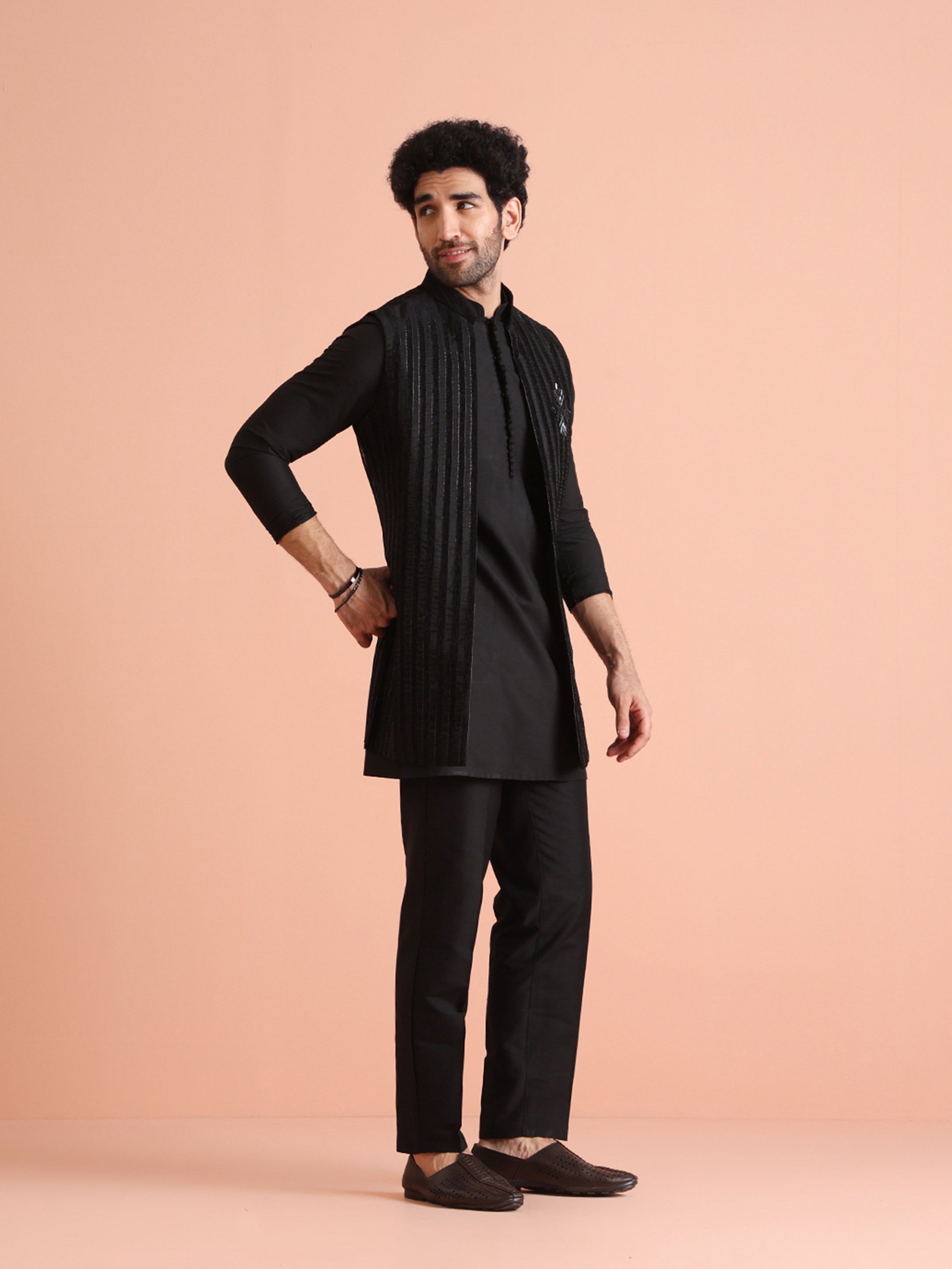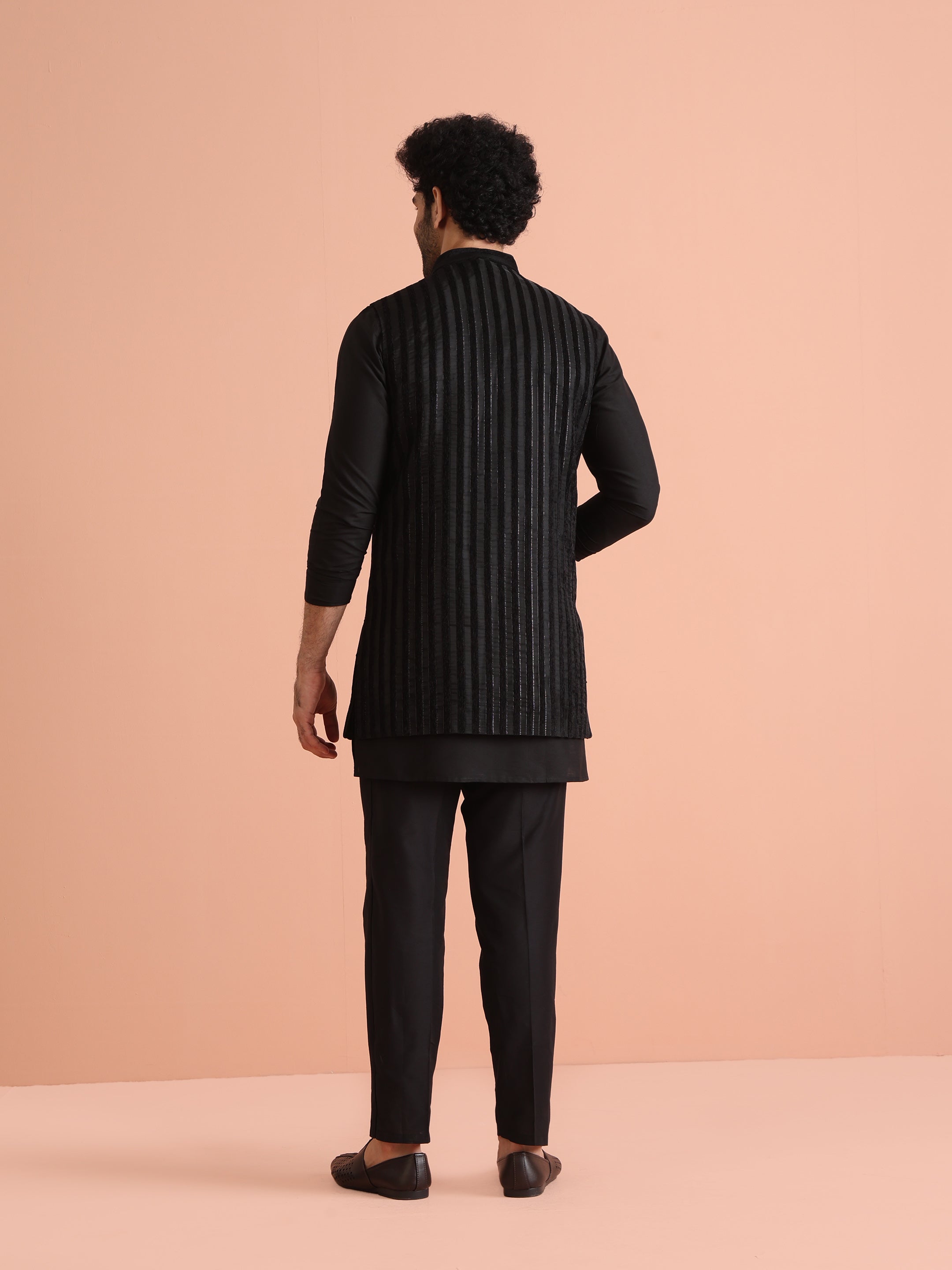 Experience classic elegance with this Men Black Sheer Kurta Jacket Trouser Set with Striped. The breathable Silk Blend fabric ensures comfort throughout the day. Ideal for festive events or casual wear.