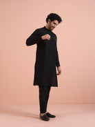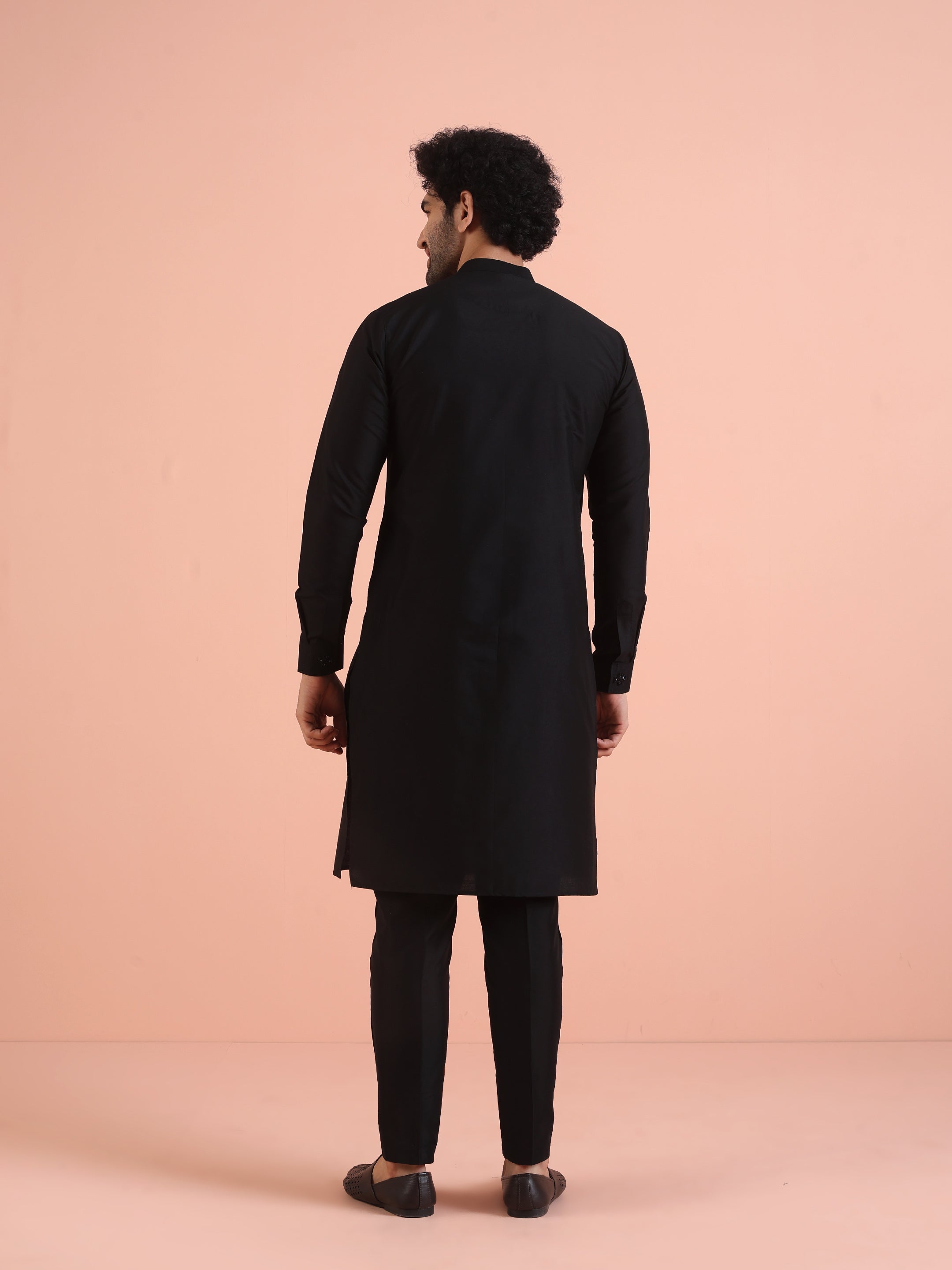 Experience classic elegance with this Men Black Solid Kurta Trouser Set with Patch Work. The breathable Silk Blend fabric ensures comfort throughout the day. Ideal for festive events or casual wear.