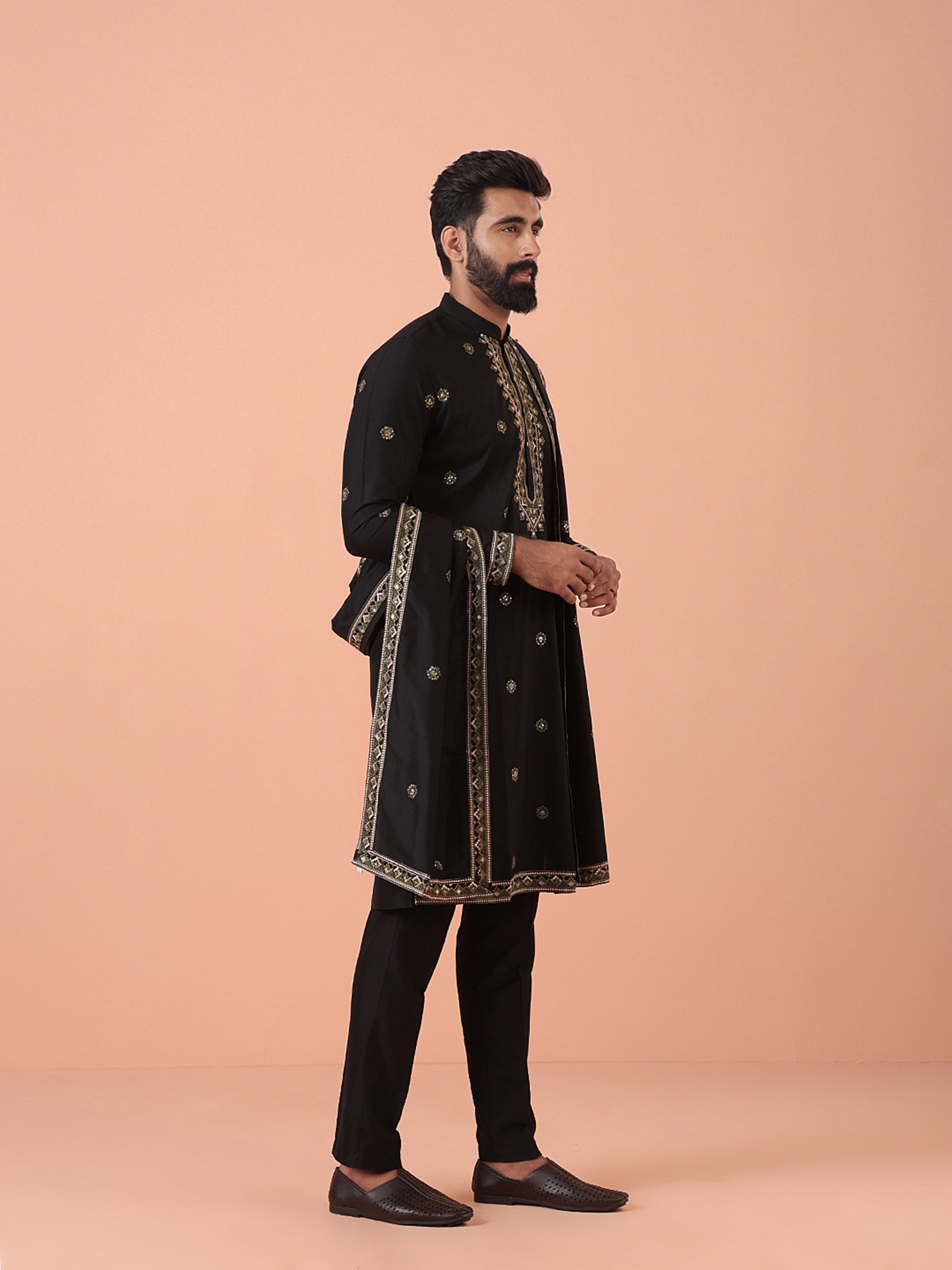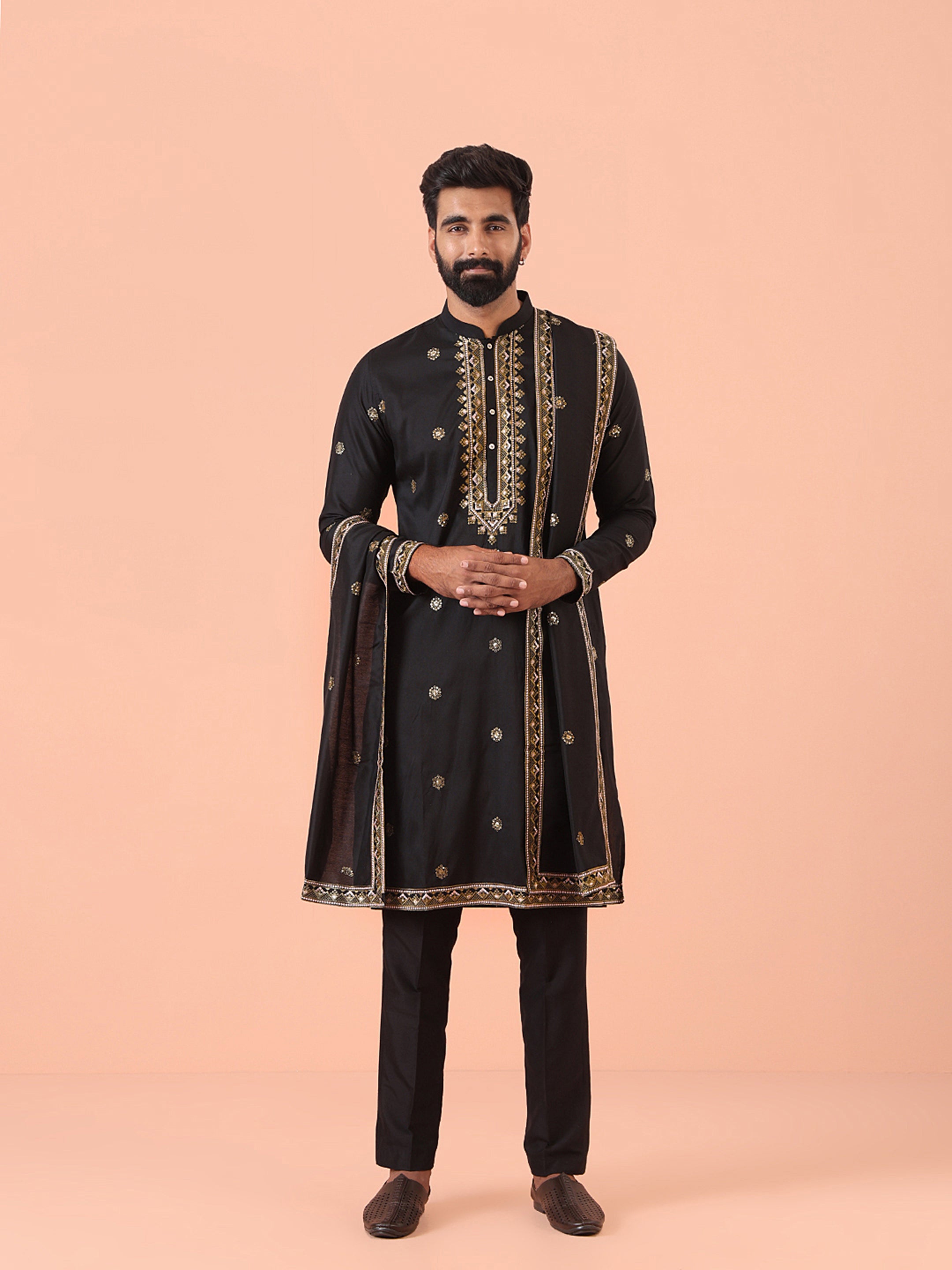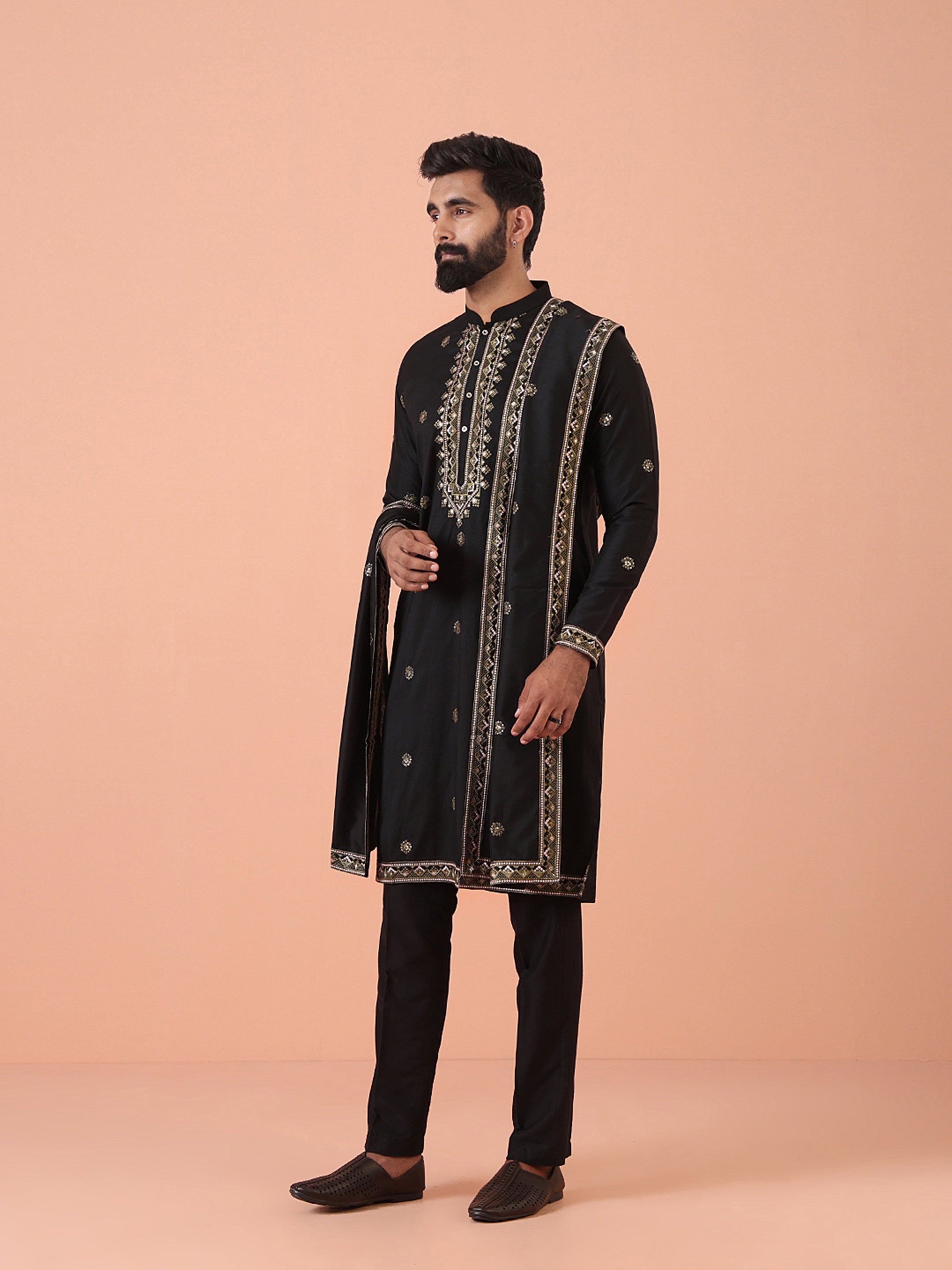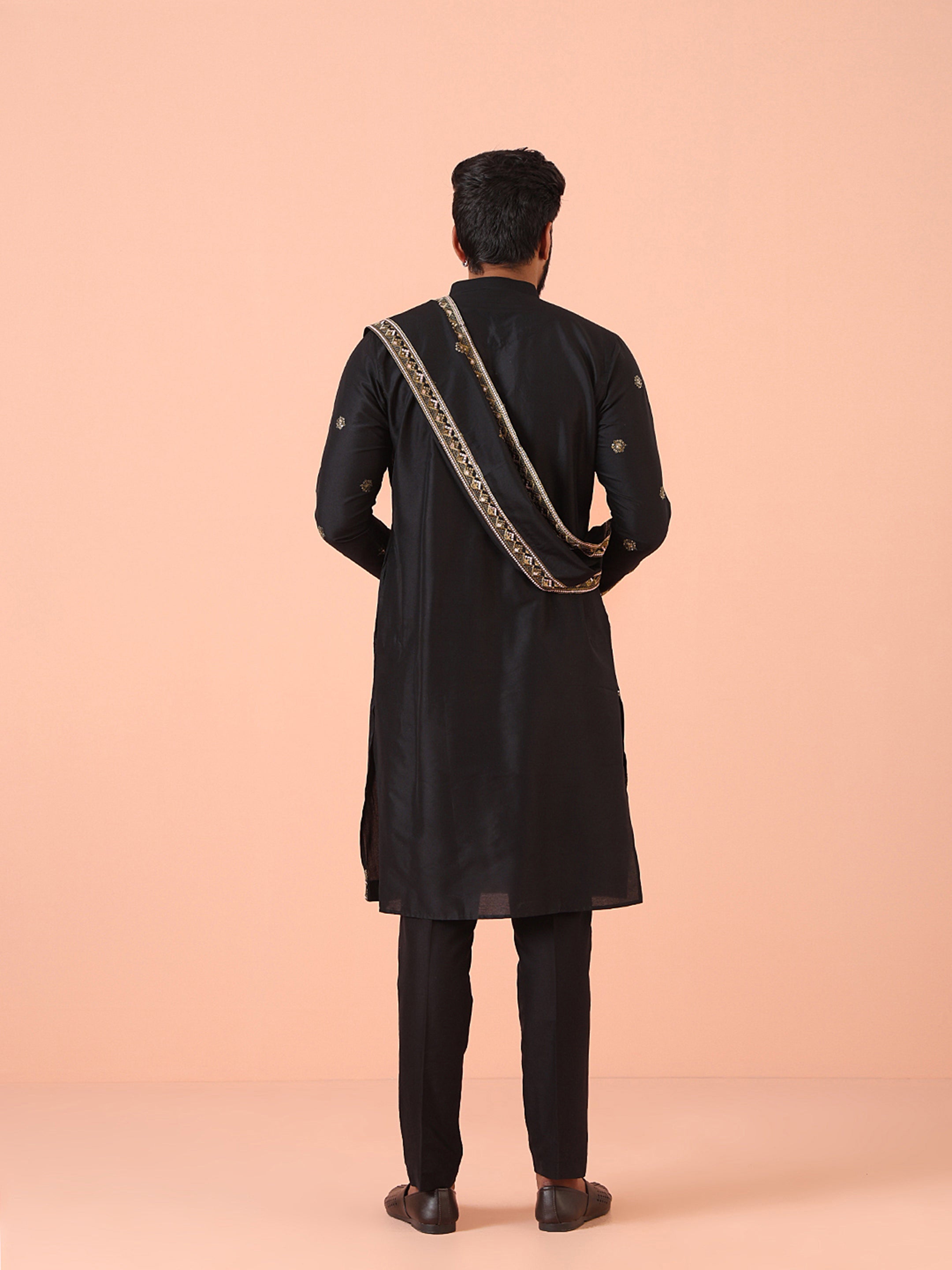 Experience classic elegance with this Men's Black Color Cotton Blend Kurta Trousers Set. The Thread Work Pattern adds a refined touch, while the breathable fabric ensures comfort throughout the day. Ideal for festive events or casual wear, this Kurta Trouser Set is a wardrobe essential.