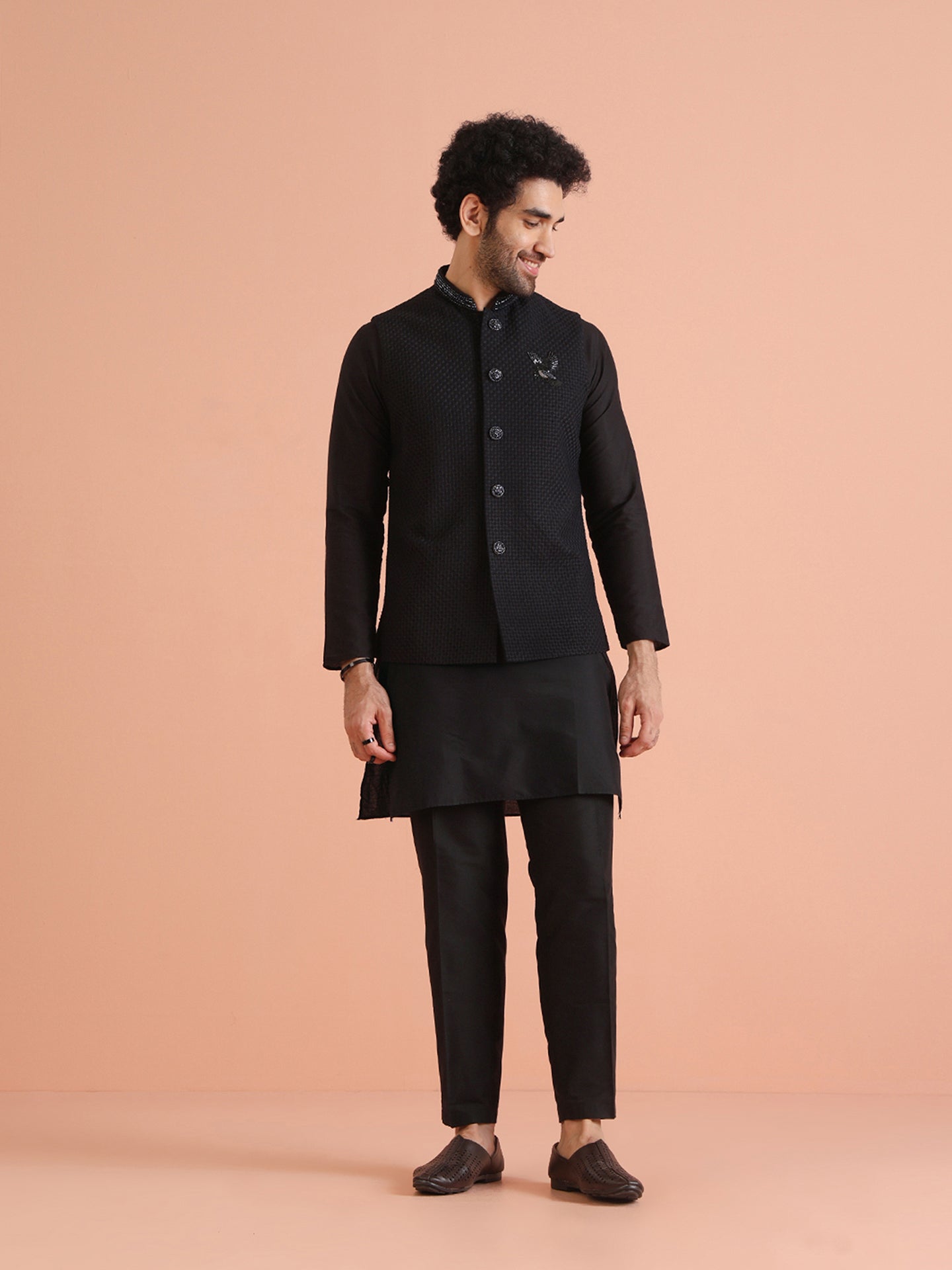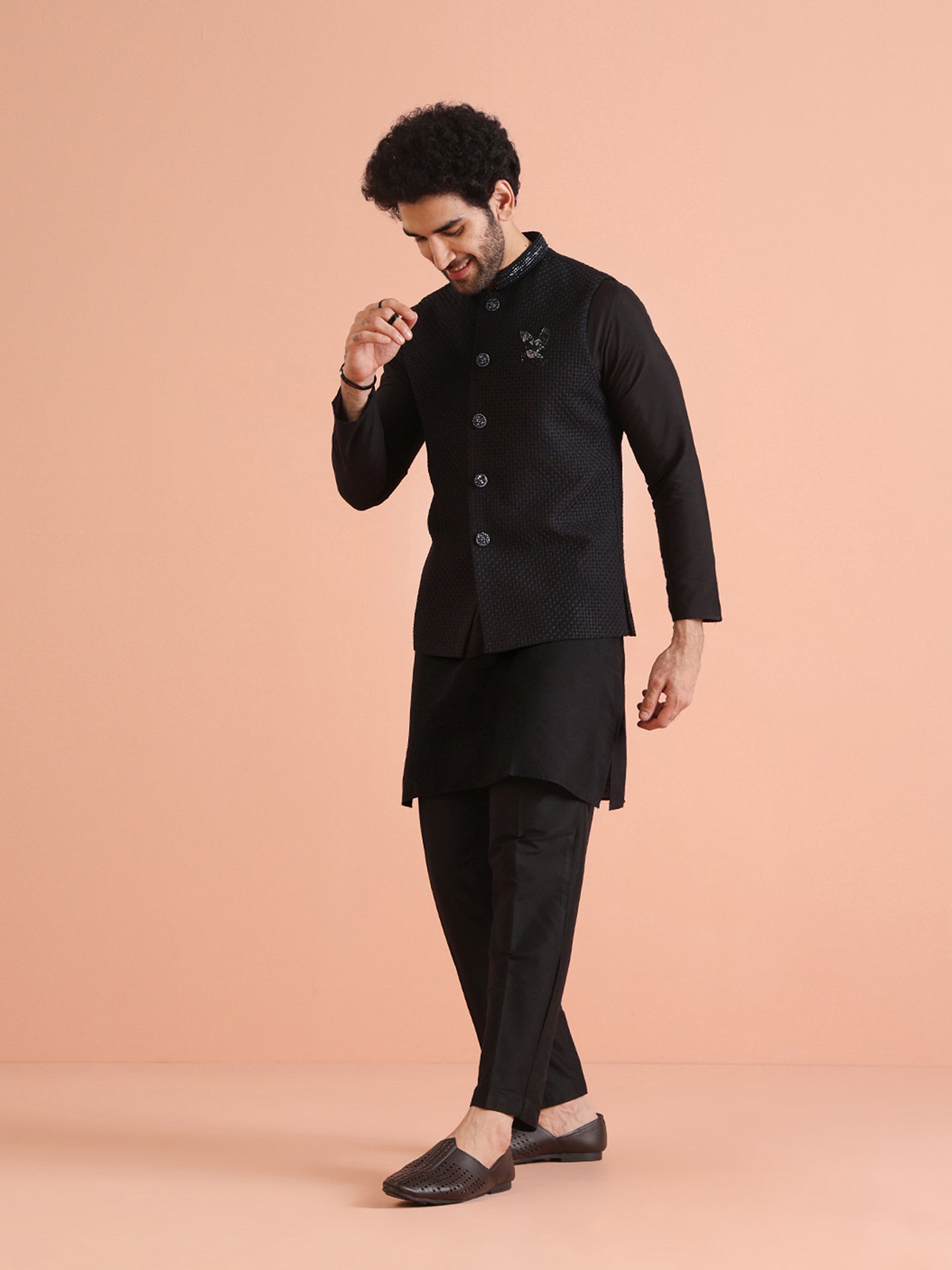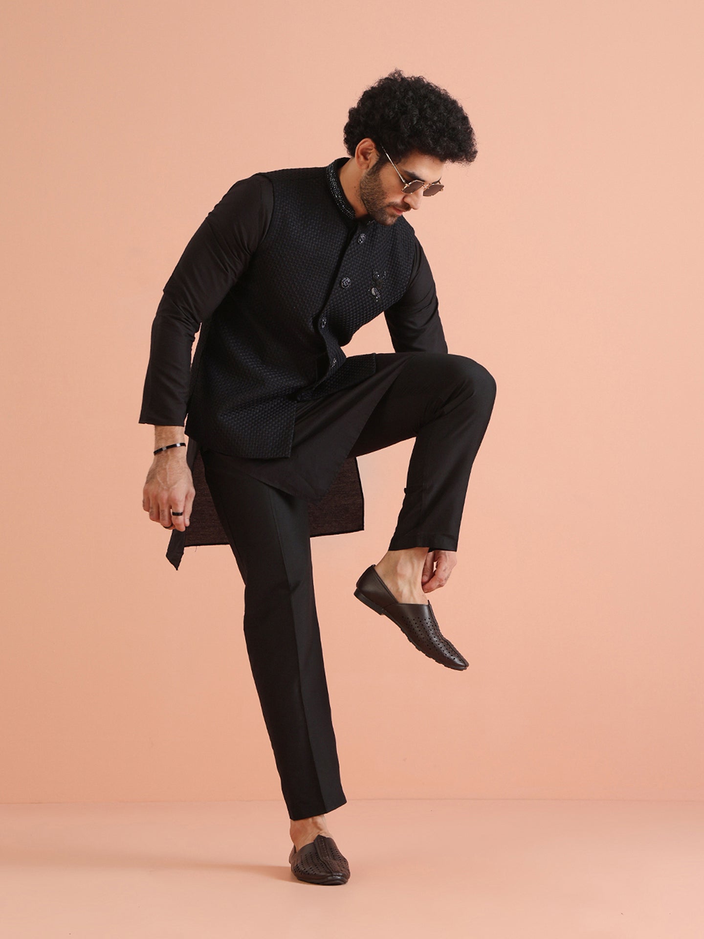 Experience classic elegance with this Men's Black Color Blended Kurta Jacket Trouser Set. The Embellished Pattern adds a refined touch, while the breathable fabric ensures comfort throughout the day. Ideal for festive events or casual wear, this Kurta Jacket Trouser Set is a wardrobe essential.