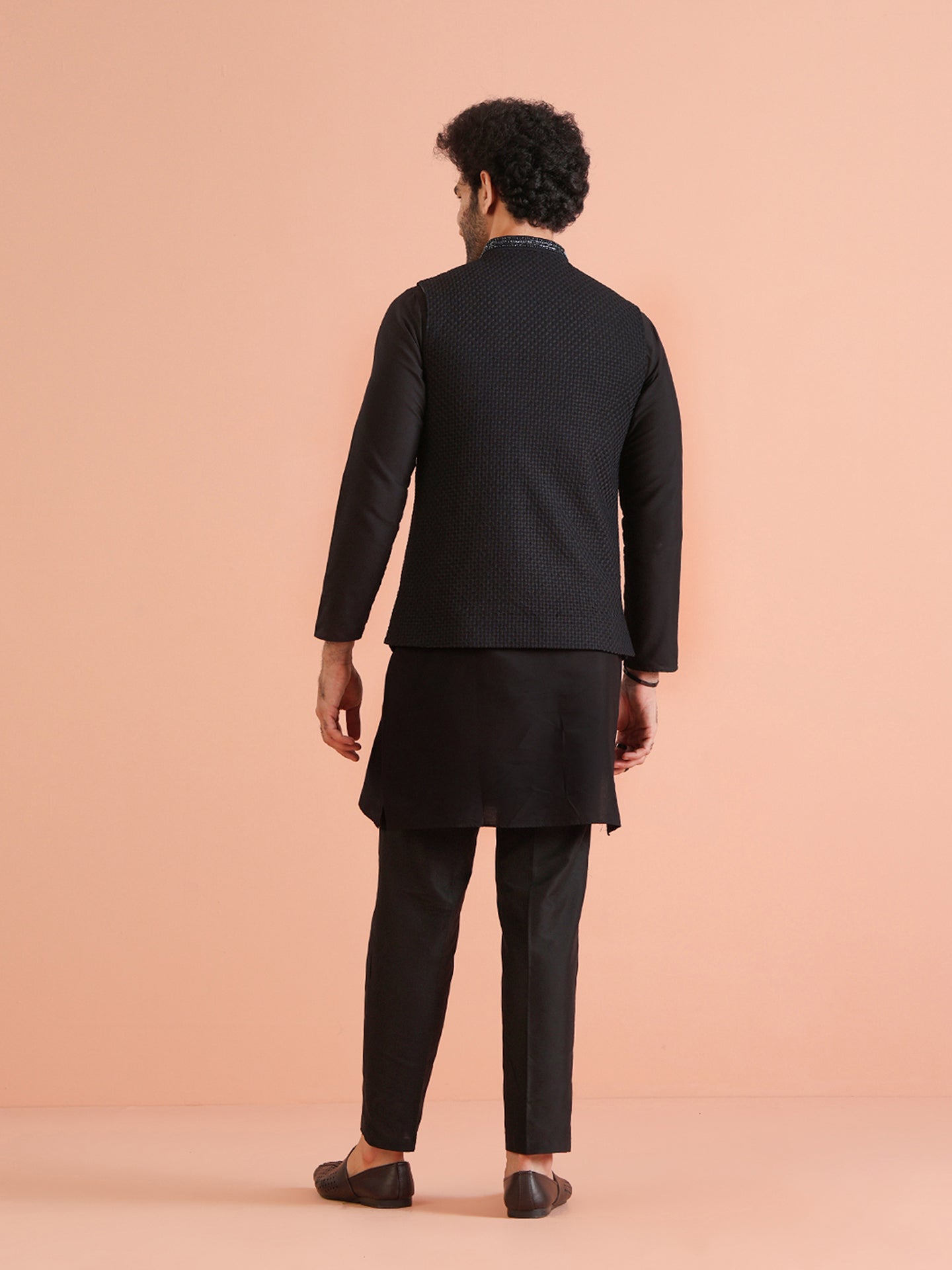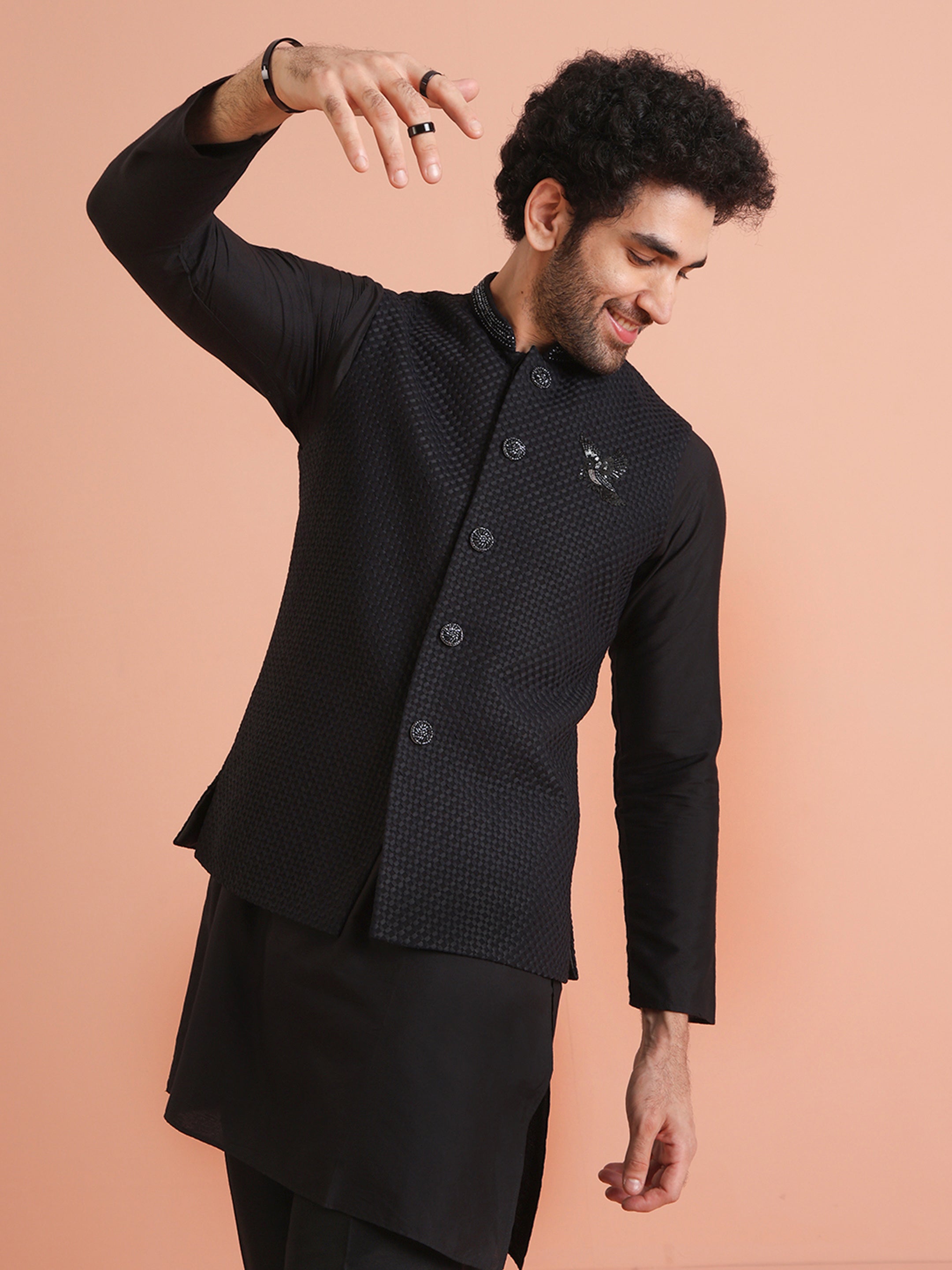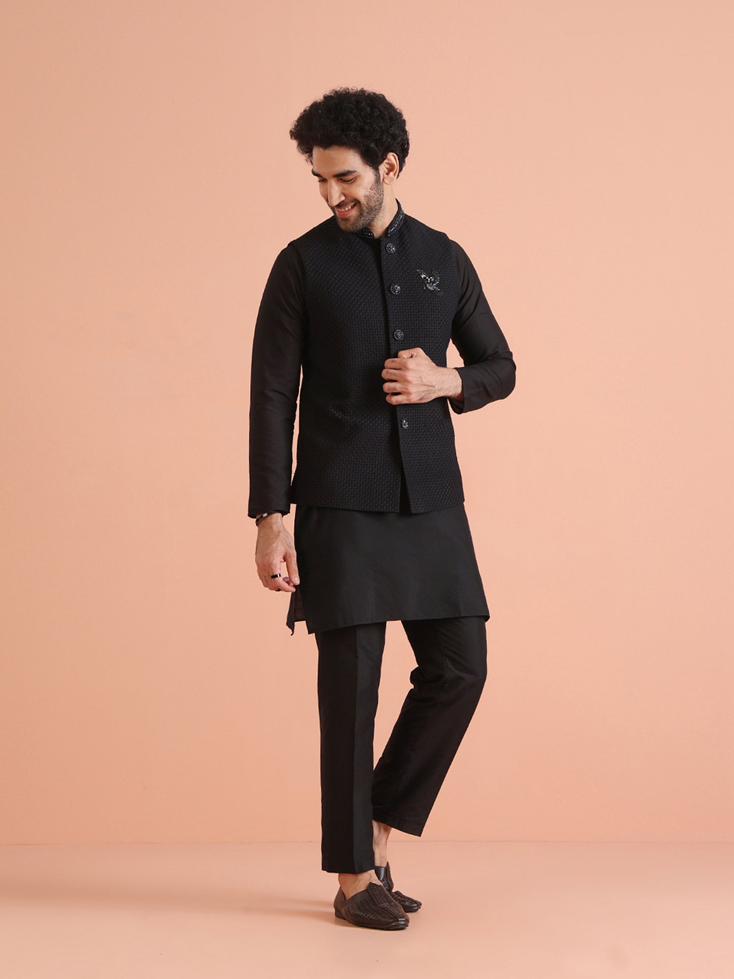 Experience classic elegance with this Men's Black Color Blended Kurta Jacket Trouser Set. The Embellished Pattern adds a refined touch, while the breathable fabric ensures comfort throughout the day. Ideal for festive events or casual wear, this Kurta Jacket Trouser Set is a wardrobe essential.