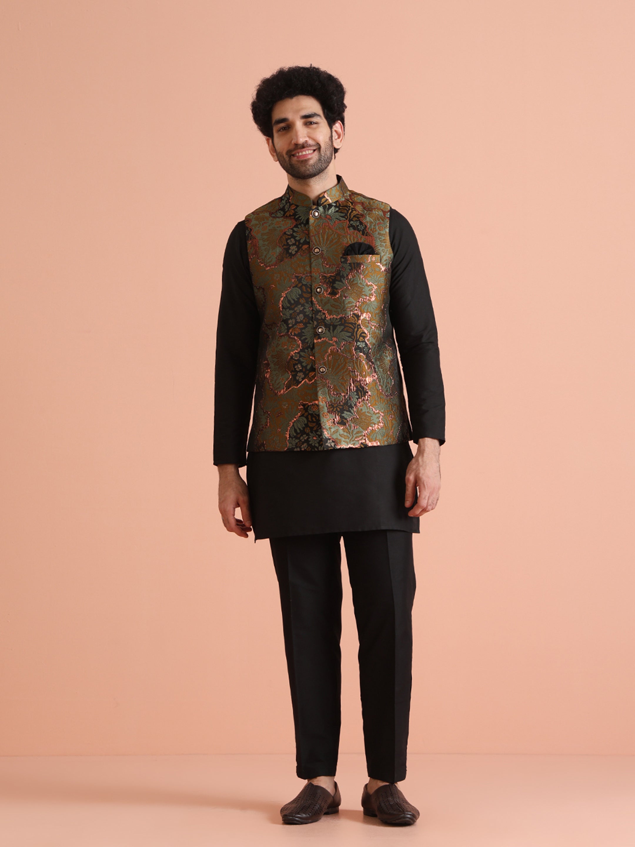 Experience classic elegance with this Men's Sage Green Color Silk Blend Kurta Jacket Trouser Set. The Jacquard Pattern adds a refined touch, while the breathable fabric ensures comfort throughout the day. Ideal for festive events or casual wear, this Kurta Jacket Trouser Set is a wardrobe essential.