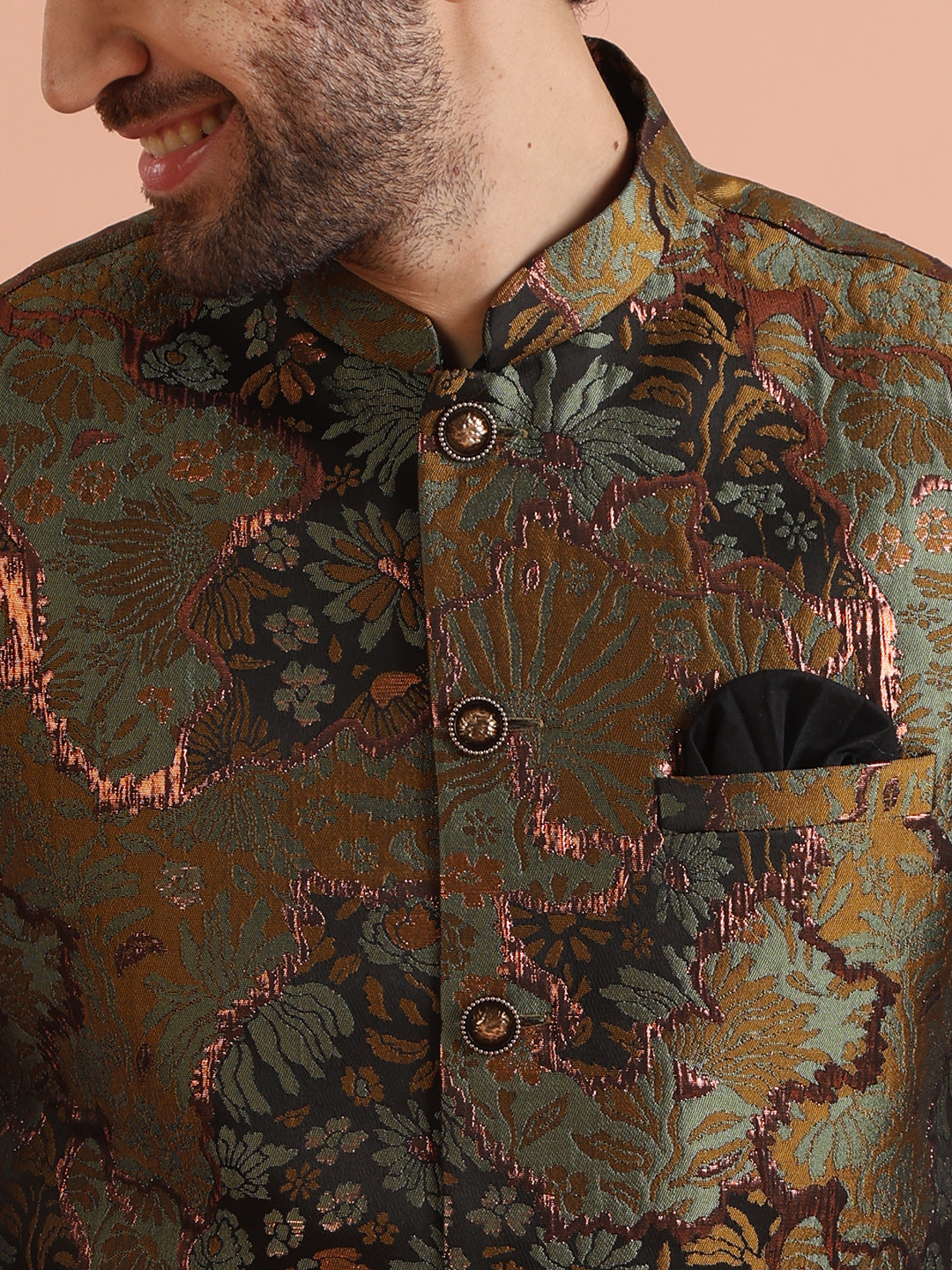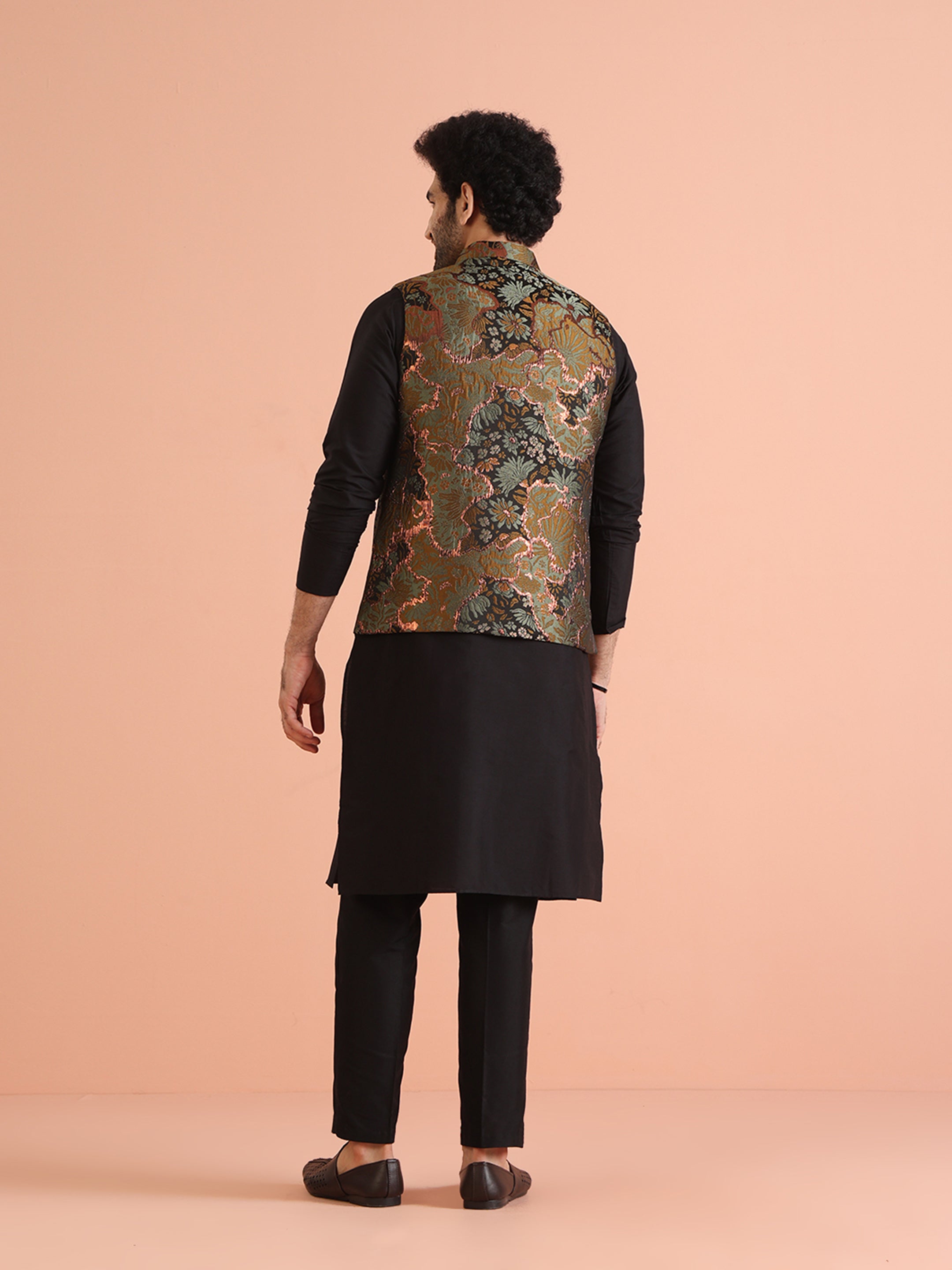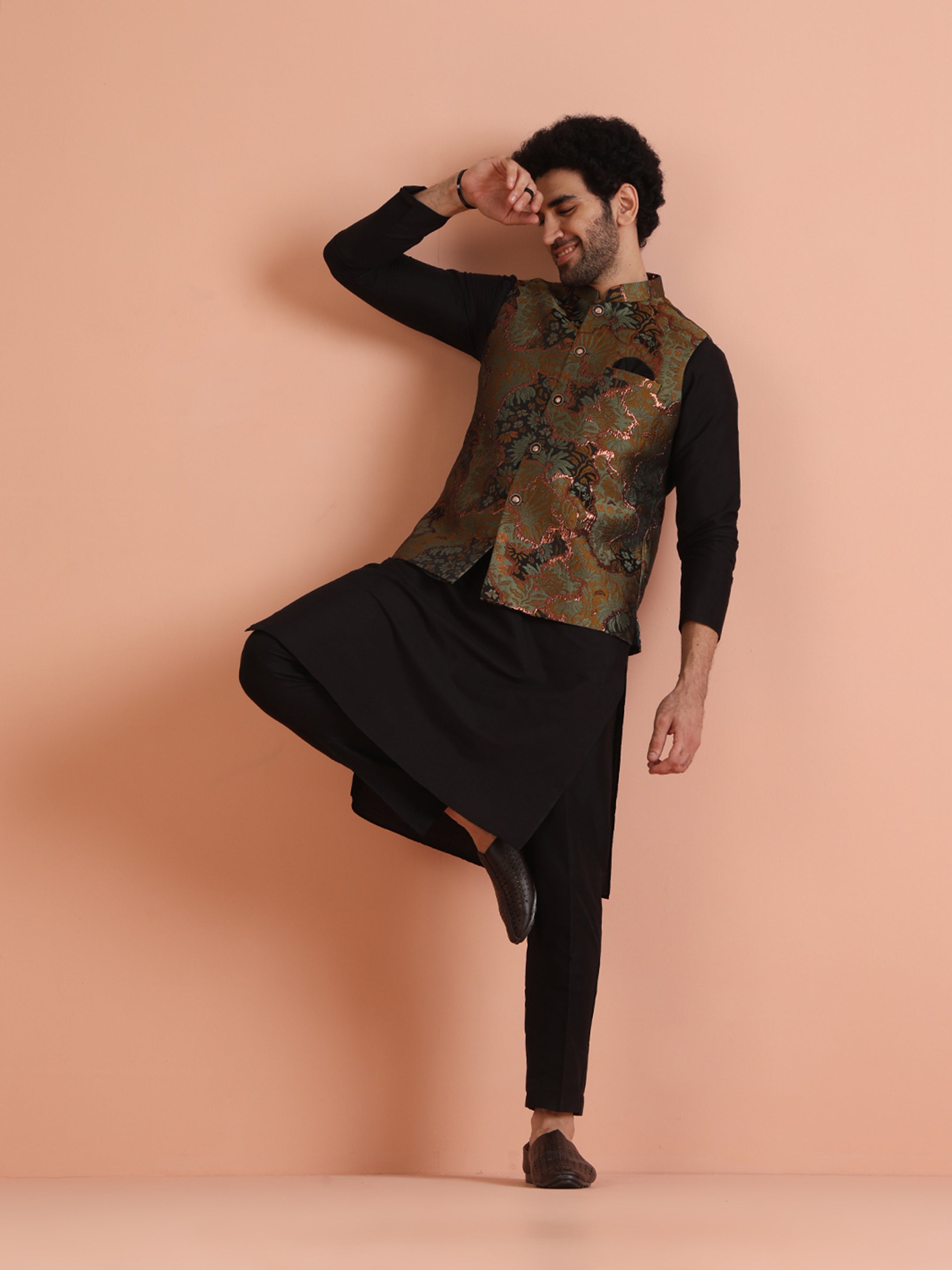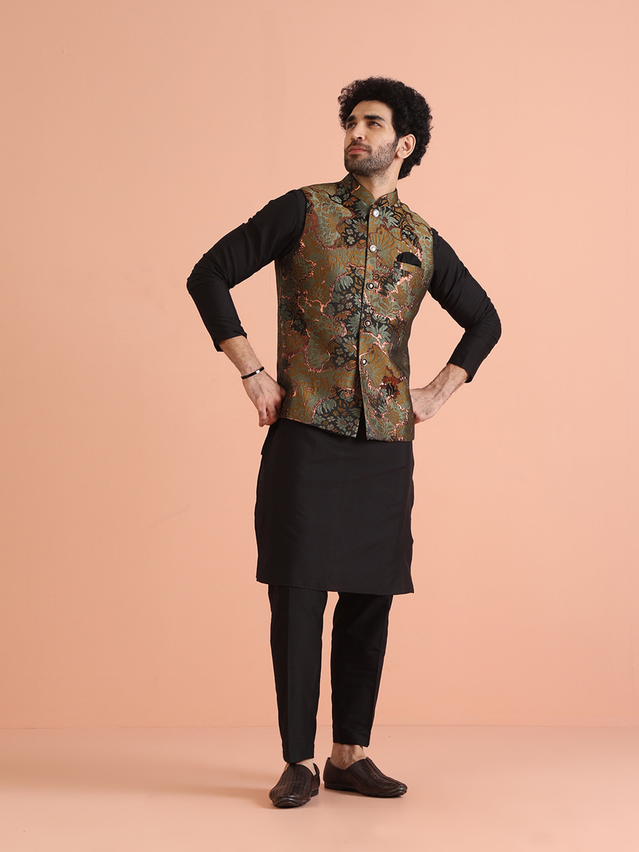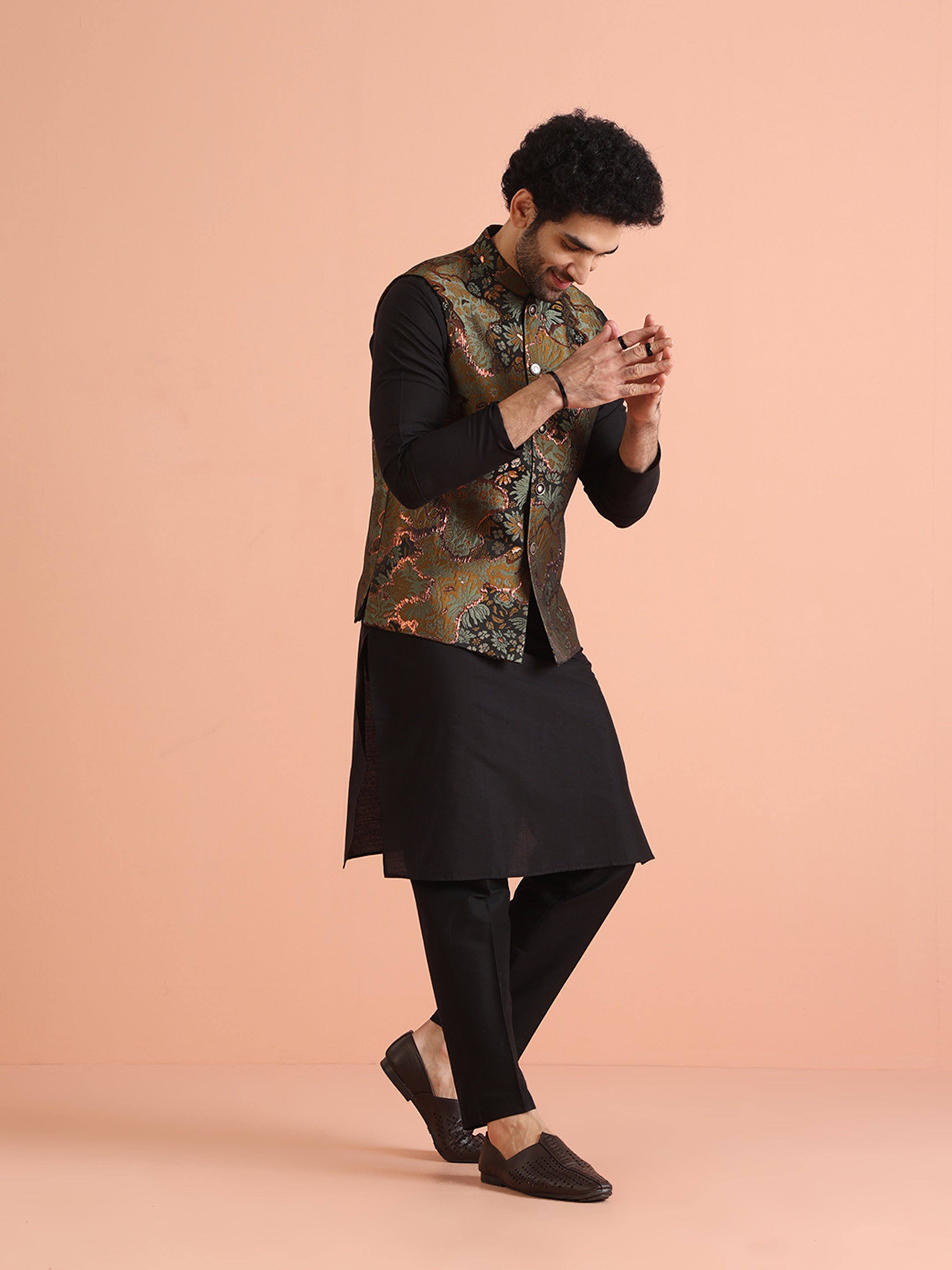 Experience classic elegance with this Men's Sage Green Color Silk Blend Kurta Jacket Trouser Set. The Jacquard Pattern adds a refined touch, while the breathable fabric ensures comfort throughout the day. Ideal for festive events or casual wear, this Kurta Jacket Trouser Set is a wardrobe essential.