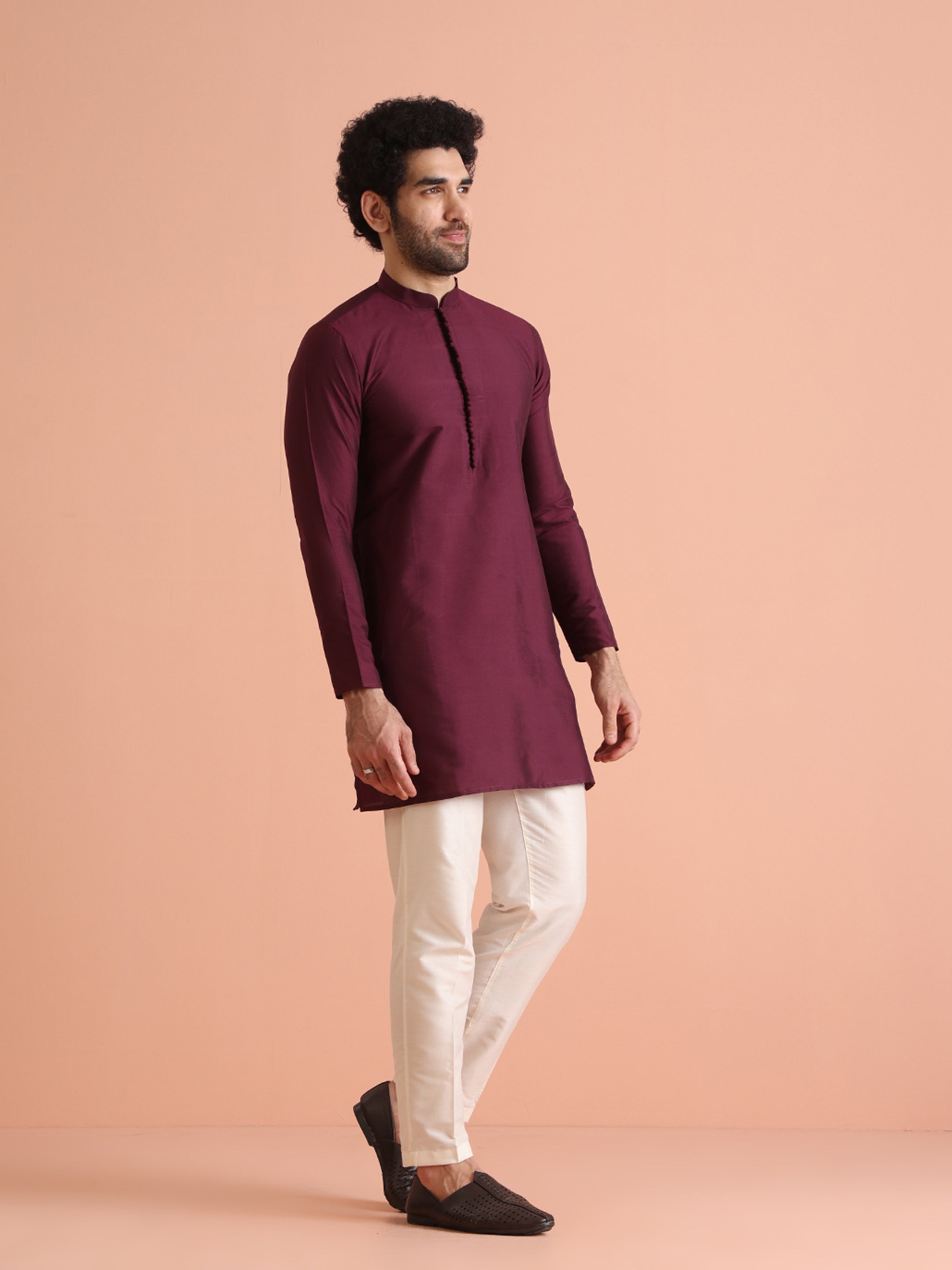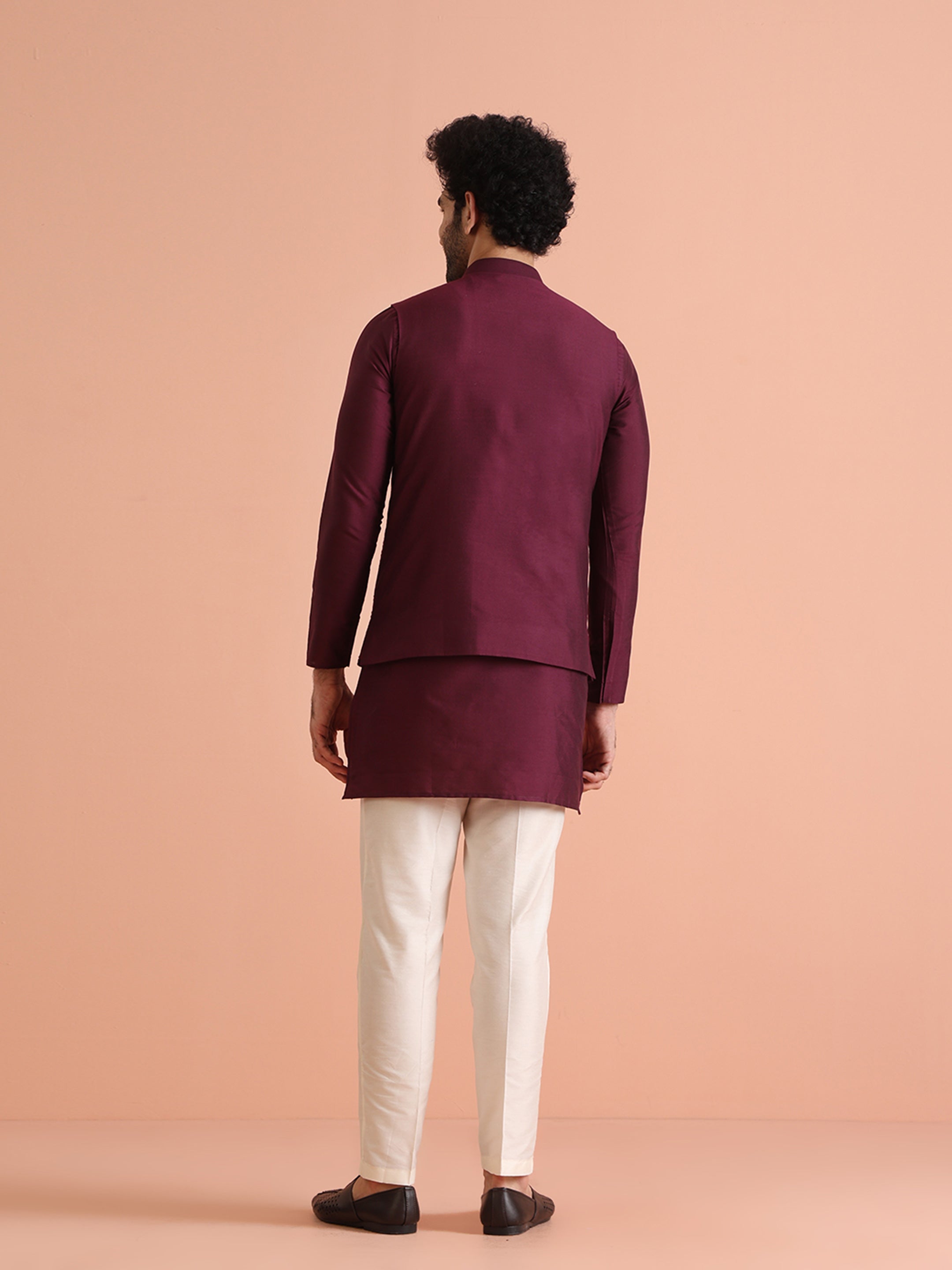 Experience classic elegance with this Men's Wine Color Cotton Blend Kurta Jacket Trouser Set. The Embellished Pattern adds a refined touch, while the breathable fabric ensures comfort throughout the day. Ideal for festive events or casual wear, this Kurta Jacket Trouser Set is a wardrobe essential.