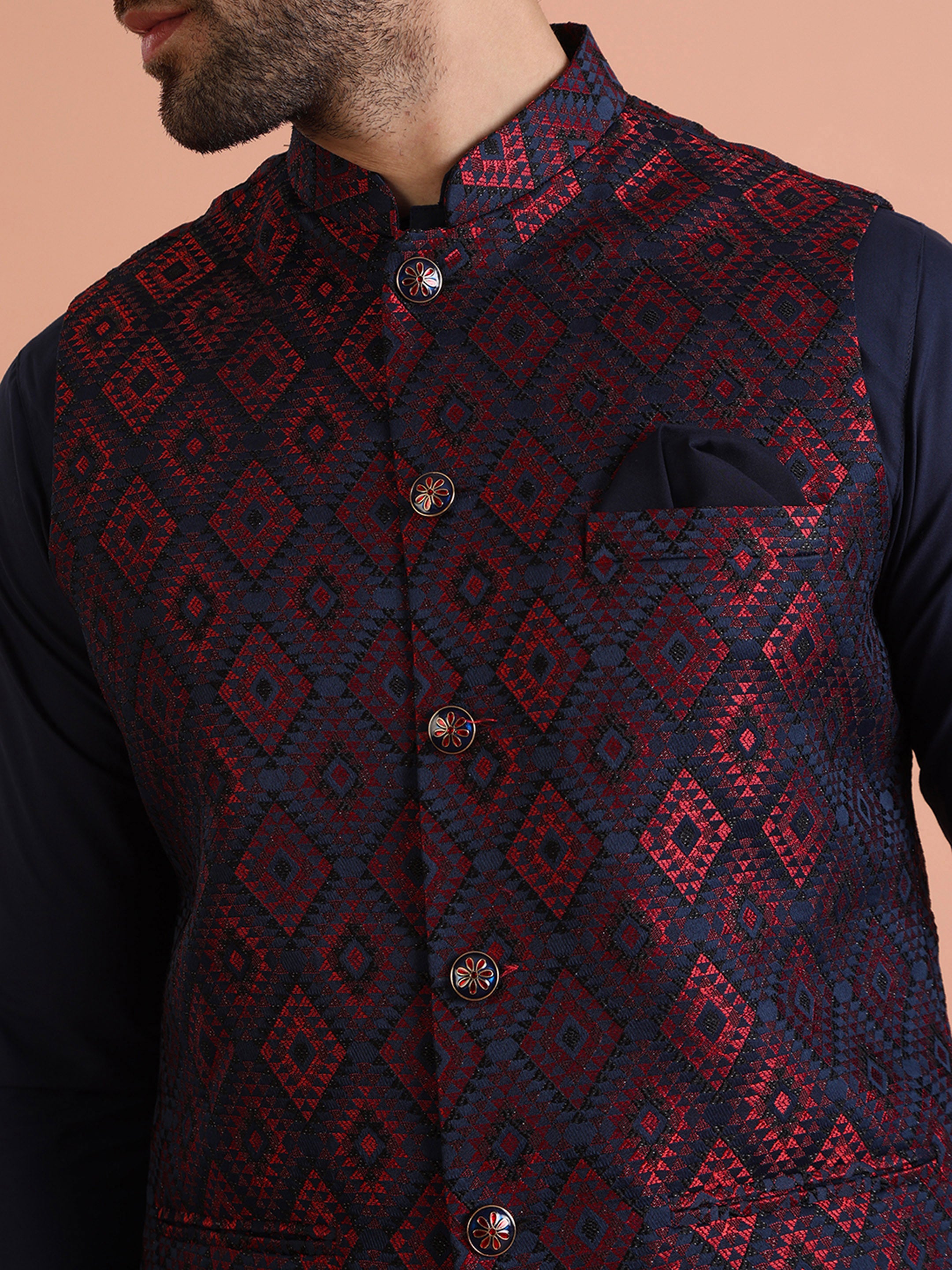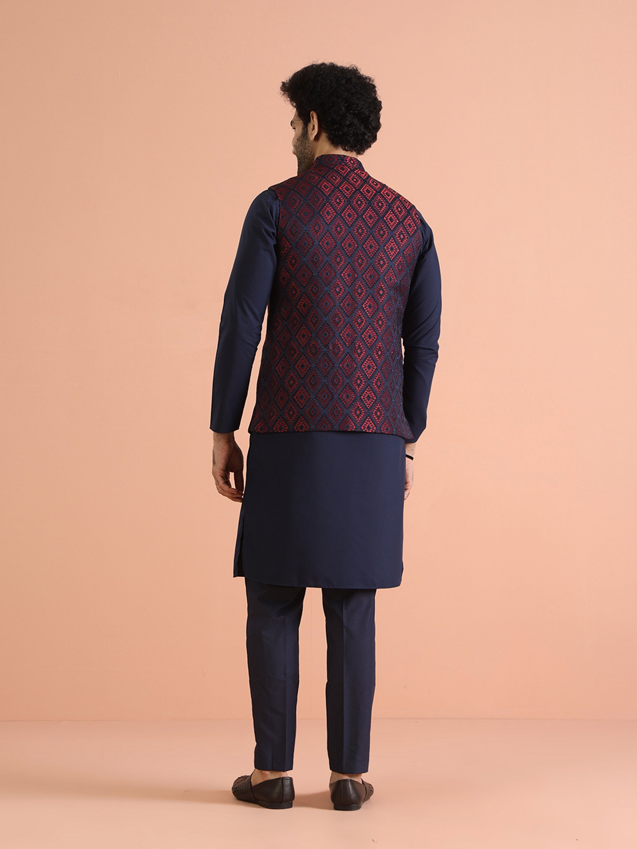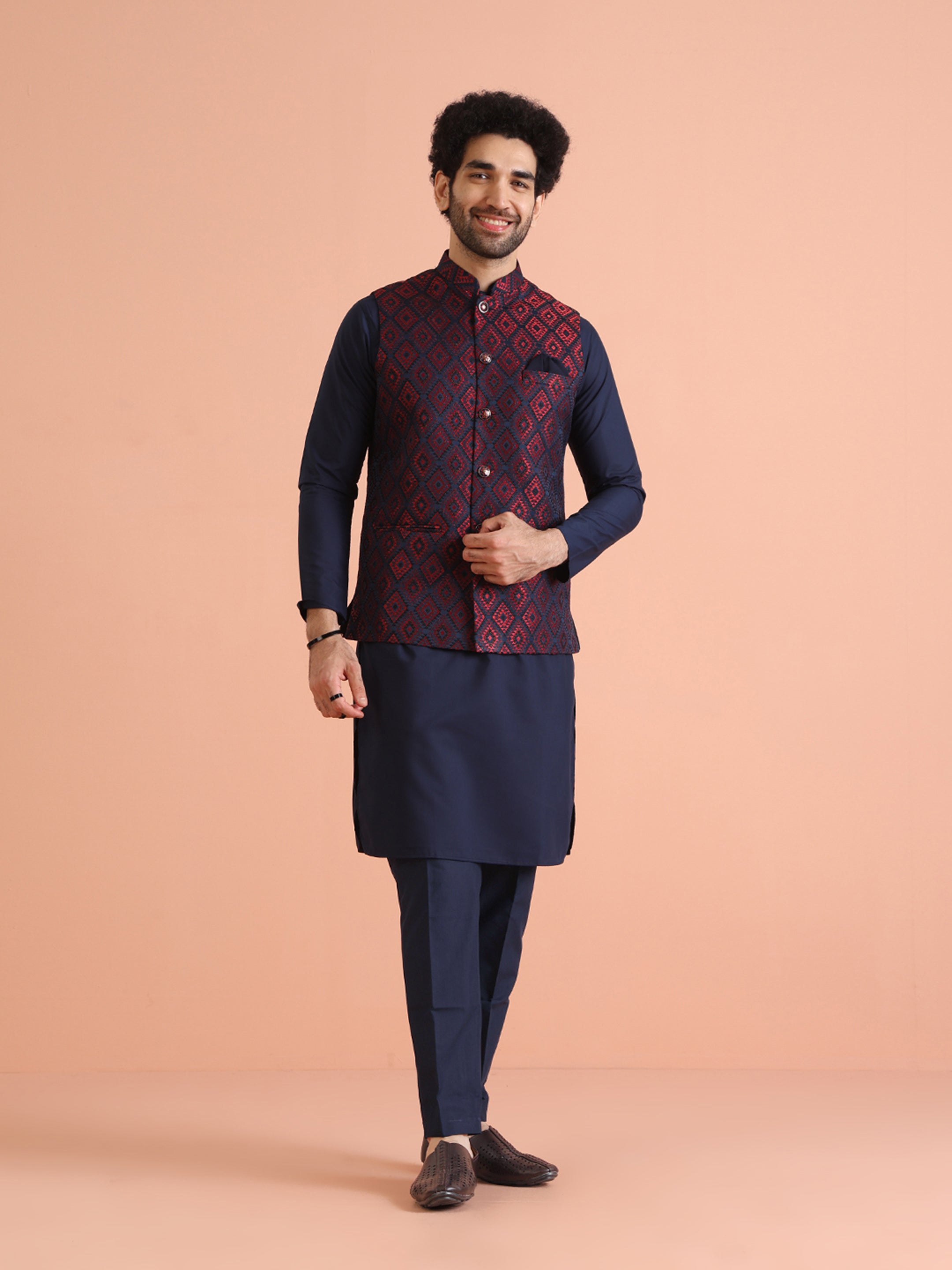 Experience classic elegance with this Men's Navy Blue Color Silk Blend Kurta Jacket Trouser Set. The Jacquard Pattern adds a refined touch, while the breathable fabric ensures comfort throughout the day. Ideal for festive events or casual wear, this Kurta Jacket Trouser Set is a wardrobe essential.