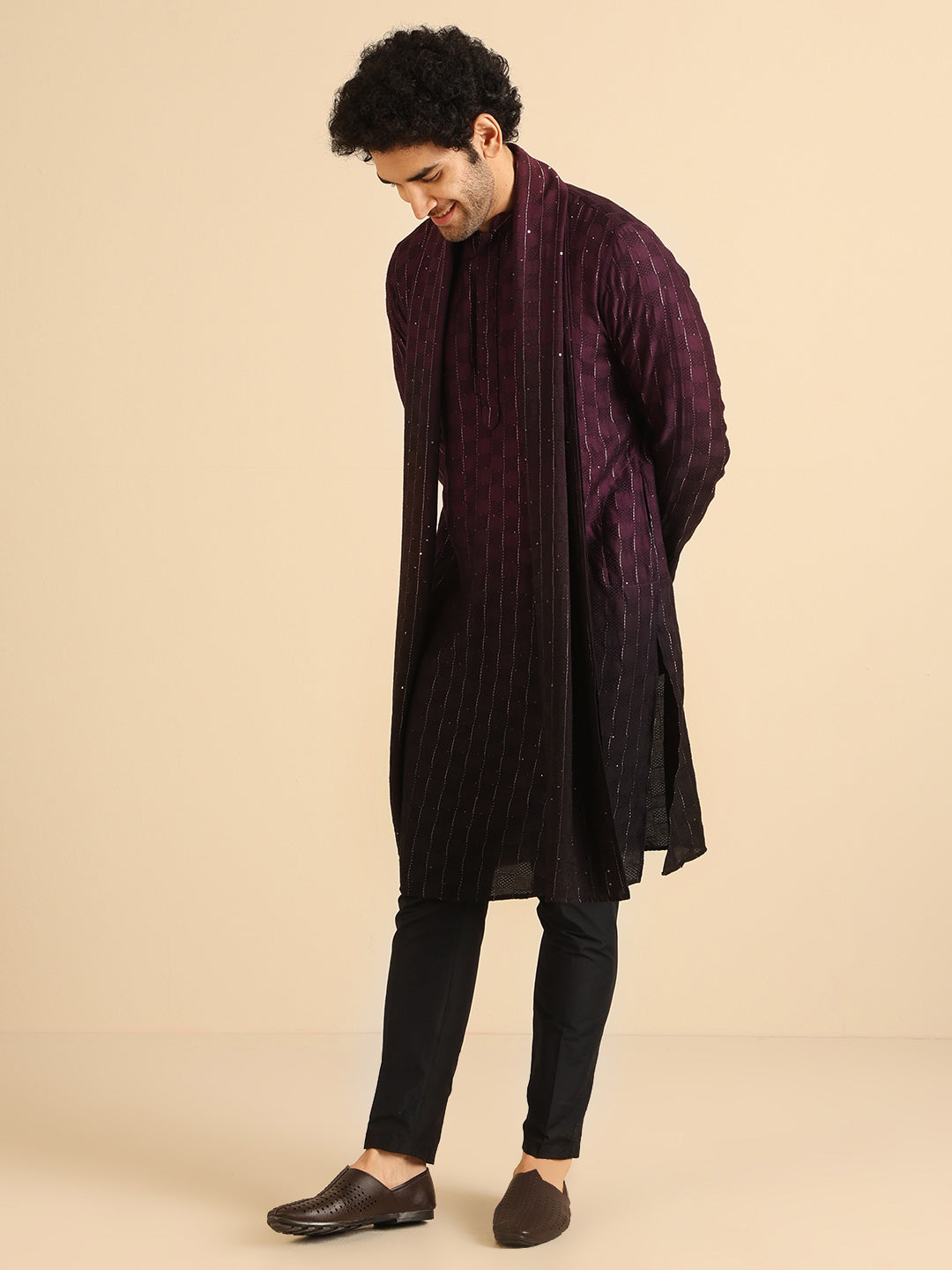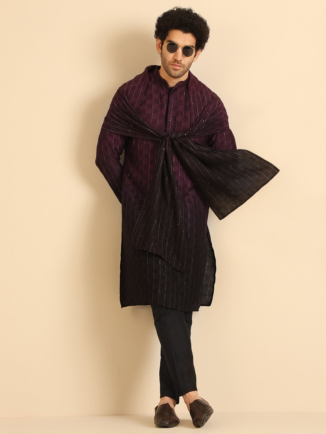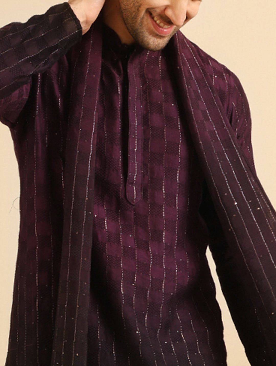 Experience classic elegance with this Men's Purple Color Cotton Blend Kurta Trousers Set. The Sequinned Pattern adds a refined touch, while the breathable fabric ensures comfort throughout the day. Ideal for festive events or casual wear, this Kurta Trouser Set is a wardrobe essential.
