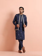 Navy Blue Poly Silk Embroidered Kurta Front Open Jacket Trouser Set, Perfect festive ethnic wear for men, ideal festive and casual occasions.
