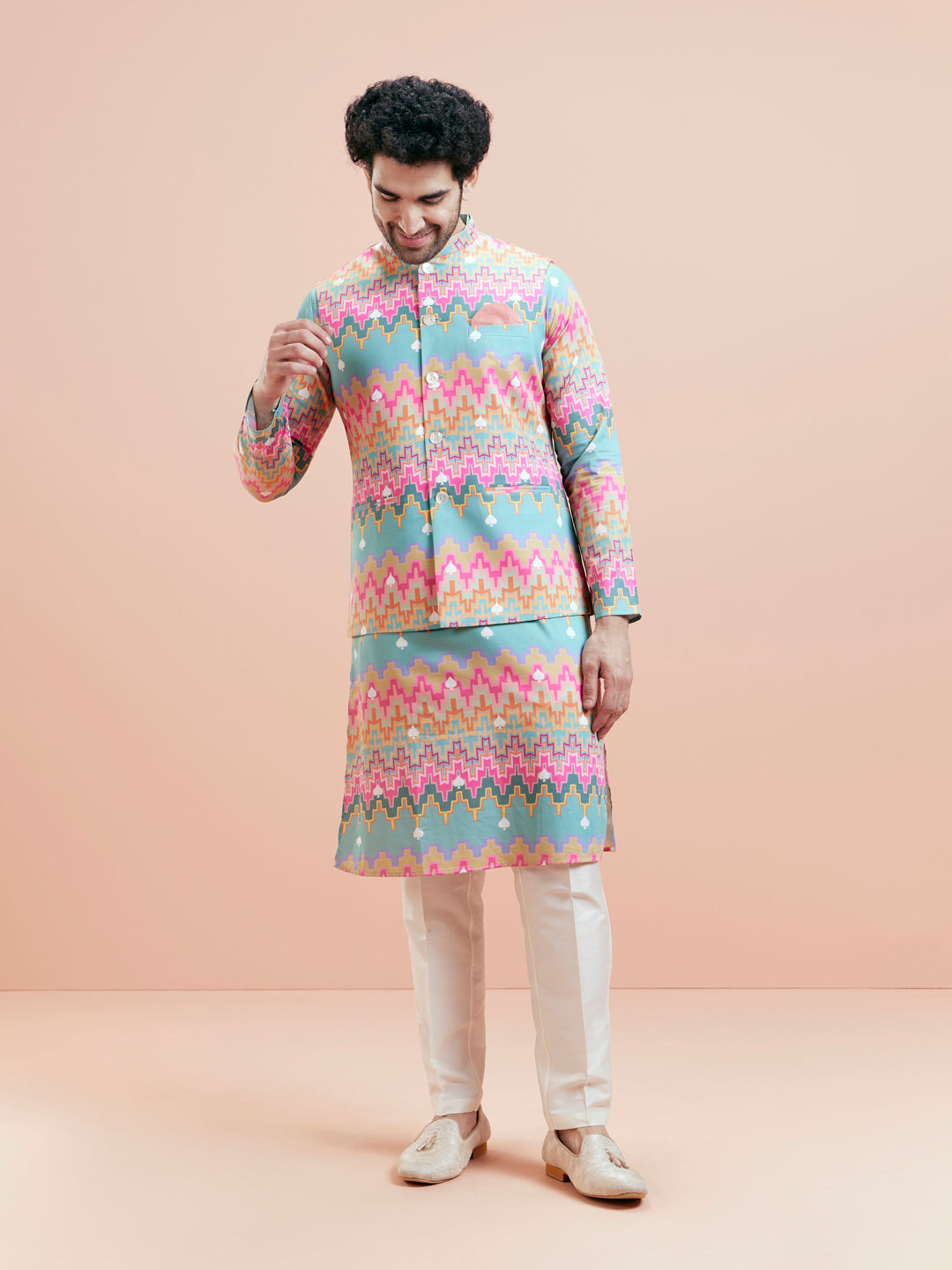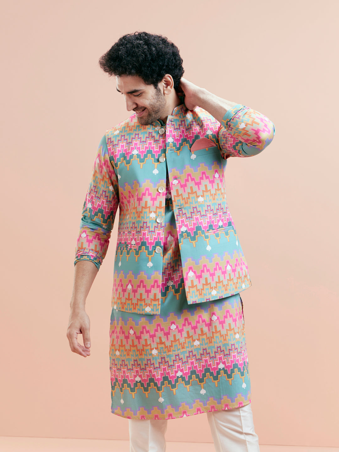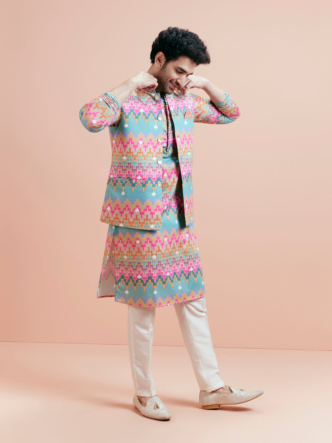 This vibrant multicolor Kurta Jacket Trouser Set from Kisah is crafted in breathable cotton blend. The printed Nehru jacket adds flair to the knee-length kurta and straight trousers. Designed for festive occasions like Diwali, Mehendi or Puja, this set brings together traditional charm with modern styling.