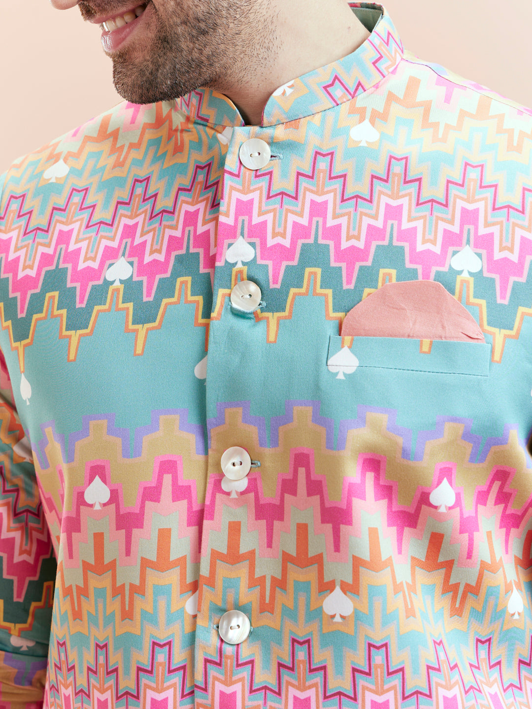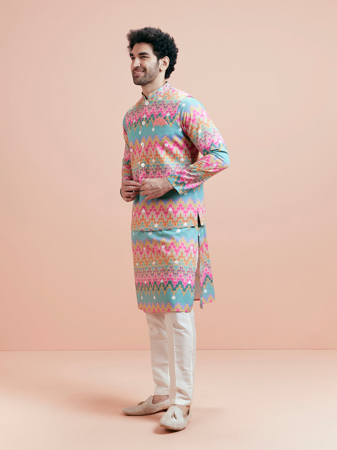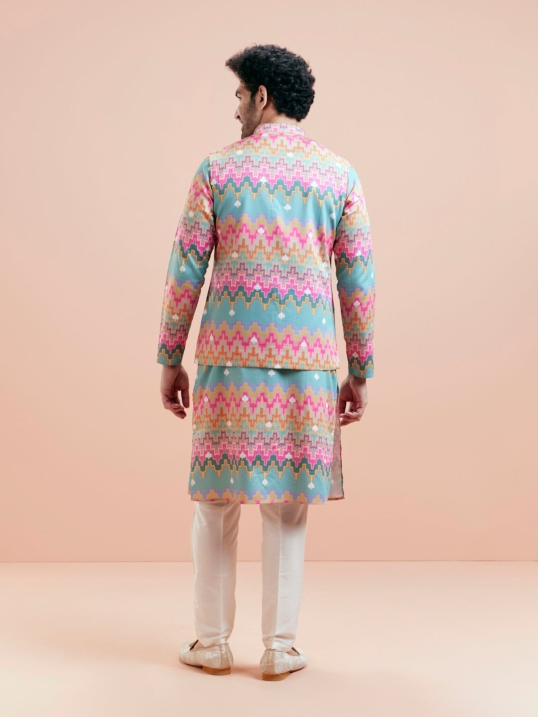 This vibrant multicolor Kurta Jacket Trouser Set from Kisah is crafted in breathable cotton blend. The printed Nehru jacket adds flair to the knee-length kurta and straight trousers. Designed for festive occasions like Diwali, Mehendi or Puja, this set brings together traditional charm with modern styling.
