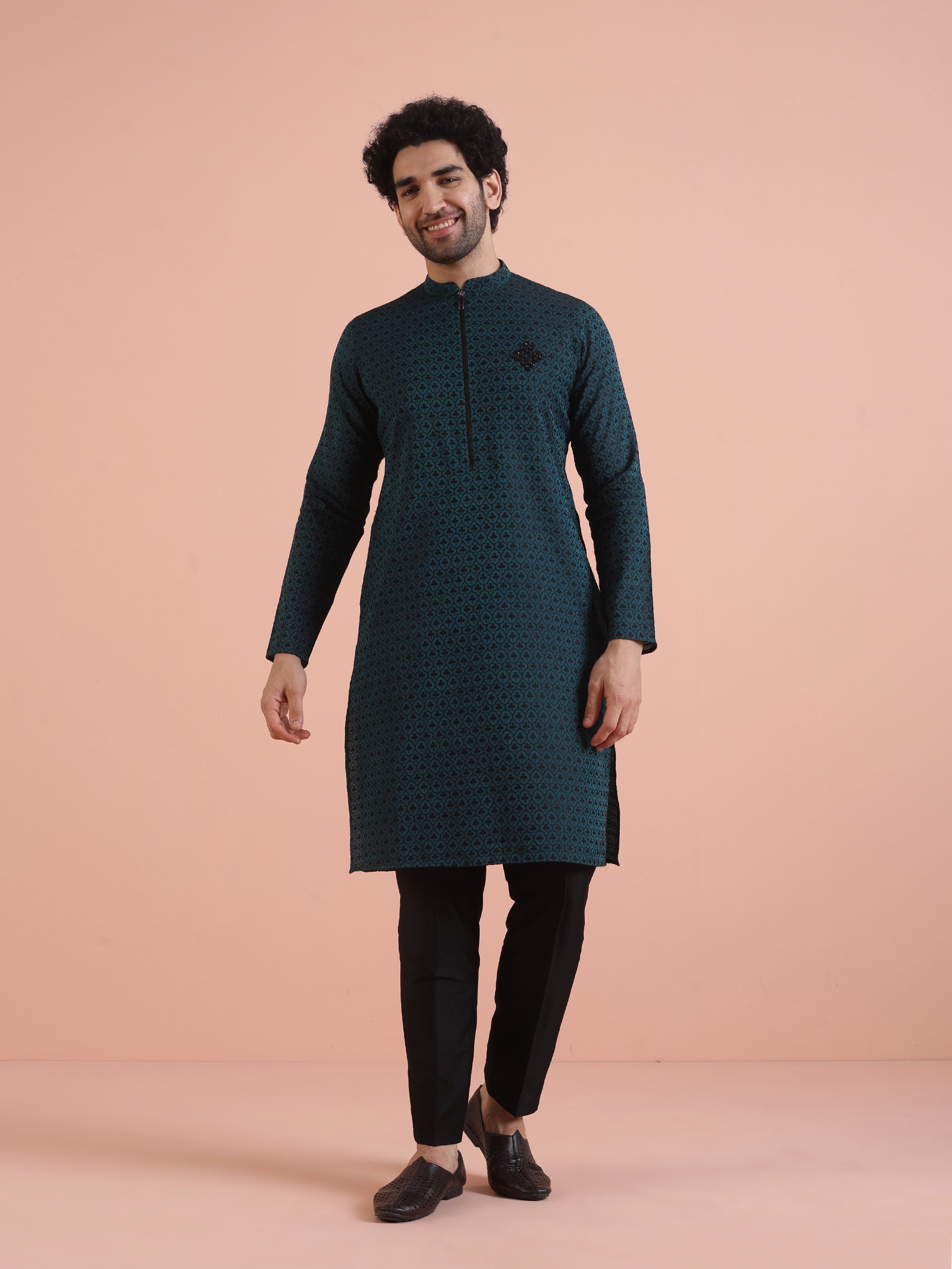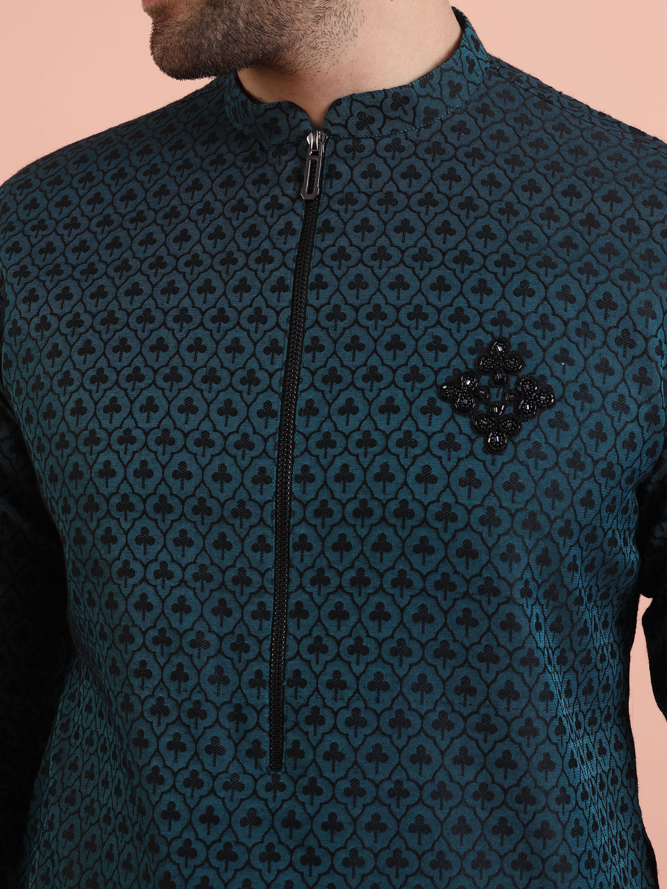 Experience classic elegance with this Men Teal Jacquard Patch Work Kurta Trouser Set. The Jacquard Pattern adds a refined touch, while the breathable Silk Blend fabric ensures comfort throughout the day. Ideal for festive events or casual wear, this Kurta Trouser Set is a wardrobe essential..