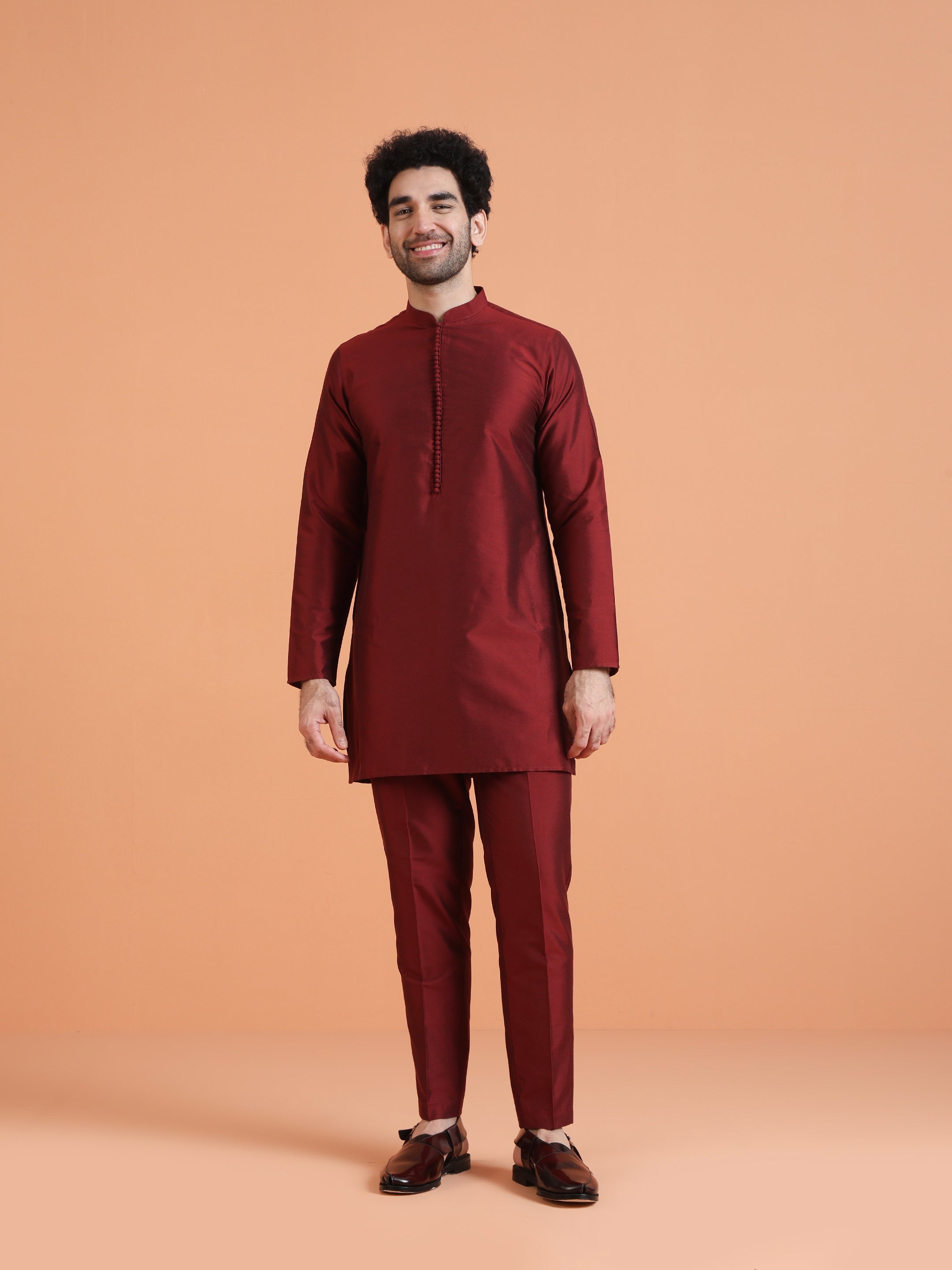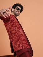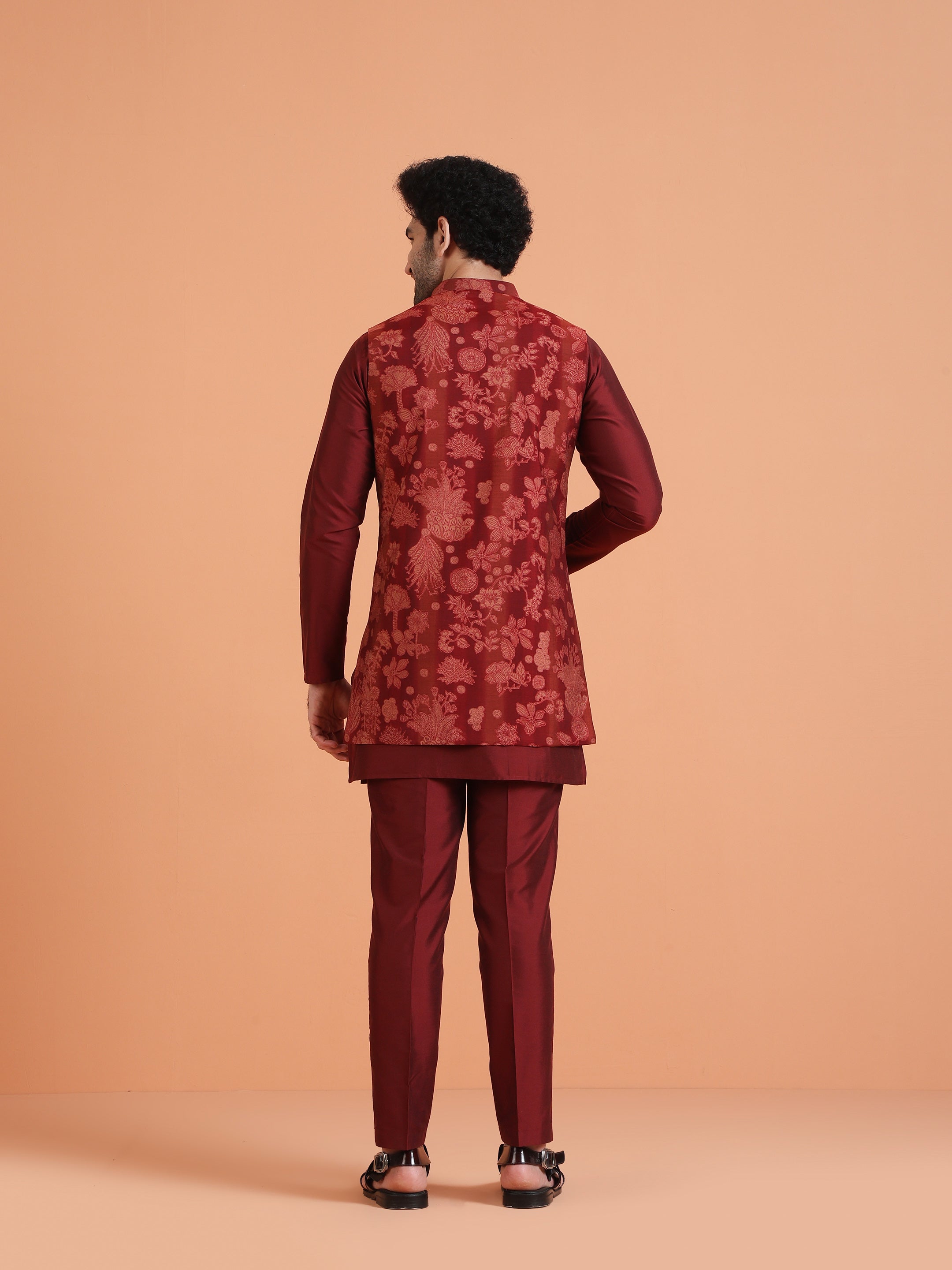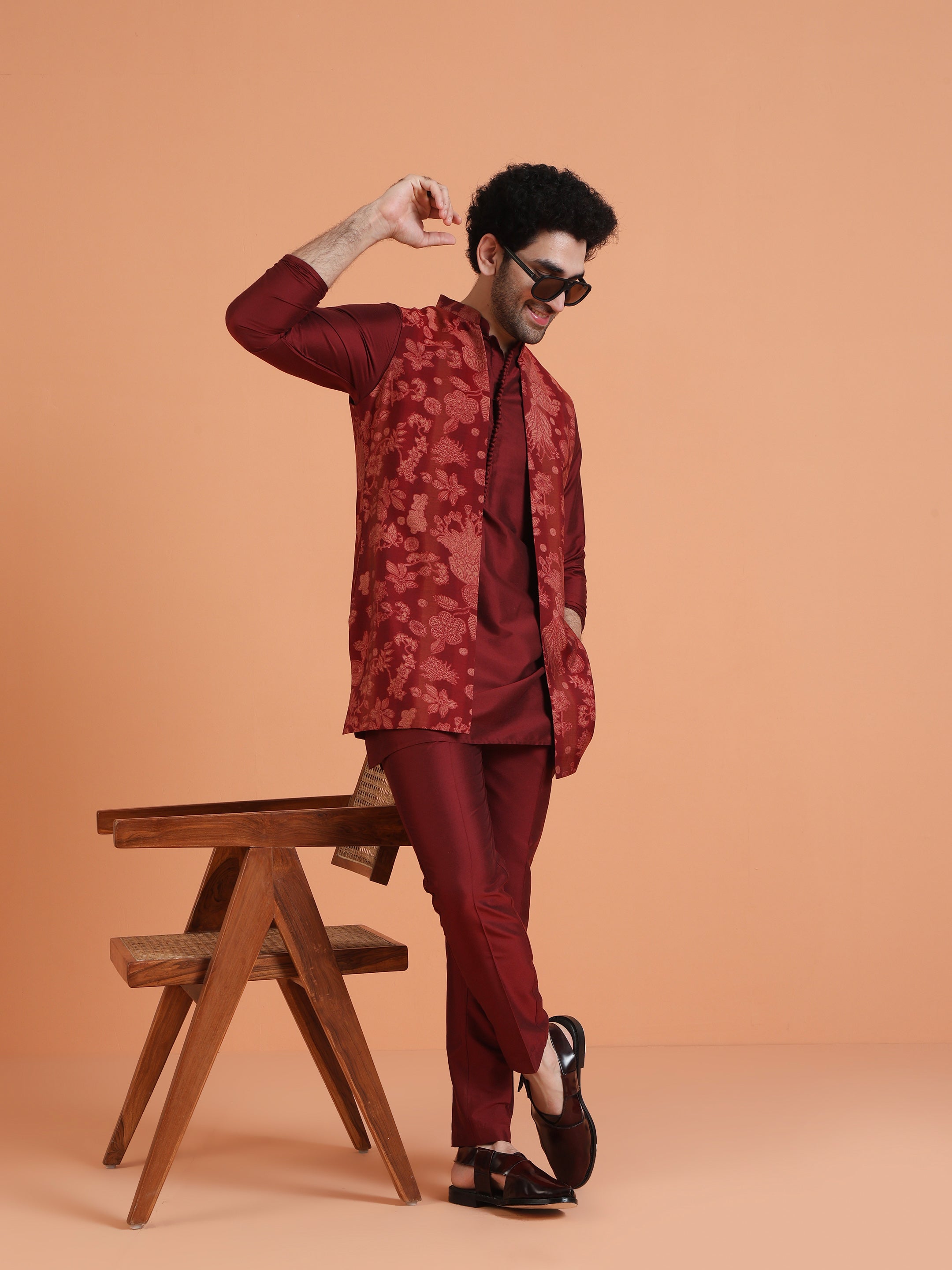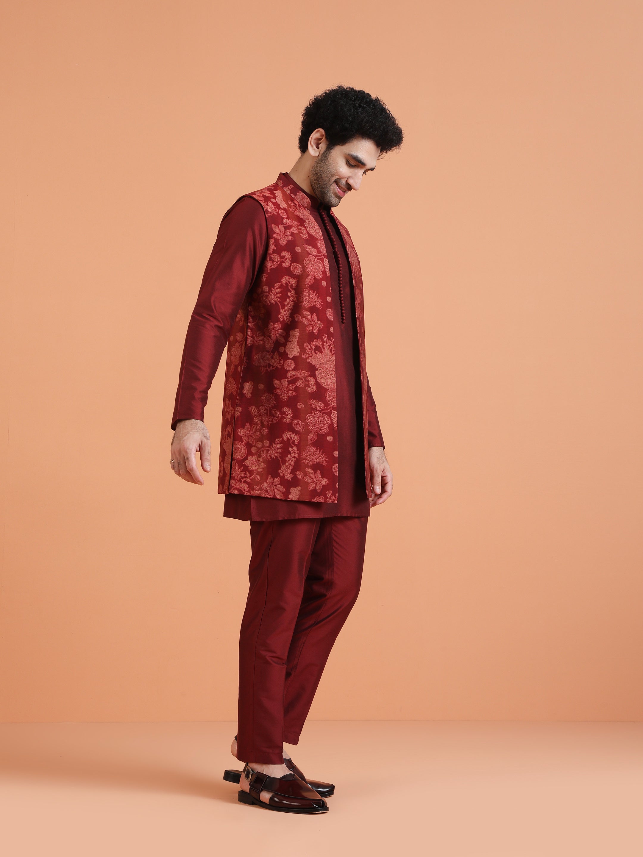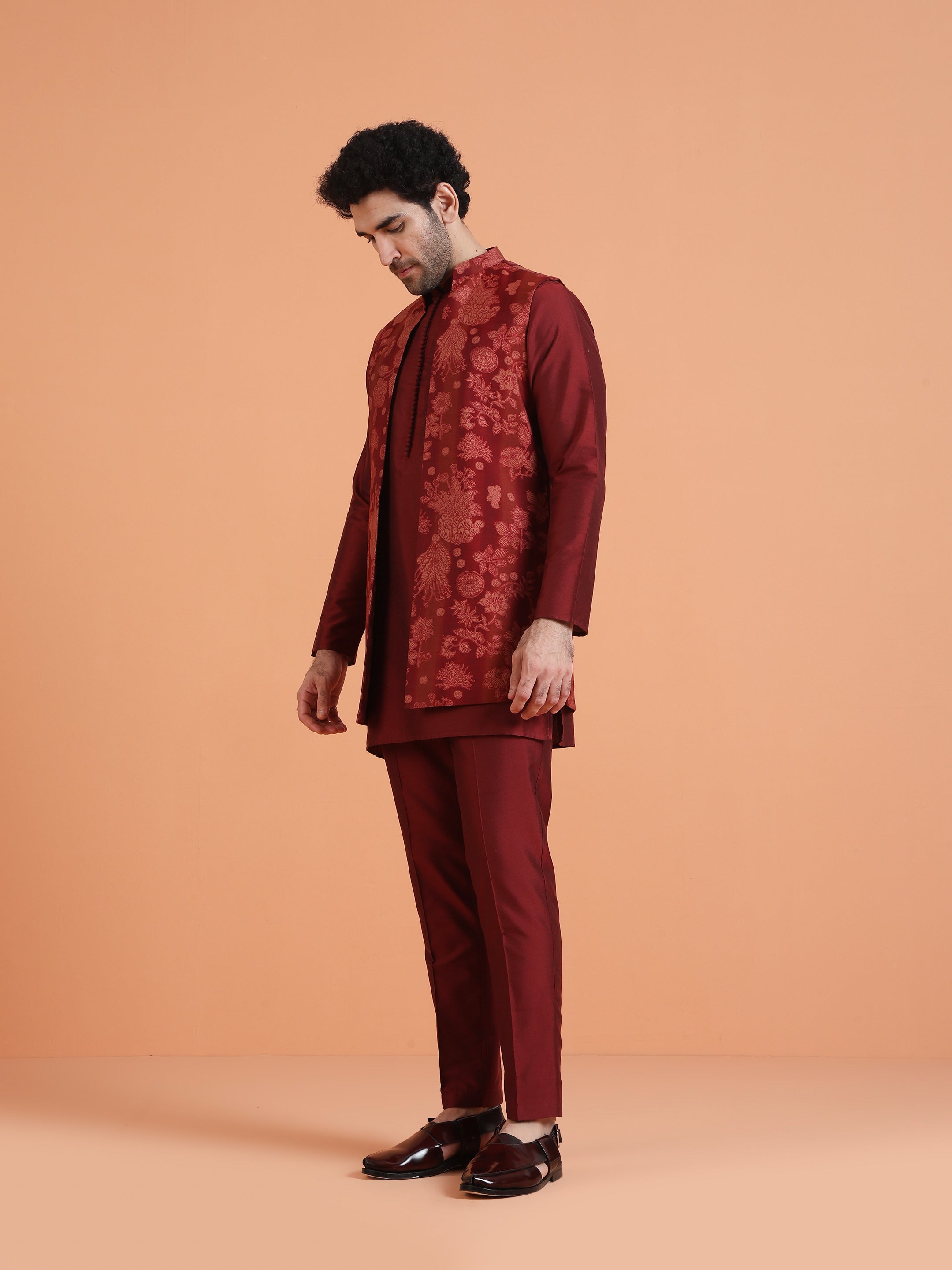 Maroon silk blend kurta trouser set with floral jacquard long jacket. Perfect festive outfit for weddings, sangeet & cocktail occasions.