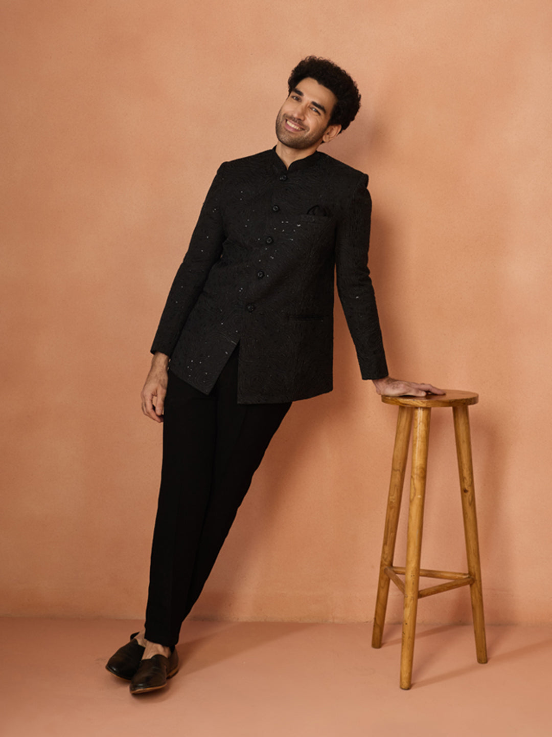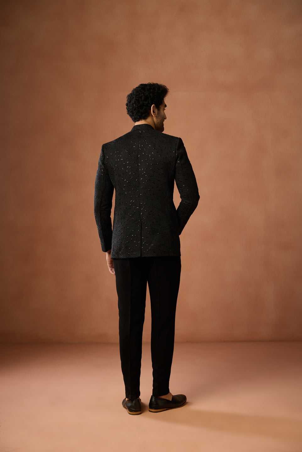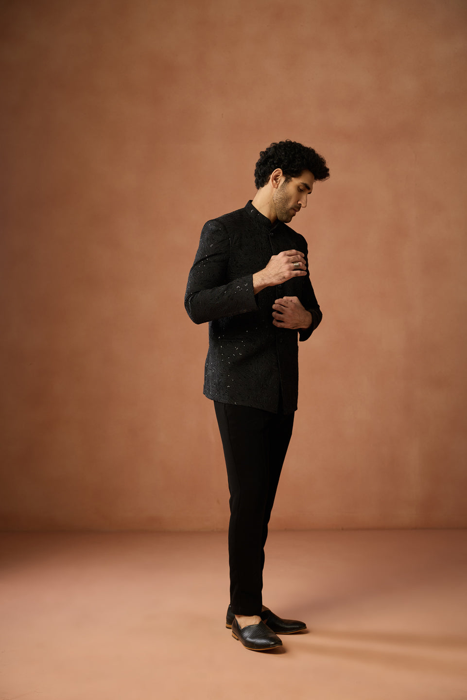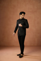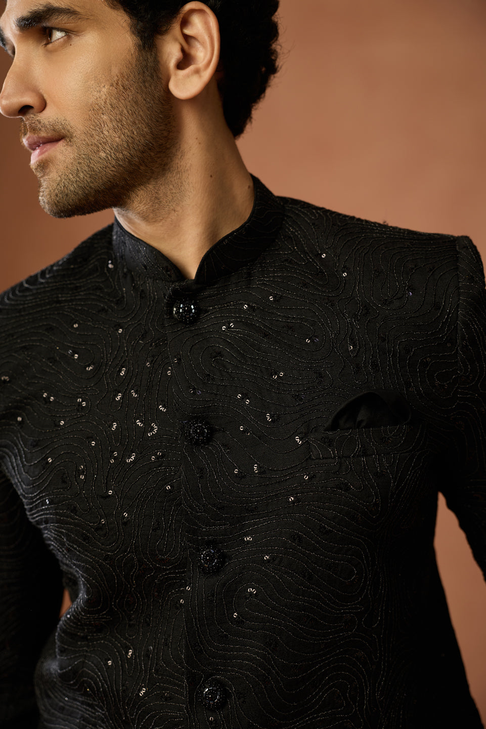 Black Silk Textured Embroidered Bandhgala Trouser Set