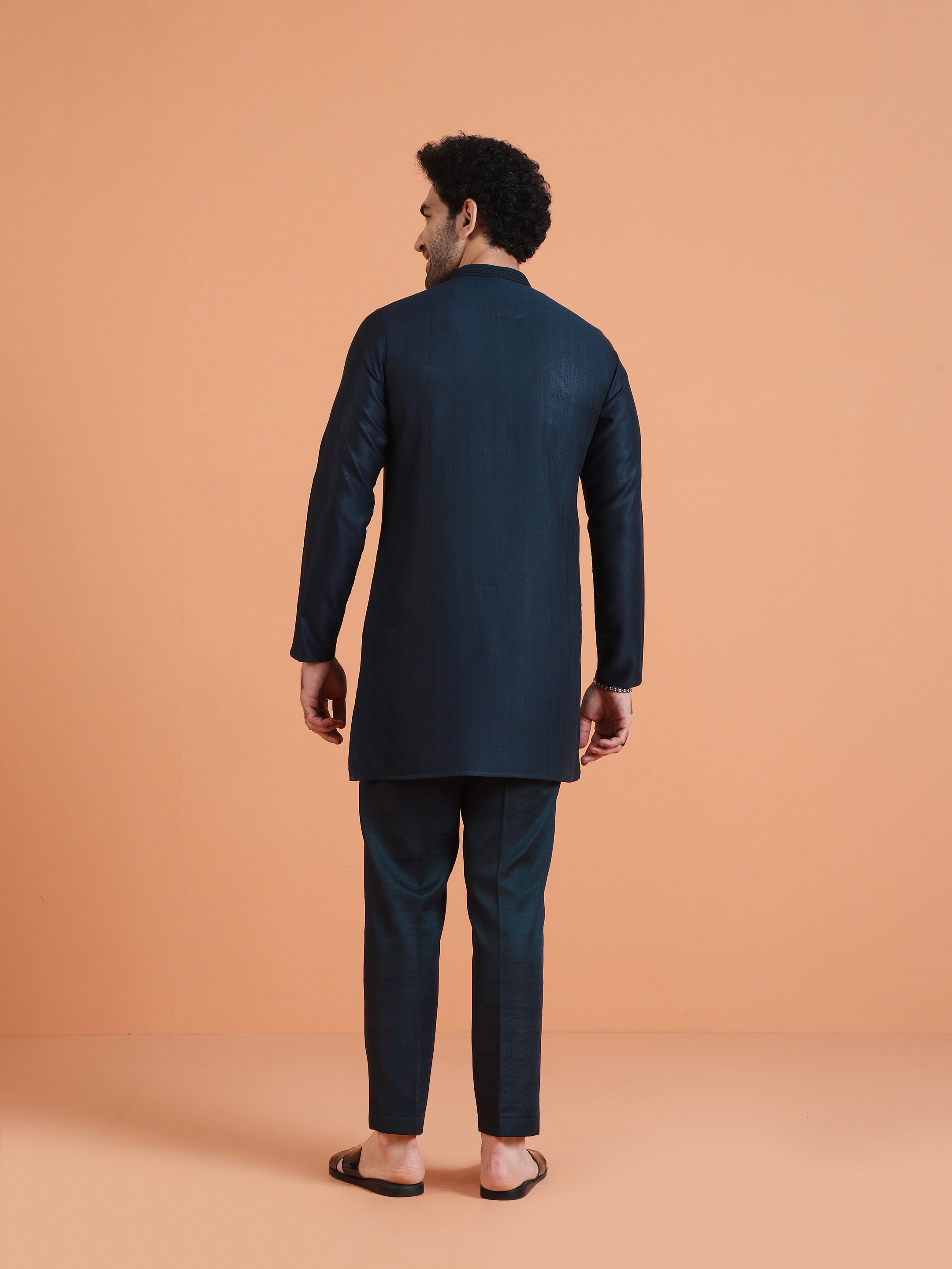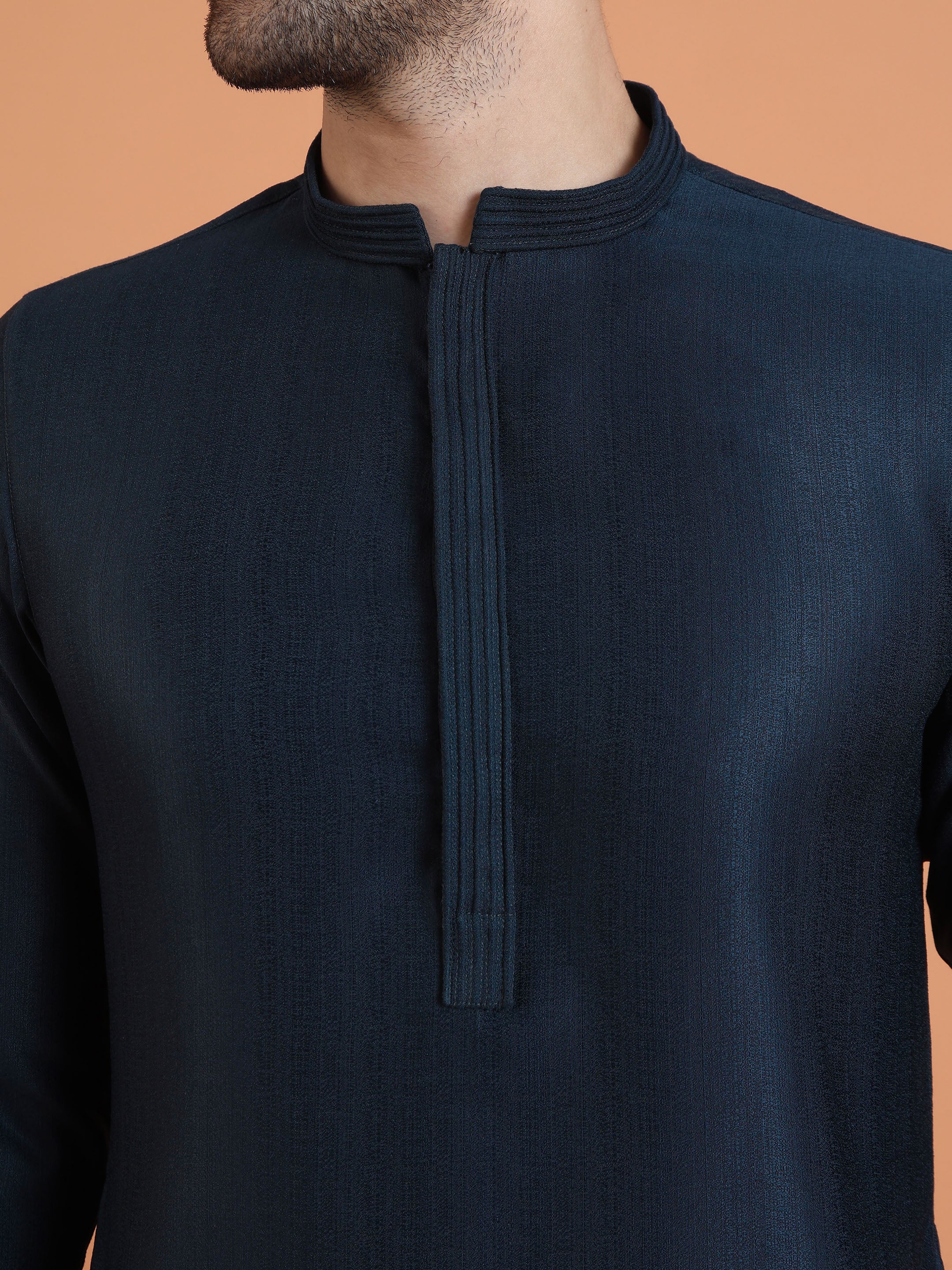 Navy blue silk blend mid kurta with textured solid design. Perfect festive ethnic wear for men, ideal for weddings and cultural celebrations.