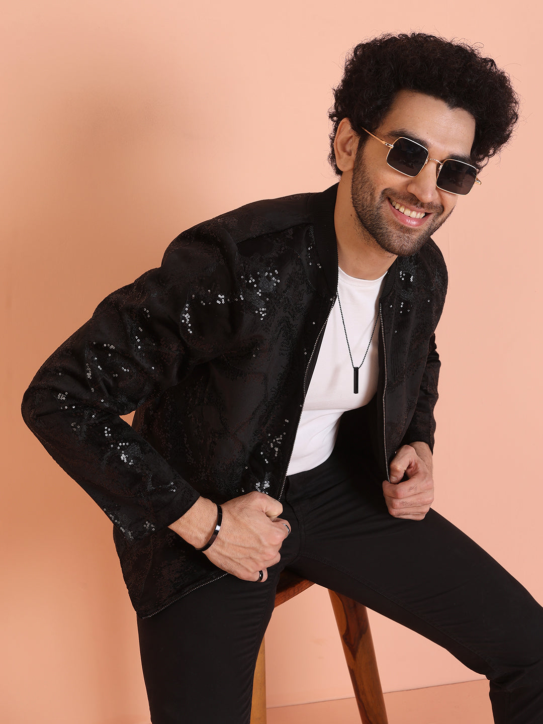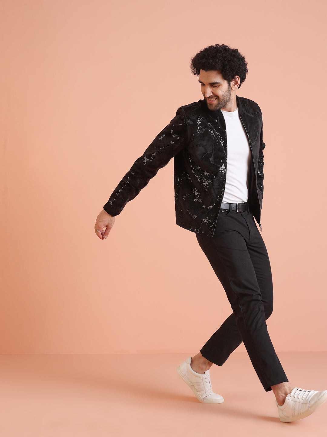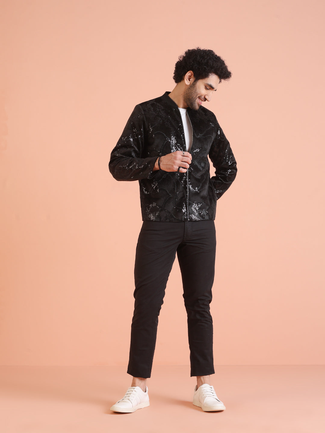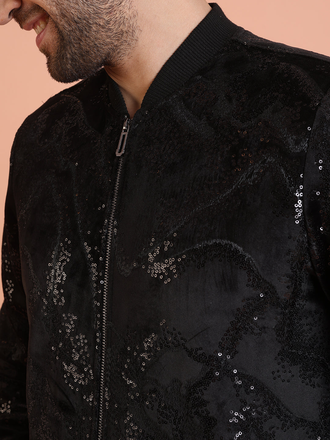 Experience classic elegance with this Men Black Abstract Bomber Jacket with Sequence . The Abstract Pattern adds a refined touch, while the breathable Velvet fabric ensures comfort throughout the day. Ideal for festive events or casual wear, this Bomber Jacket is a wardrobe essential.