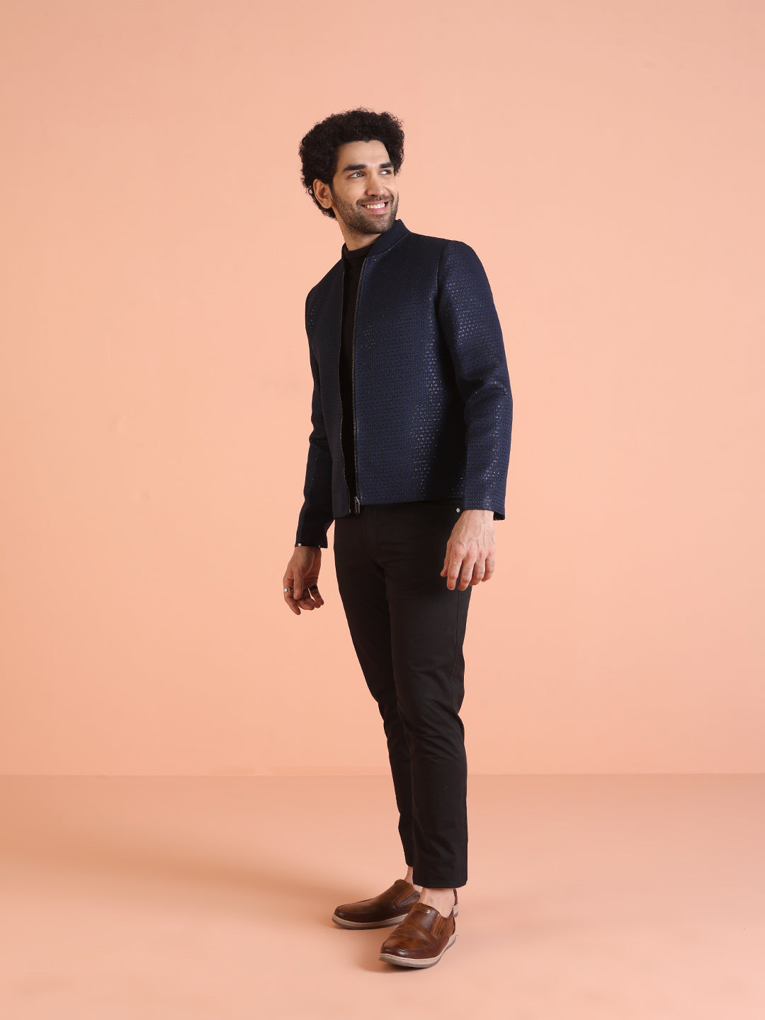 Experience classic elegance with this Men Navy Blue Woven Design Bomber Jacket with Sequence . The Woven Design Pattern adds a refined touch, while the breathable Silk Blend fabric ensures comfort throughout the day. Ideal for festive events or casual wear, this Bomber Jacket is a wardrobe essential.