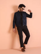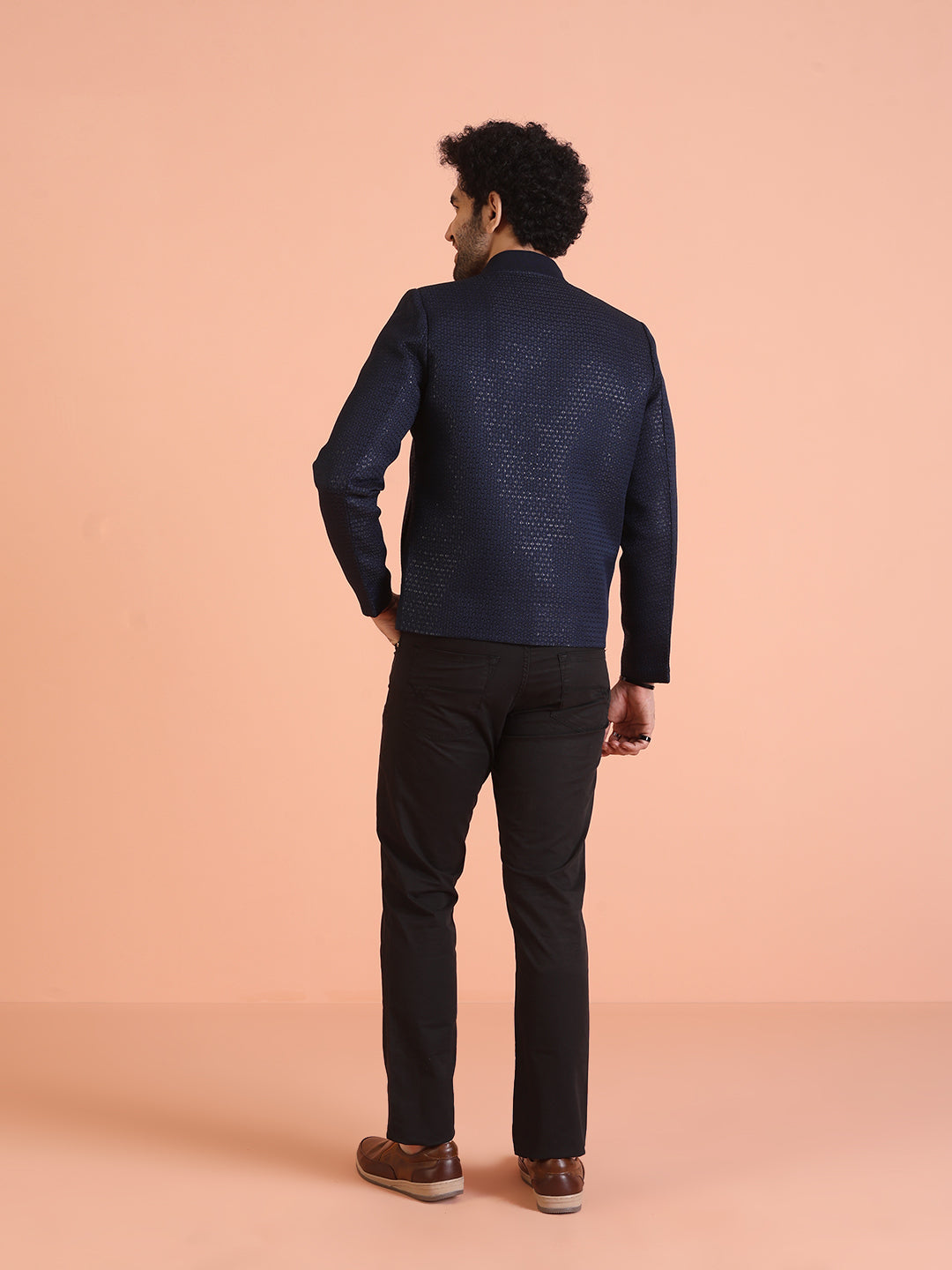 Men Navy Blue Woven Design Bomber Jacket with Sequence