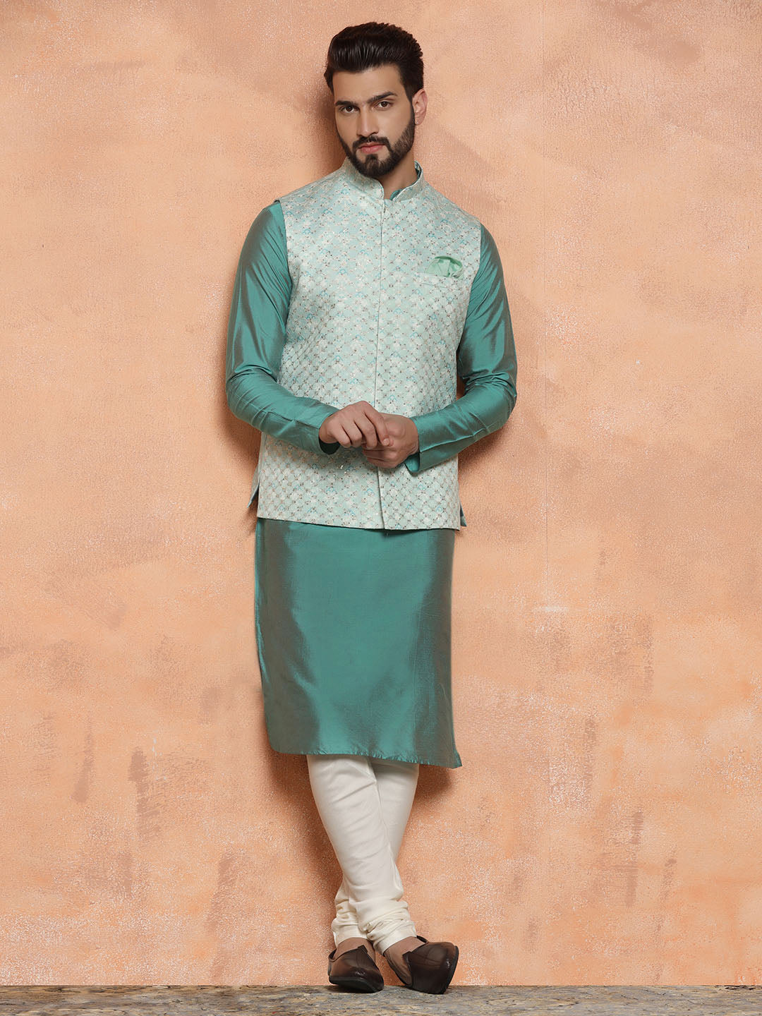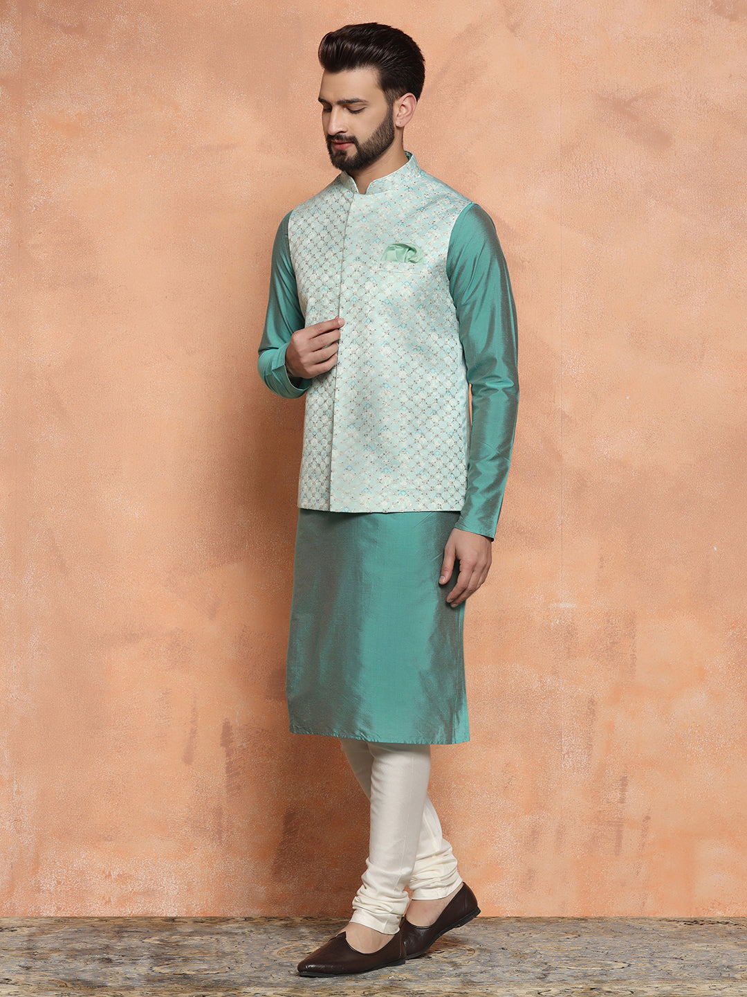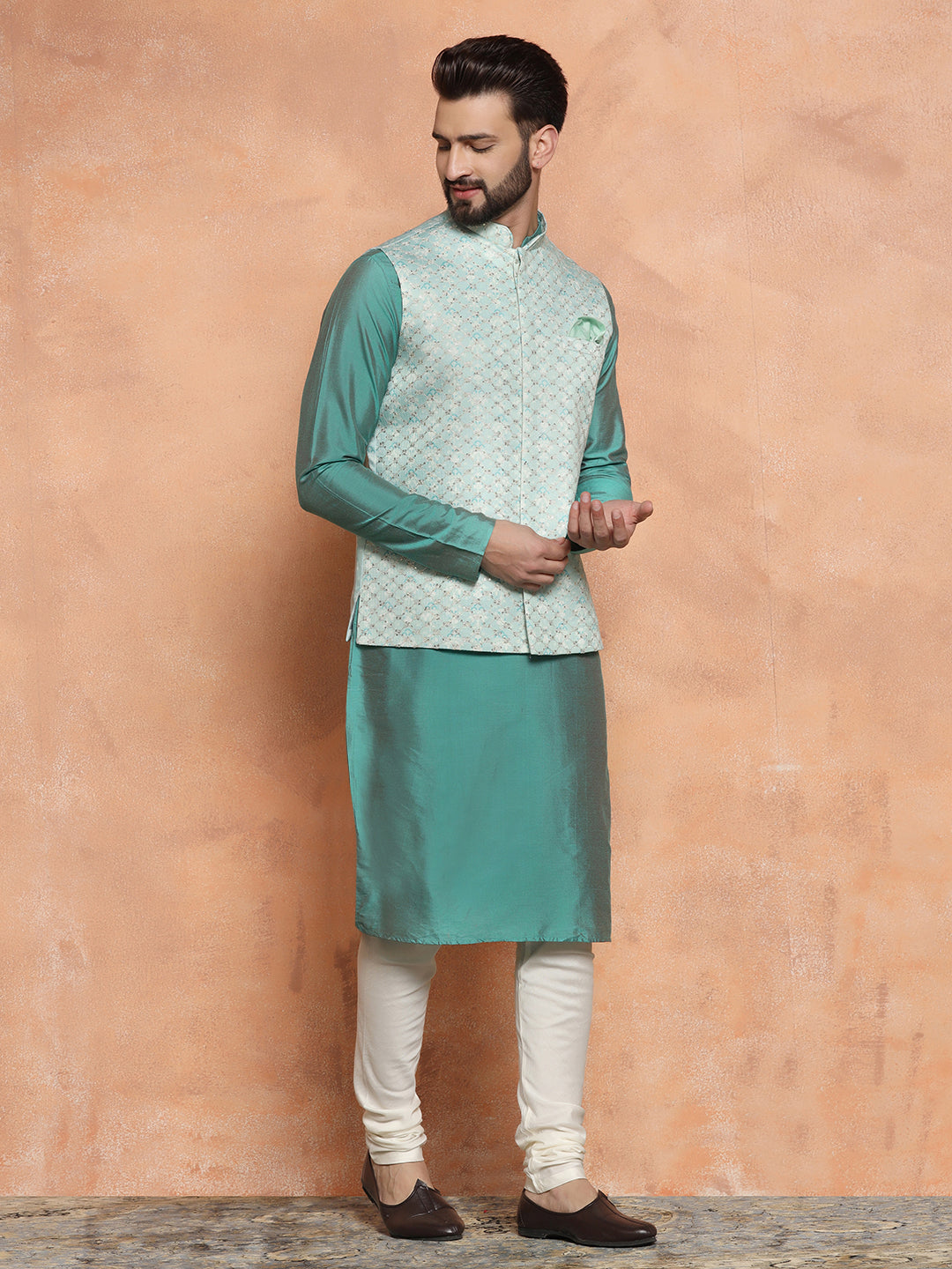 Add a touch of elegance with this light blue silk blend kurta, jacket, and churidar set. Featuring exquisite embroidery and a regular fit, it’s perfect for festive occasions.