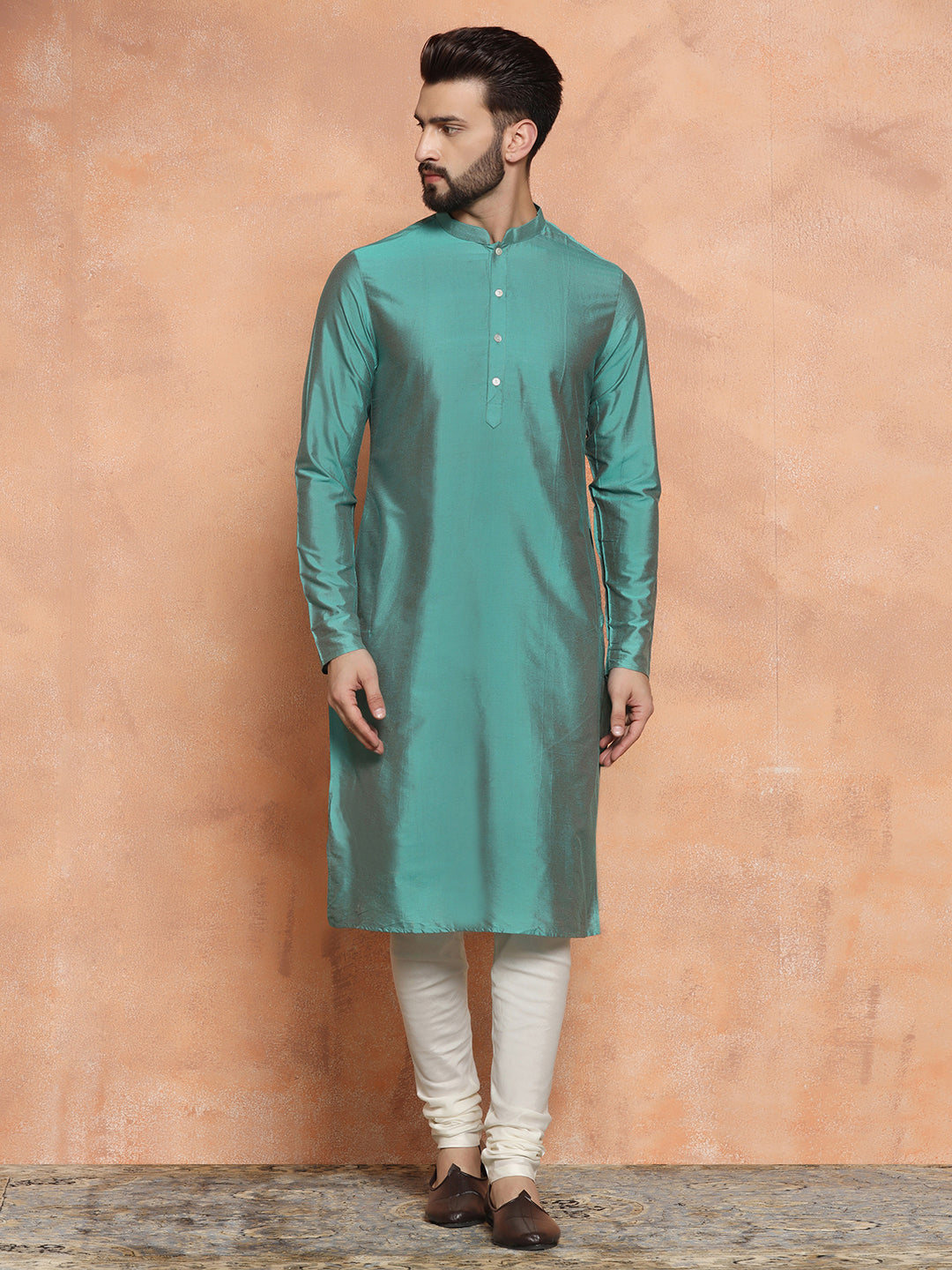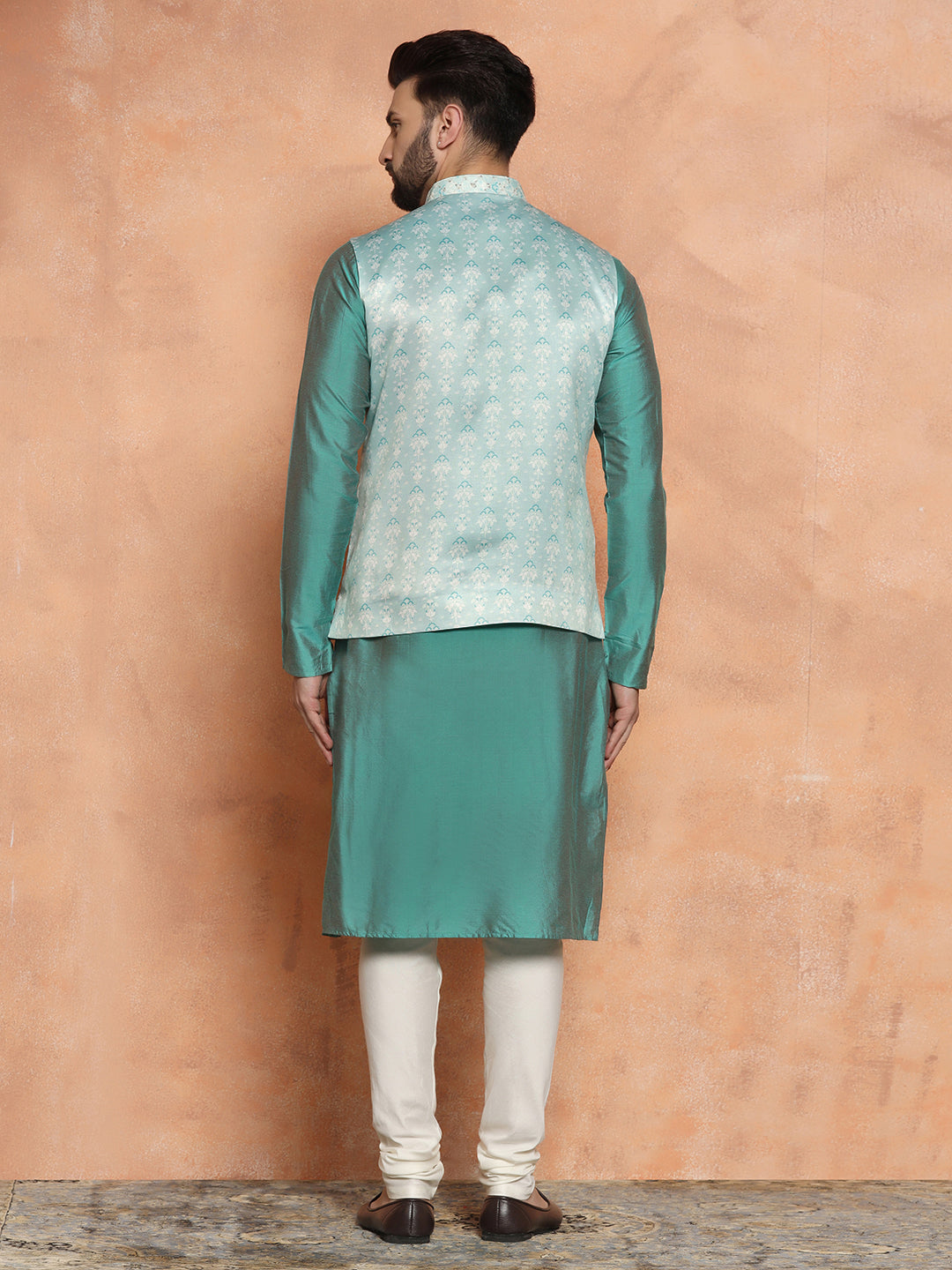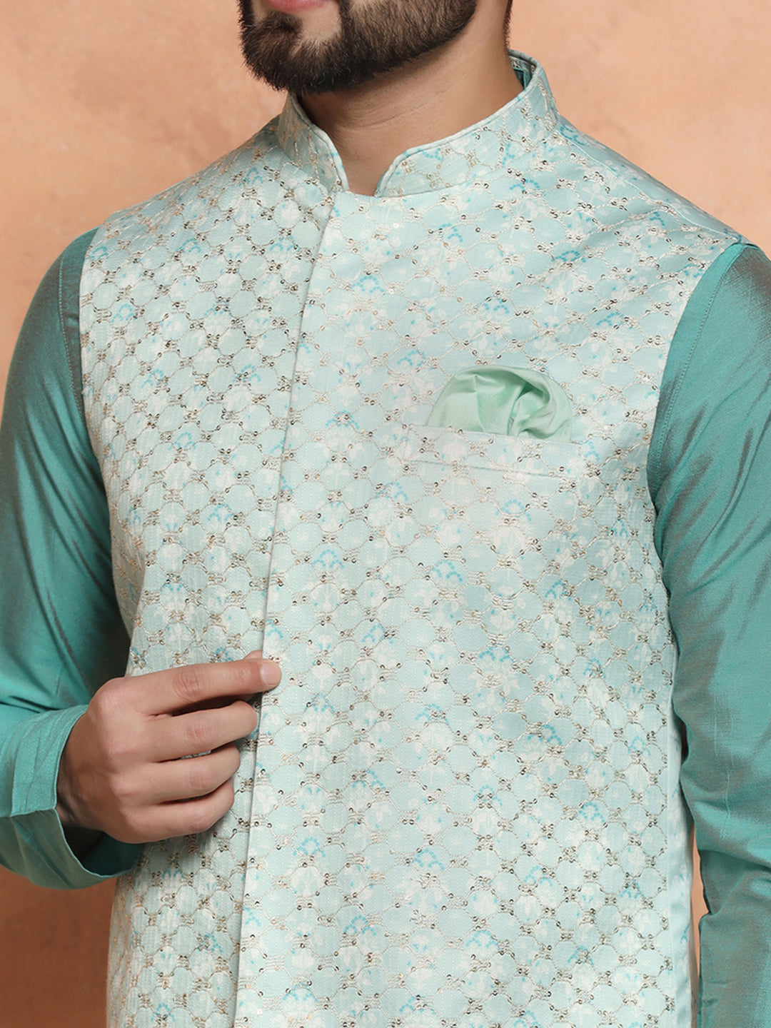 Add a touch of elegance with this light blue silk blend kurta, jacket, and churidar set. Featuring exquisite embroidery and a regular fit, it’s perfect for festive occasions.