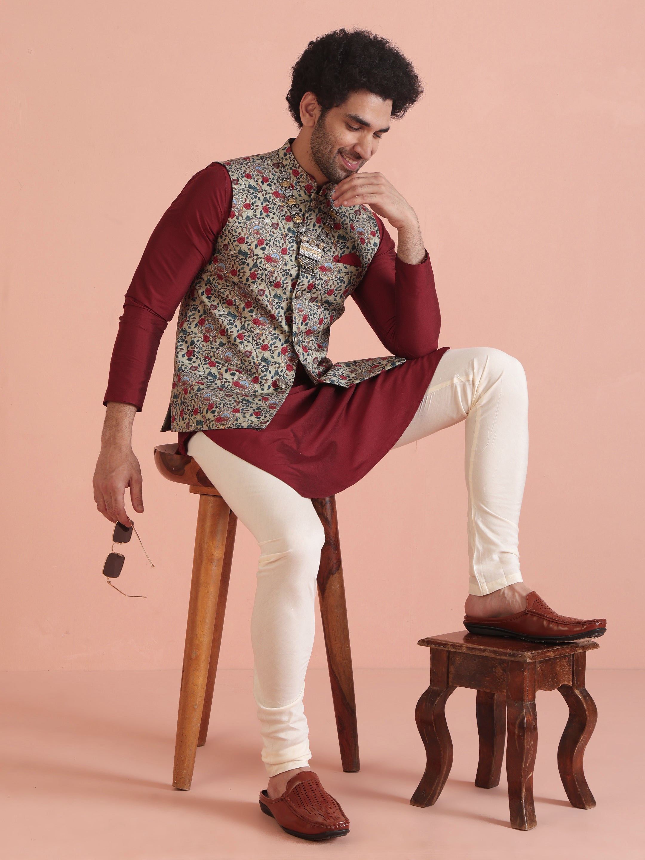 Multi-Coloured Cotton Floral Nehru Jacket Kurta Set