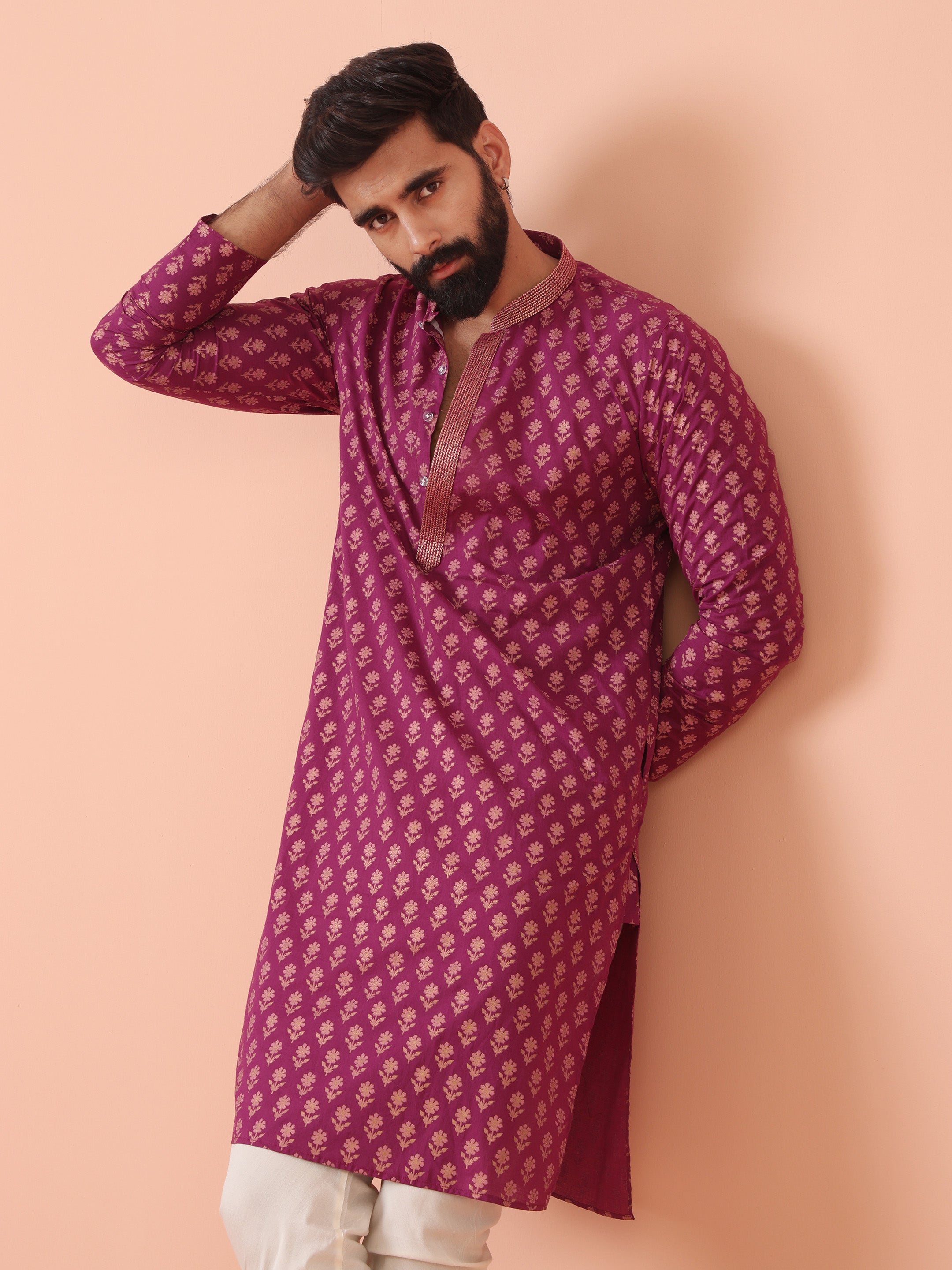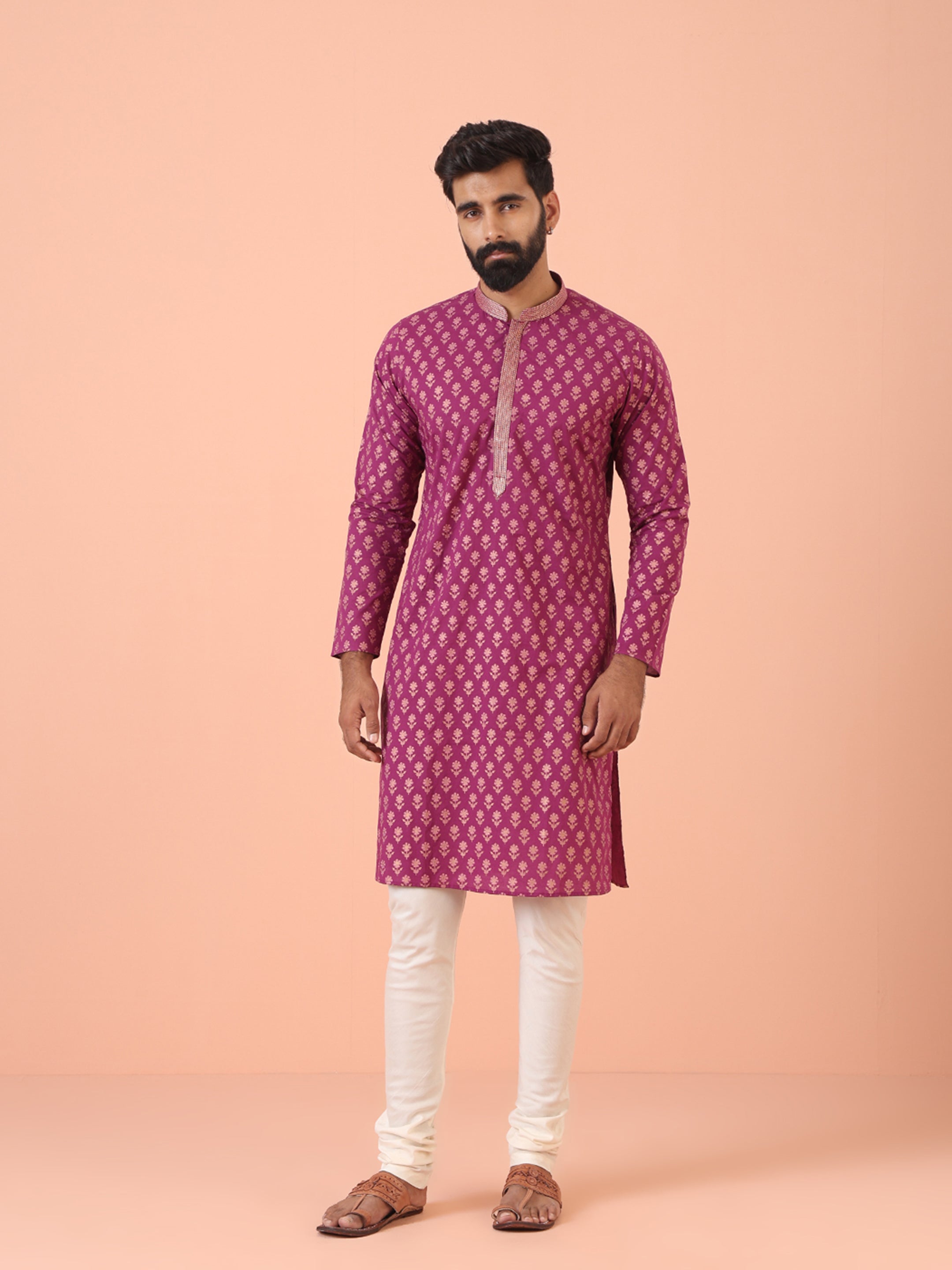 Experience classic elegance with this Men's Pink Color Cotton Blend Kurta Churidar Set. The Floral Pattern adds a refined touch, while the breathable fabric ensures comfort throughout the day. Ideal for festive events or casual wear, this Kurta Trouser Set is a wardrobe essential.