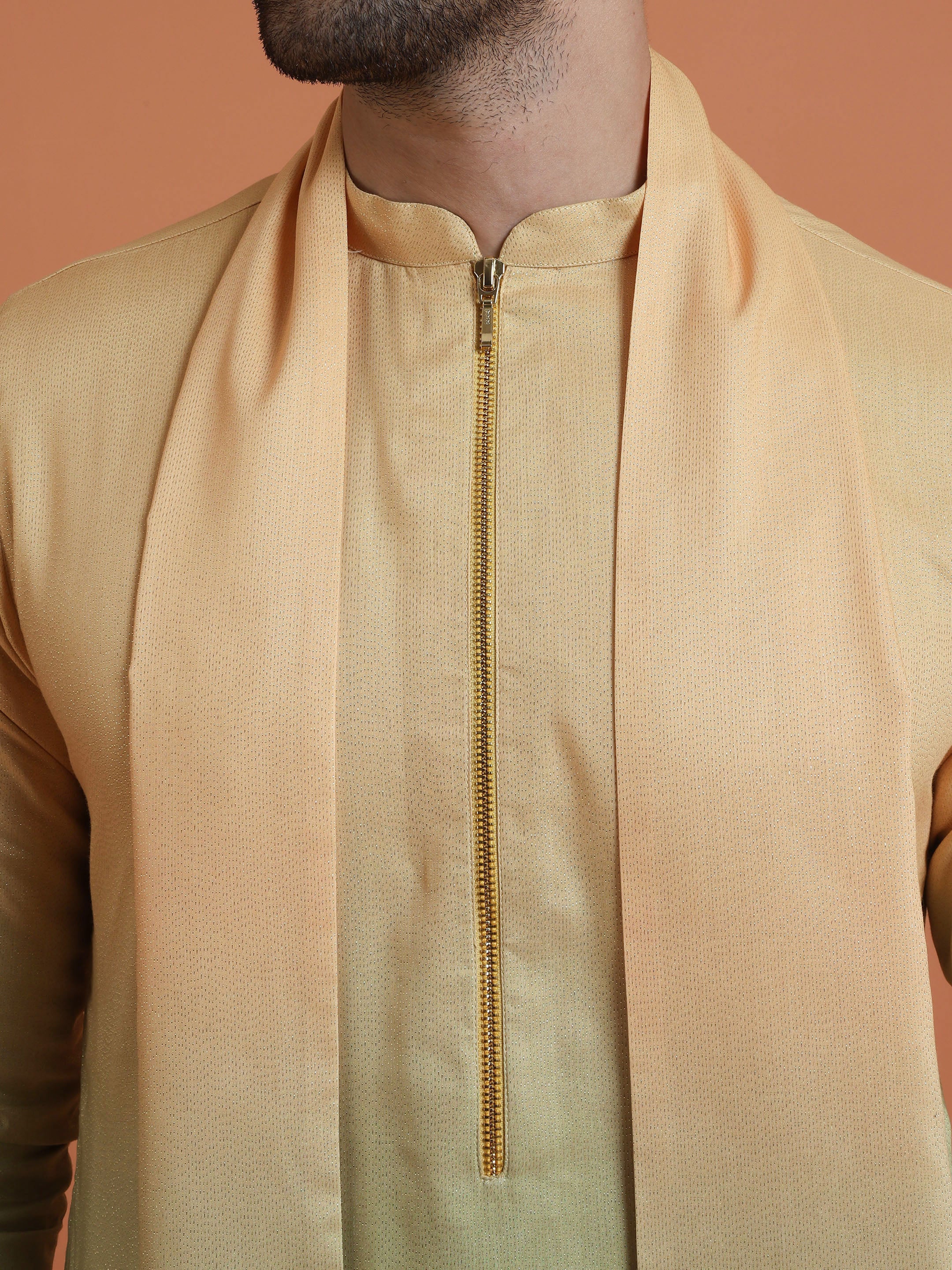 Yellow to green ombre satin kurta with zip, cream trouser, and matching dupatta. A stylish festive set with metallic finish for weddings & celebrations.