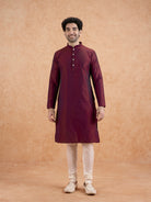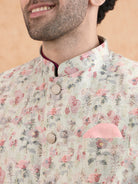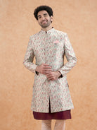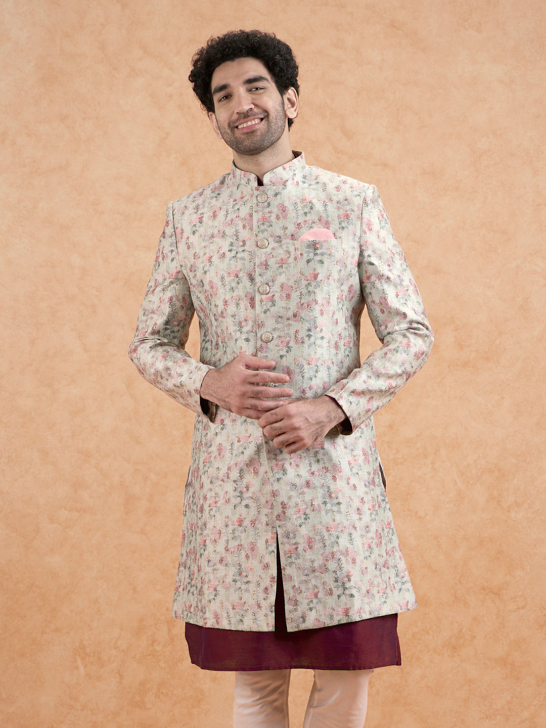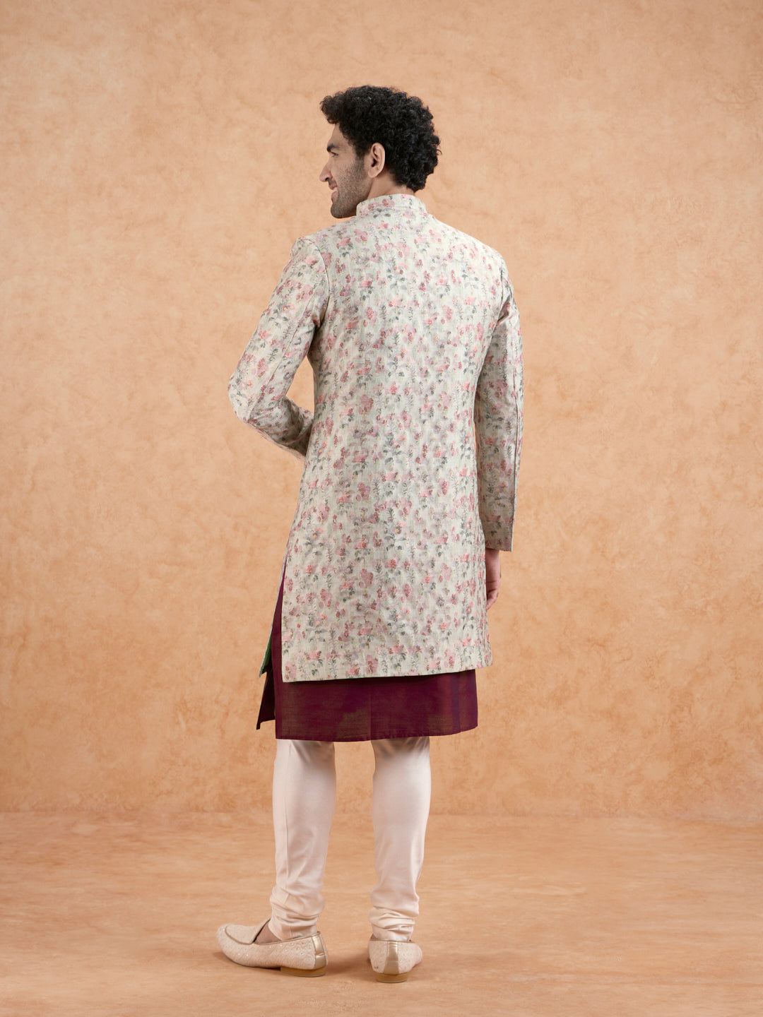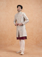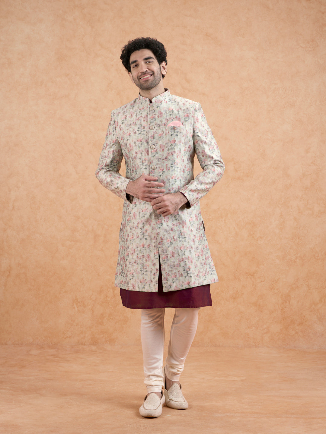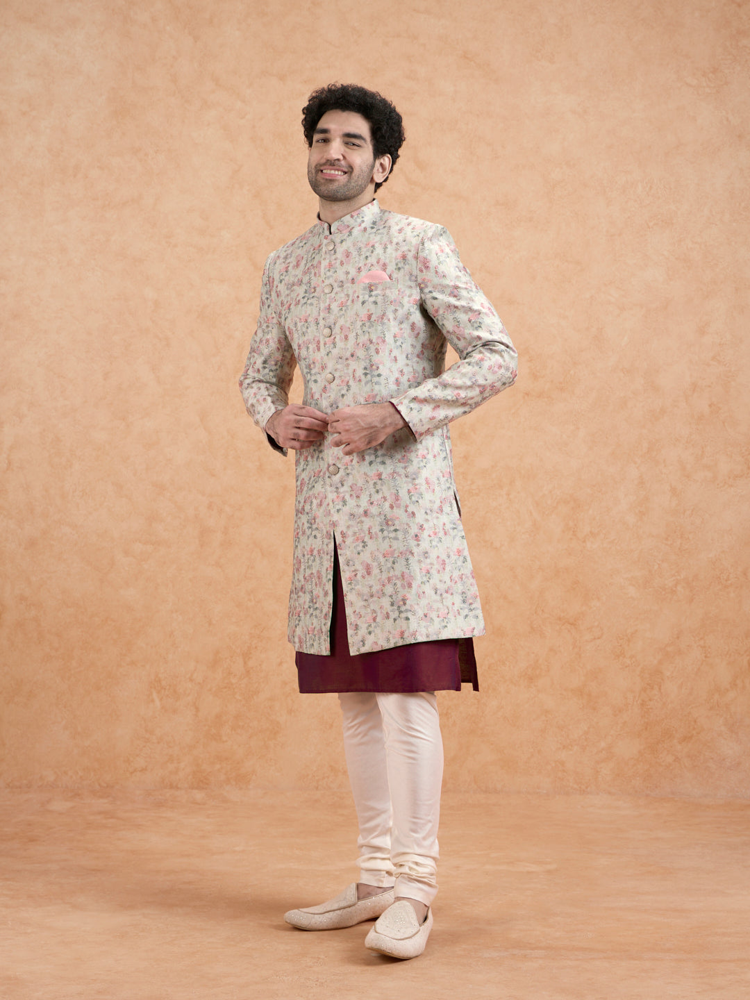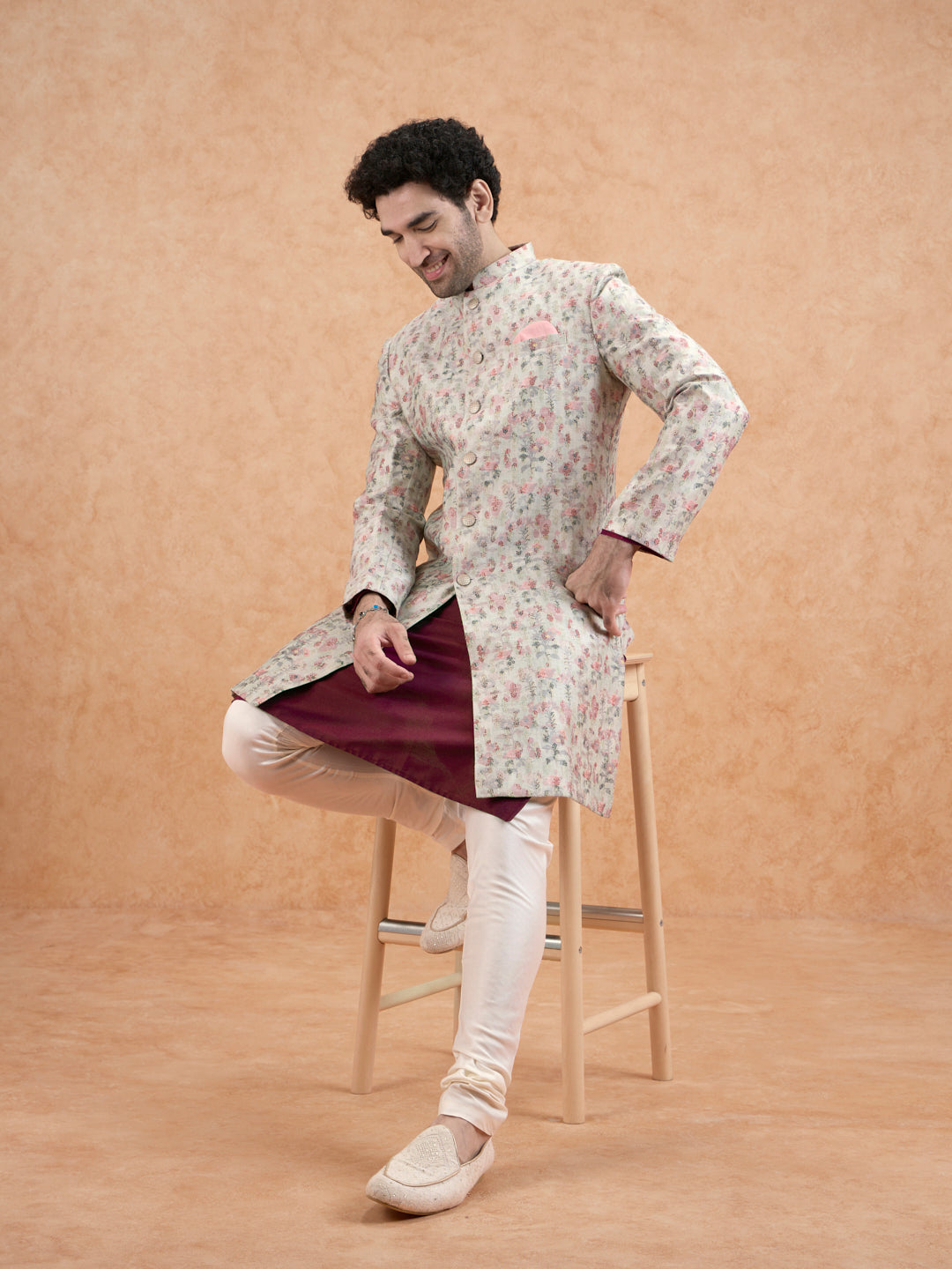 Ivory floral printed sherwani with maroon kurta & churidar elegant, lightweight, and perfect for weddings or festive events.