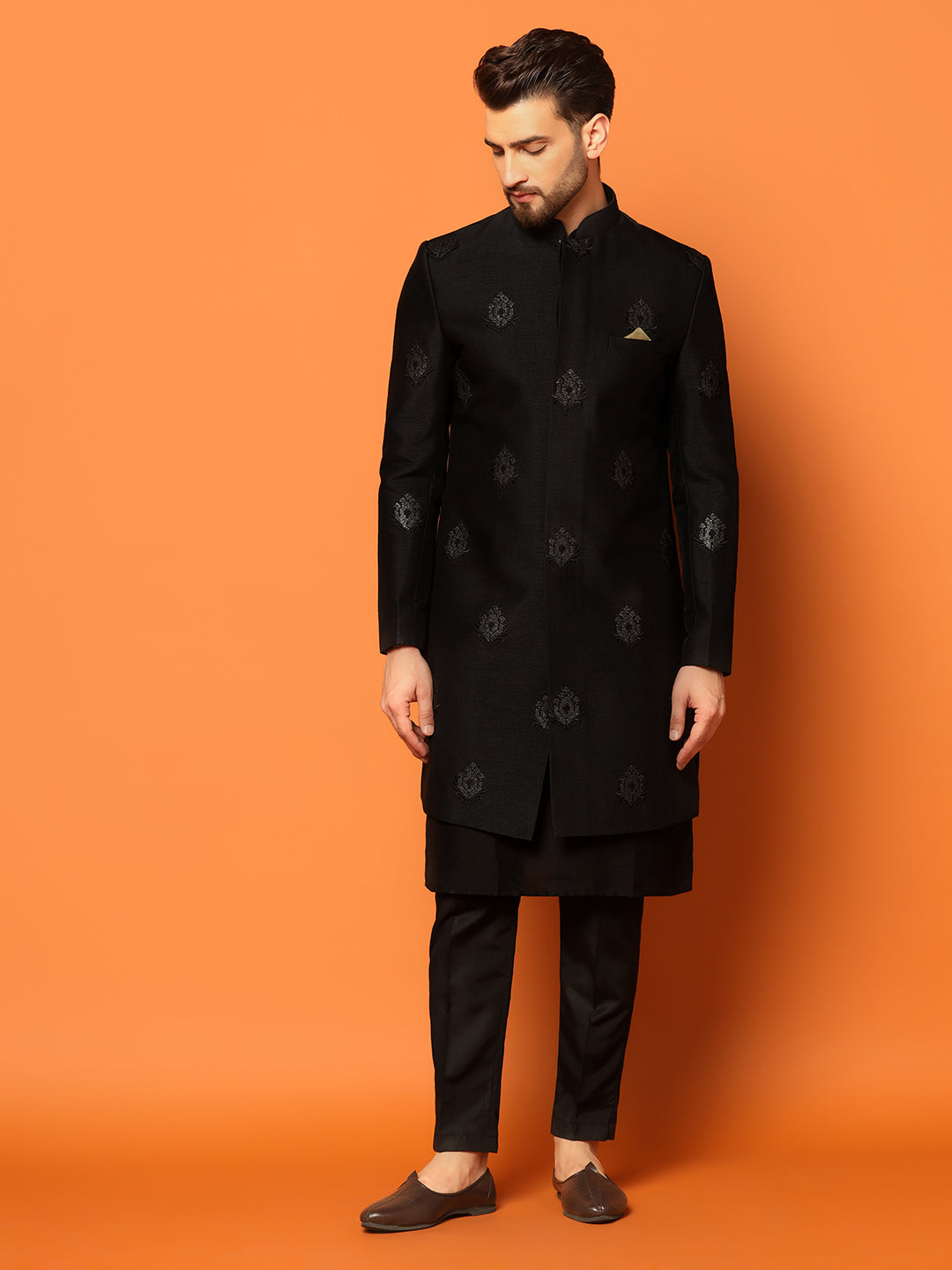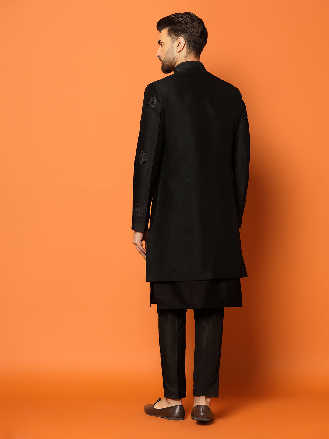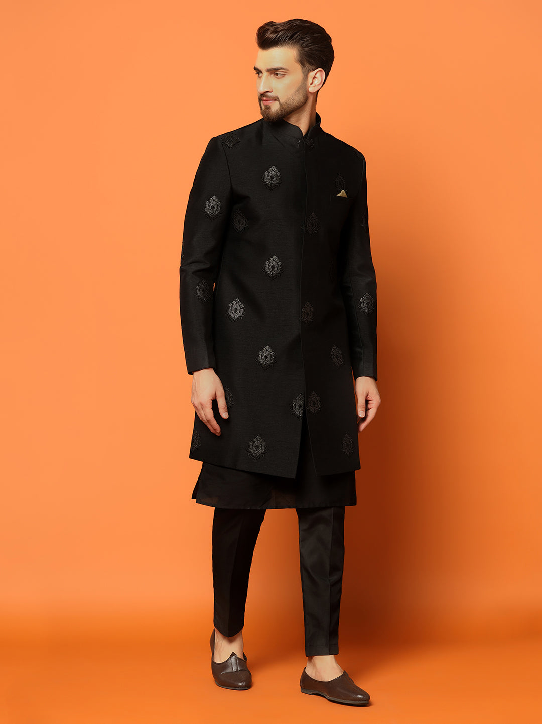 Men Black Embroidered Kurta Indowestern Churidar Set