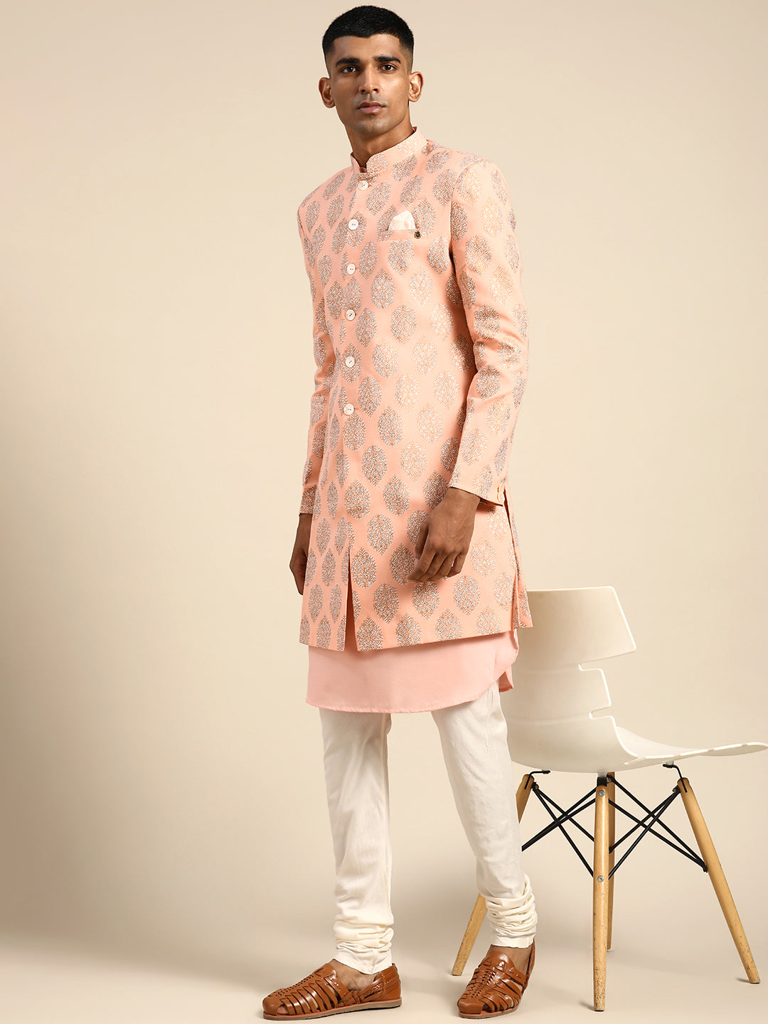 This Indowestern set is an elegant mandarin collar style that is perfect for occasional wear. With a full sleeve design, Pink colour and Cotton Blend Fabric fabric, it will make you look stylish. Featuring a Kurta, Indowestern & Bottomwear, it is perfect for formal occasions.