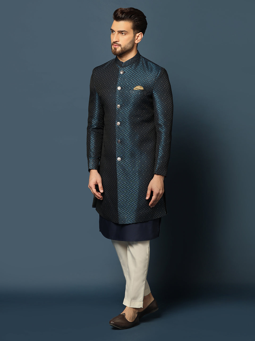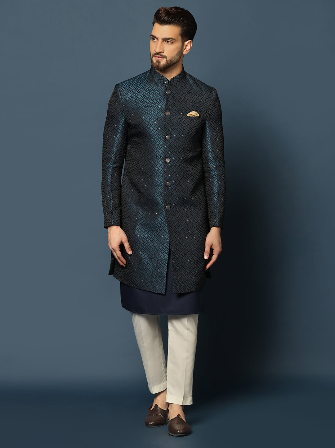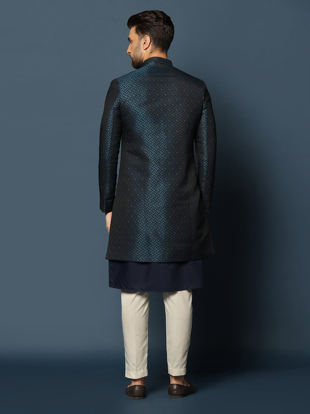Step up your ethnic wardrobe with this navy blue silk blend jacquard kurta, Indowestern, and trouser set. The embellished design and regular fit make it a striking choice for festive occasions.