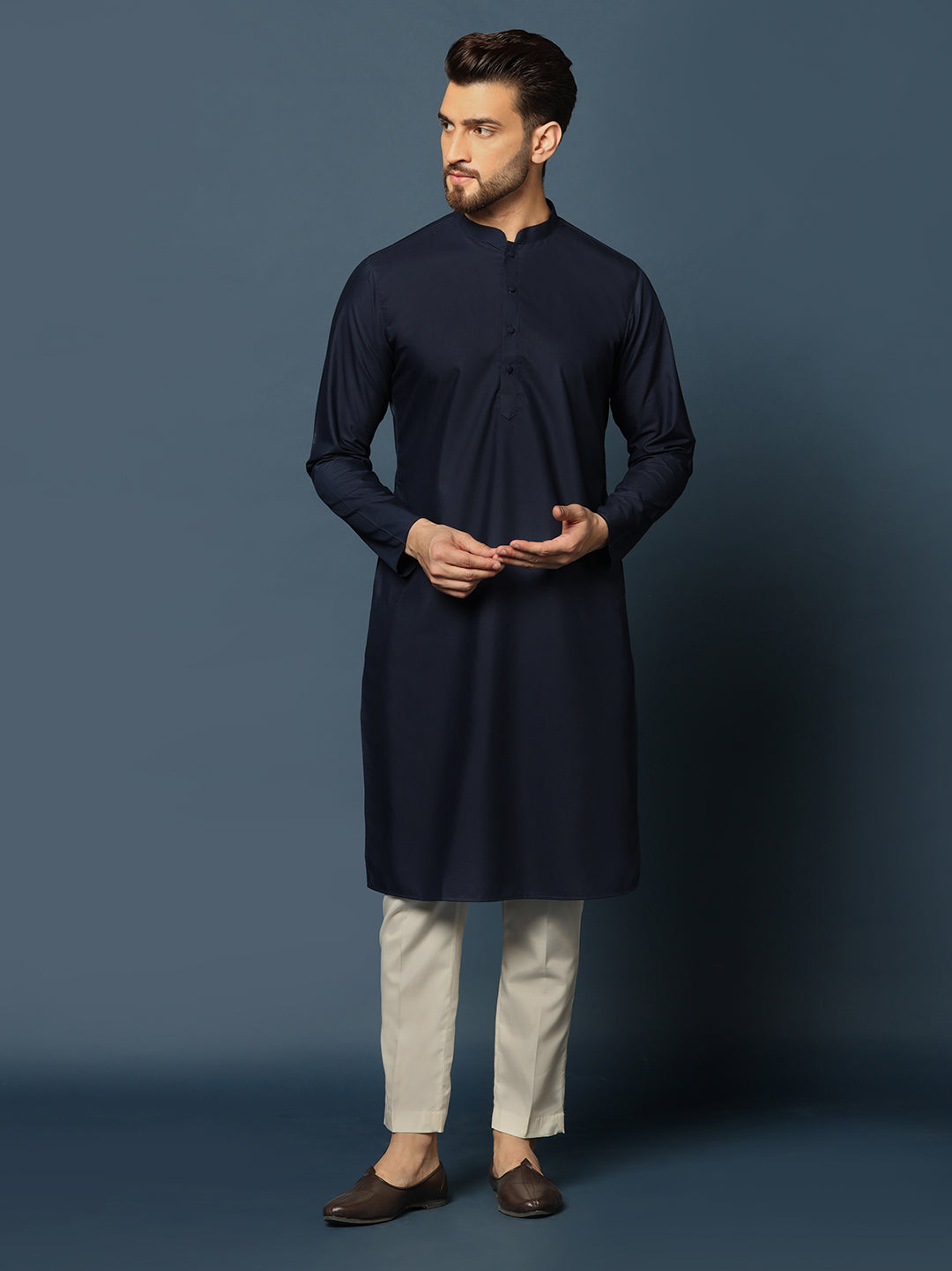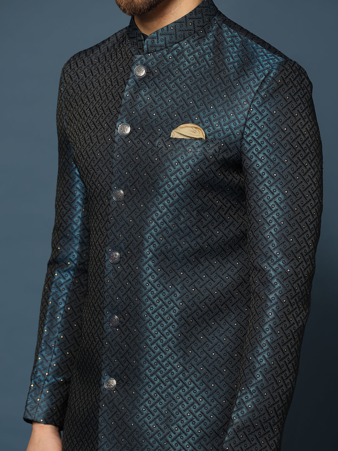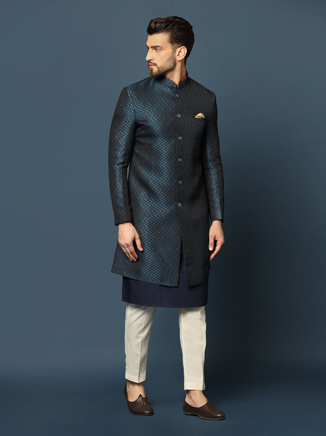 Step up your ethnic wardrobe with this navy blue silk blend jacquard kurta, Indowestern, and trouser set. The embellished design and regular fit make it a striking choice for festive occasions.