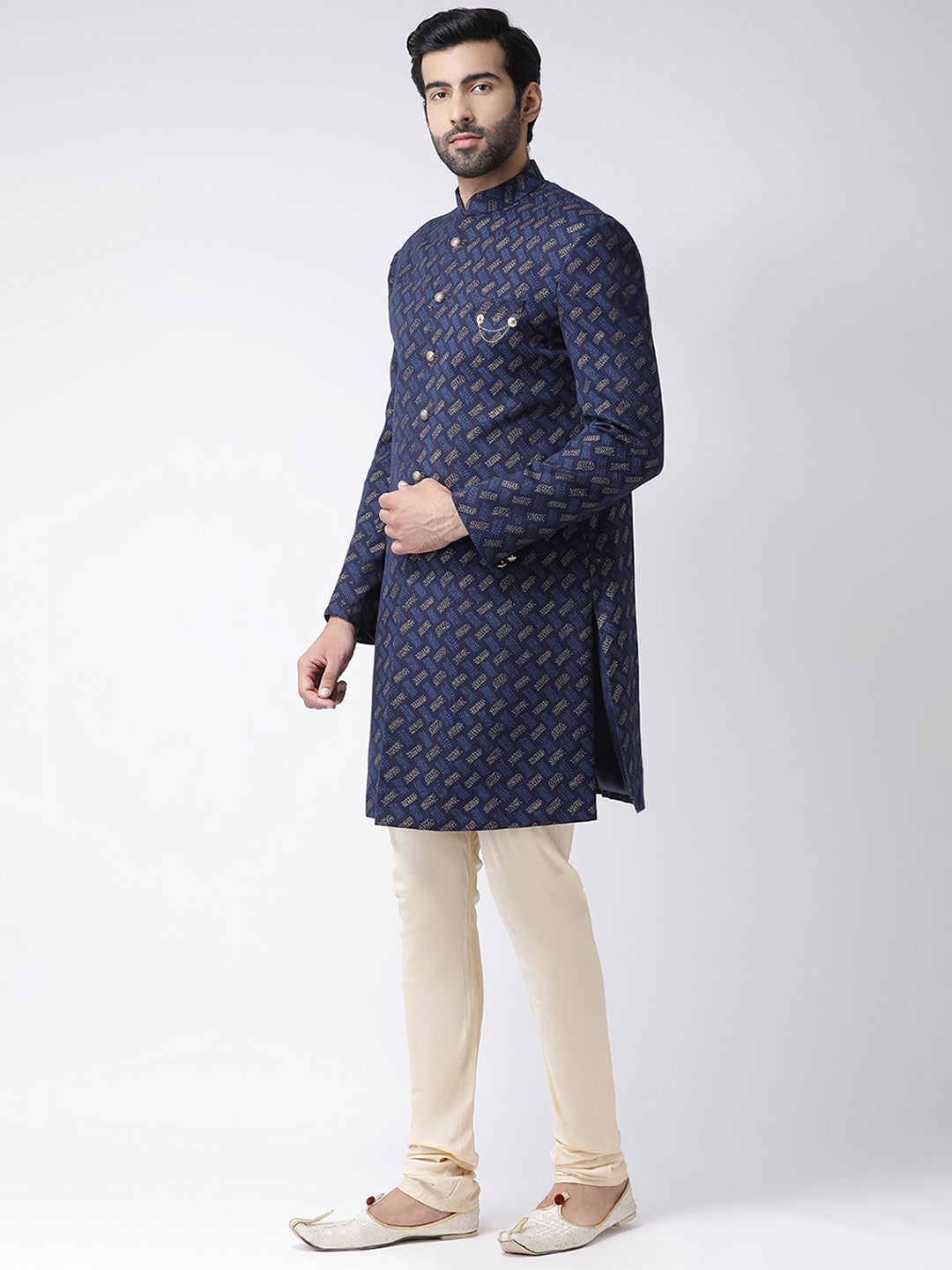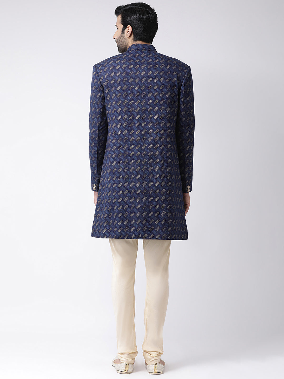 Navy Blue Jacquard Sherwani with Beige Churidar