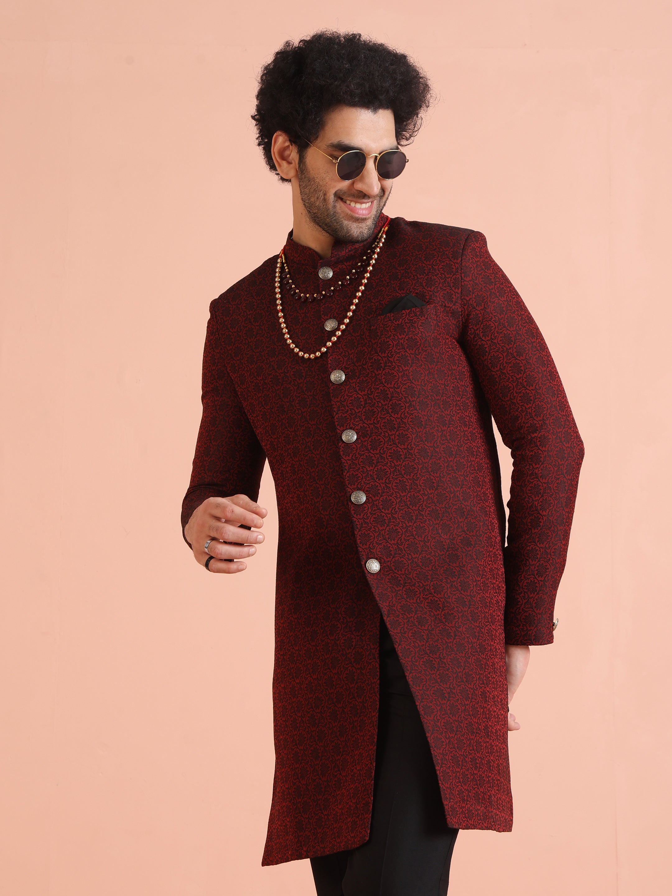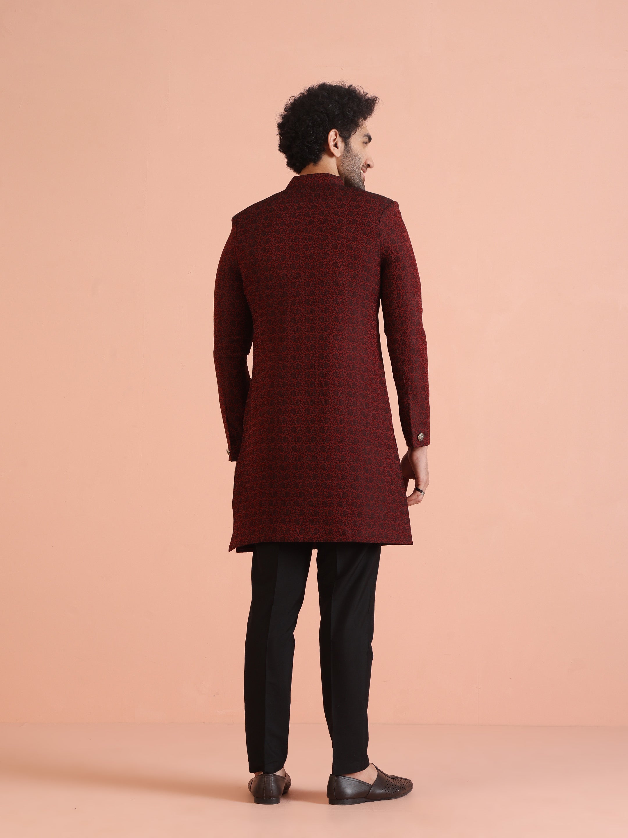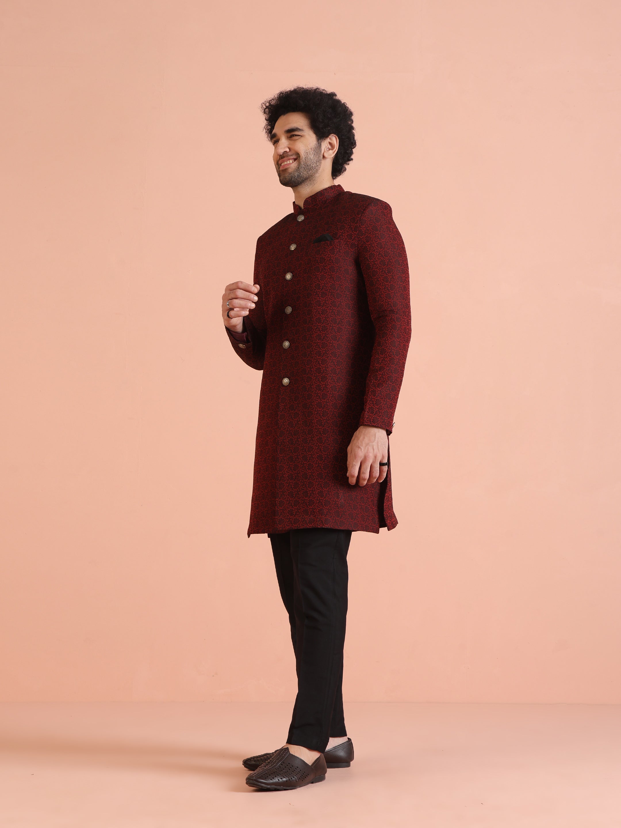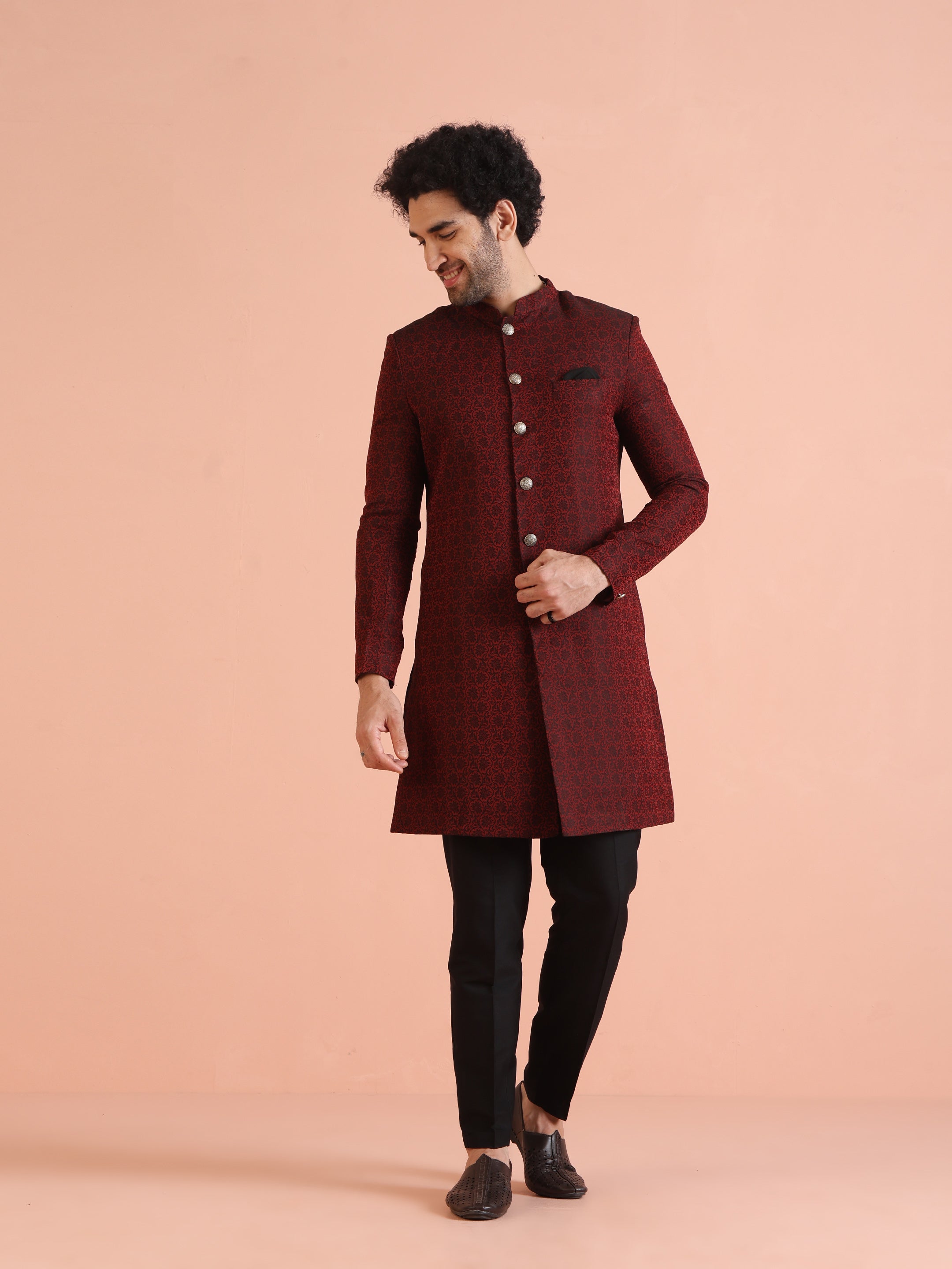 Update your wardrobe with this maroon silk blend jacquard Indowestern and trouser set. The textured design and regular fit make it ideal for any festive gathering.
