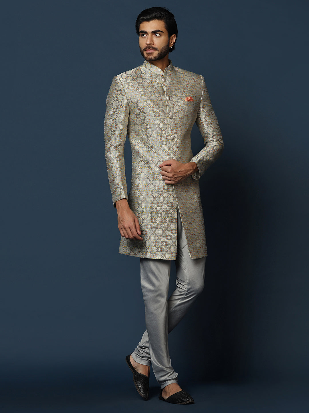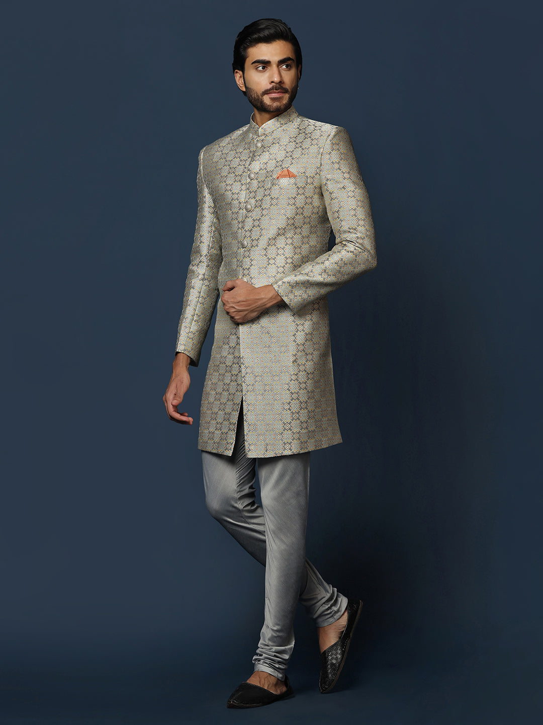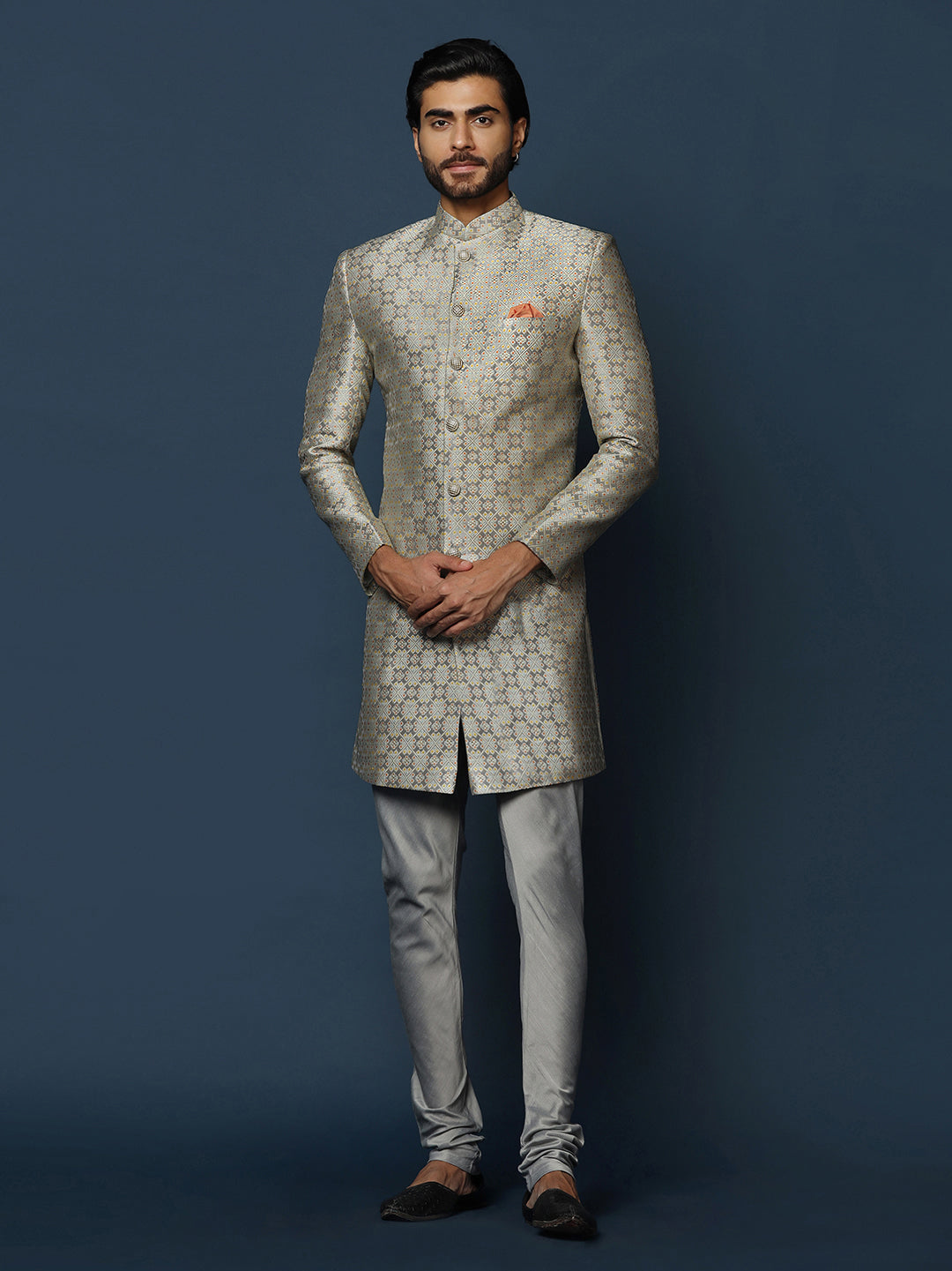 Refine your ethnic look with this grey silk blend jacquard Indowestern and churidar set. The textured design and regular fit make it perfect for traditional gatherings.