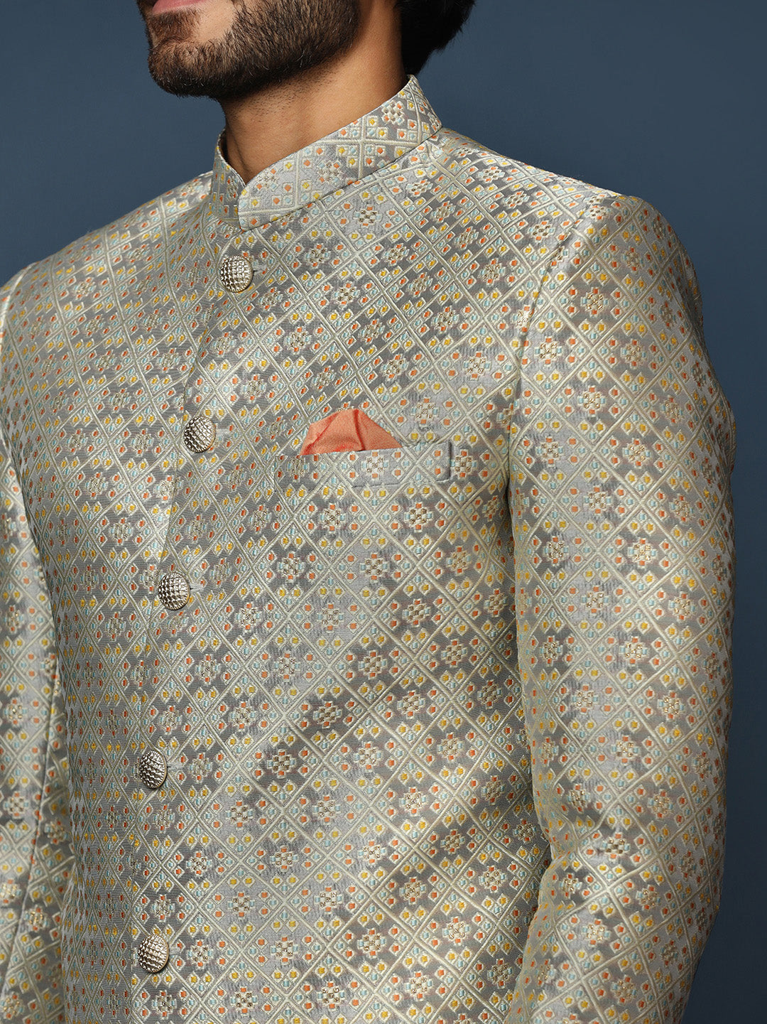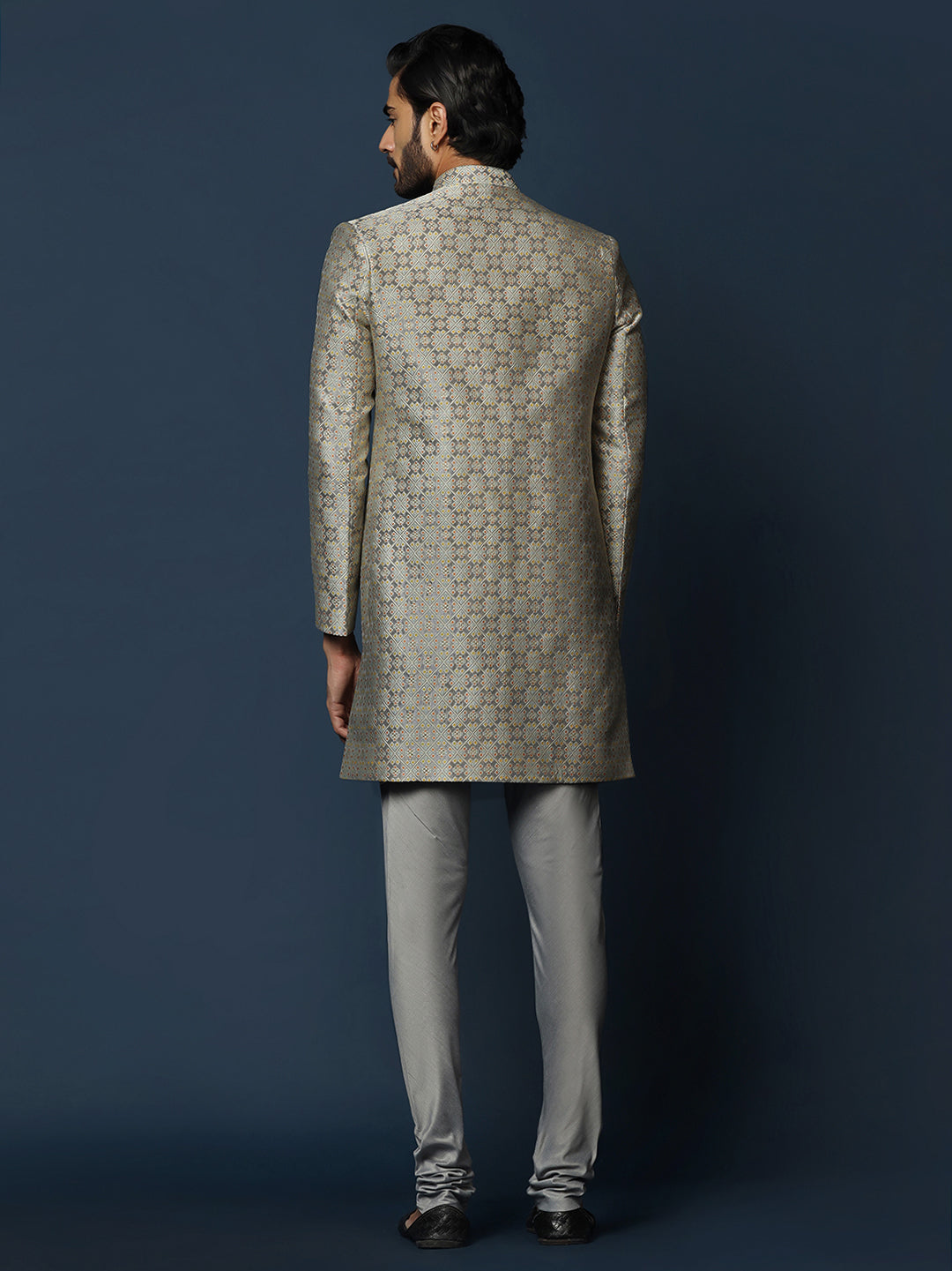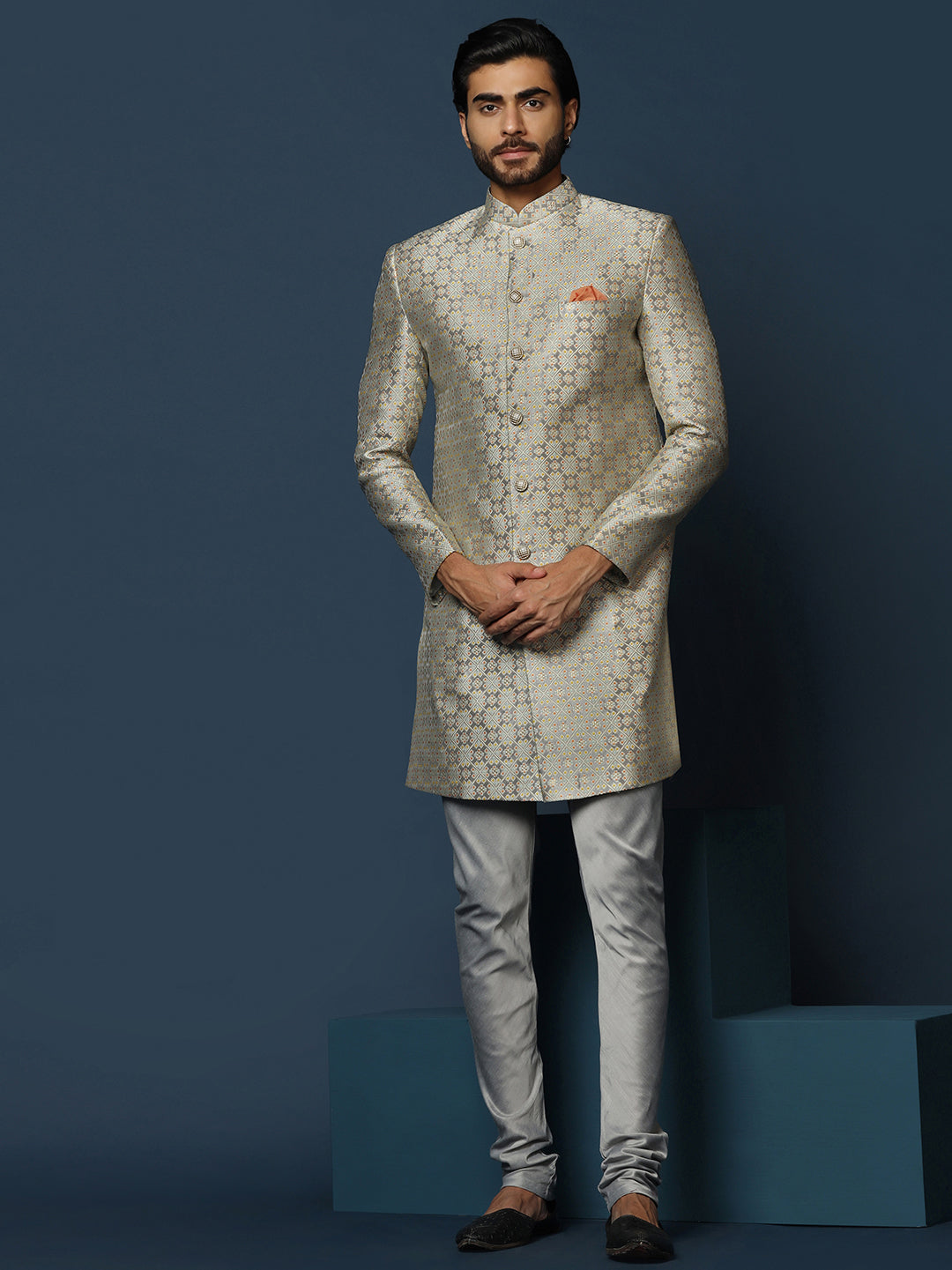 Refine your ethnic look with this grey silk blend jacquard Indowestern and churidar set. The textured design and regular fit make it perfect for traditional gatherings.