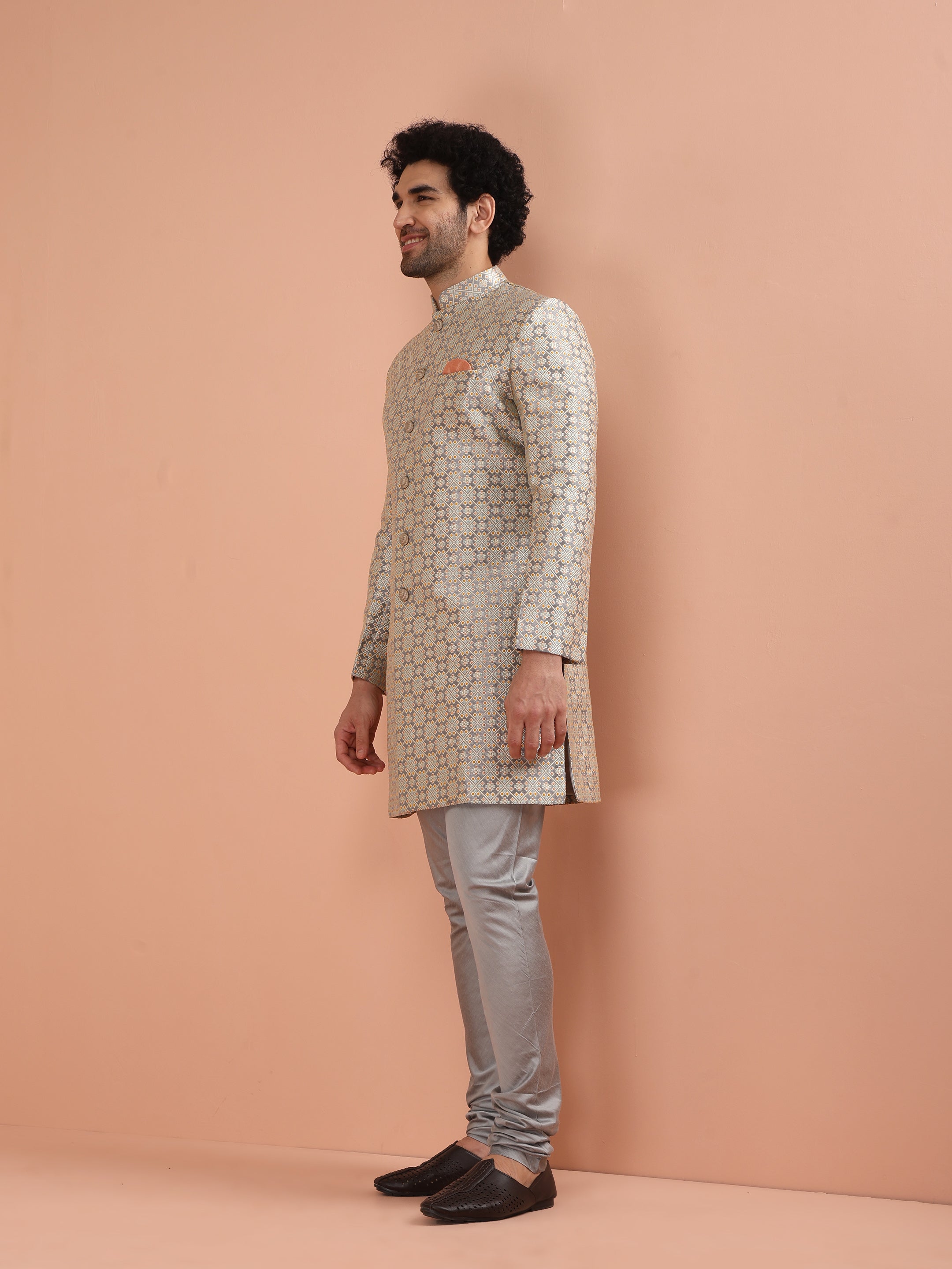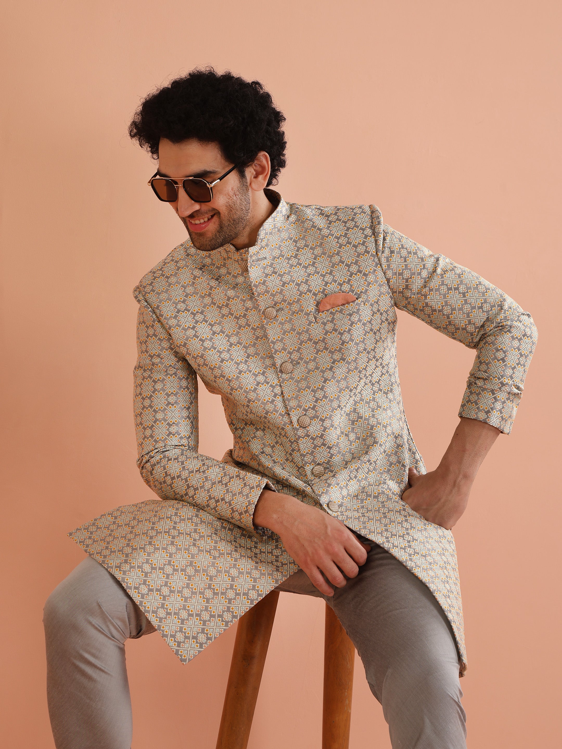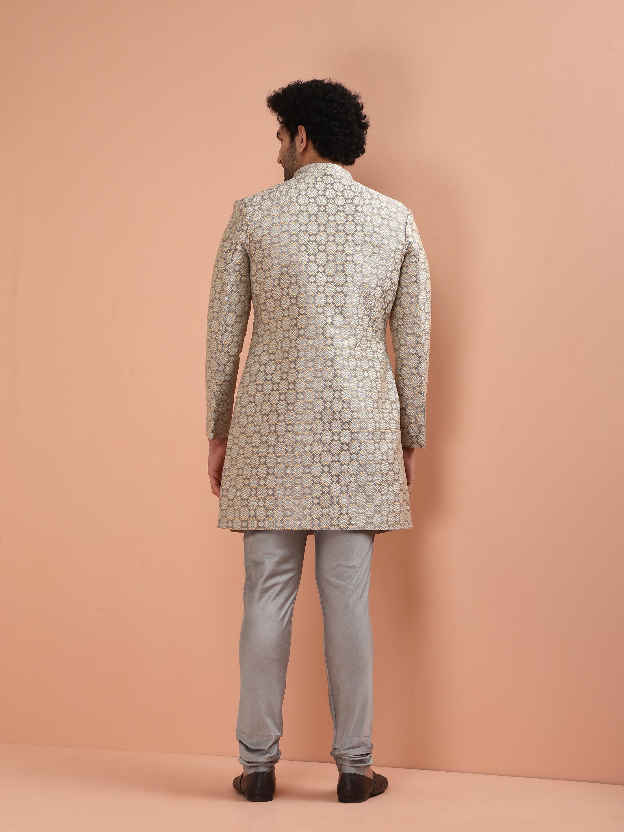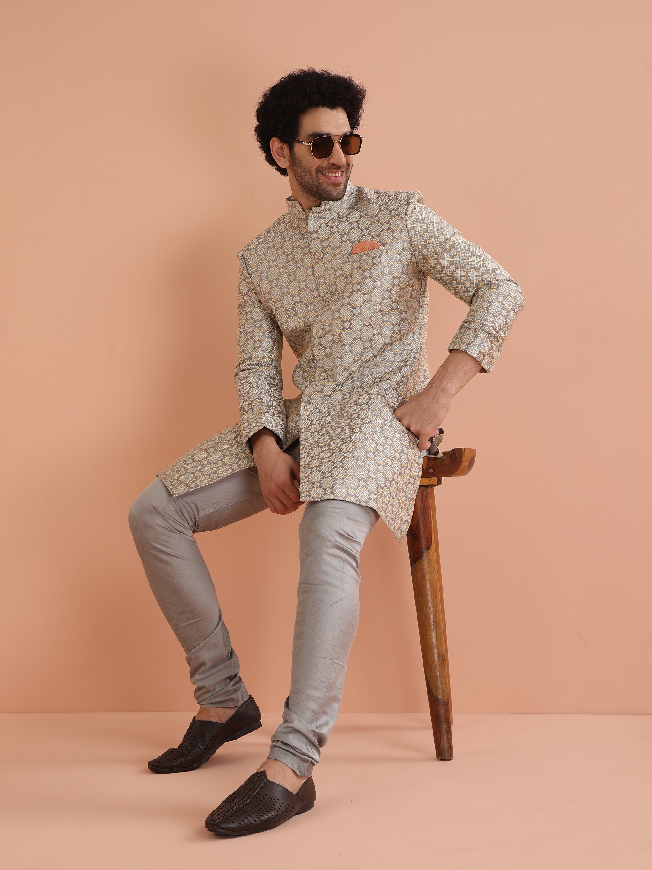 Experience classic elegance with this Men Grey Jacquard Indowestern Churidar Set with Geometric. The breathable Silk Blend fabric ensures comfort throughout the day. Ideal for festive events or casual wear.