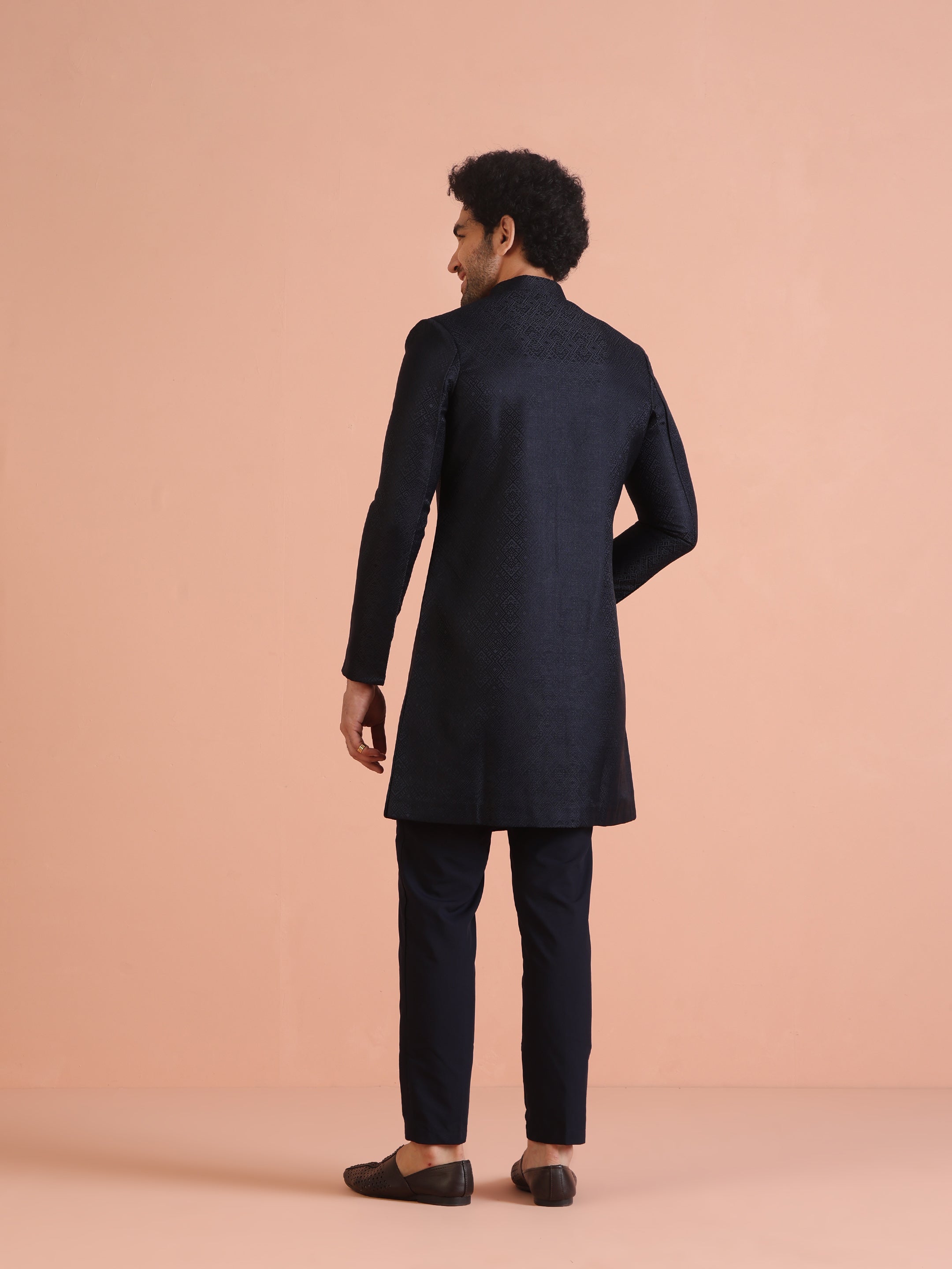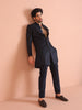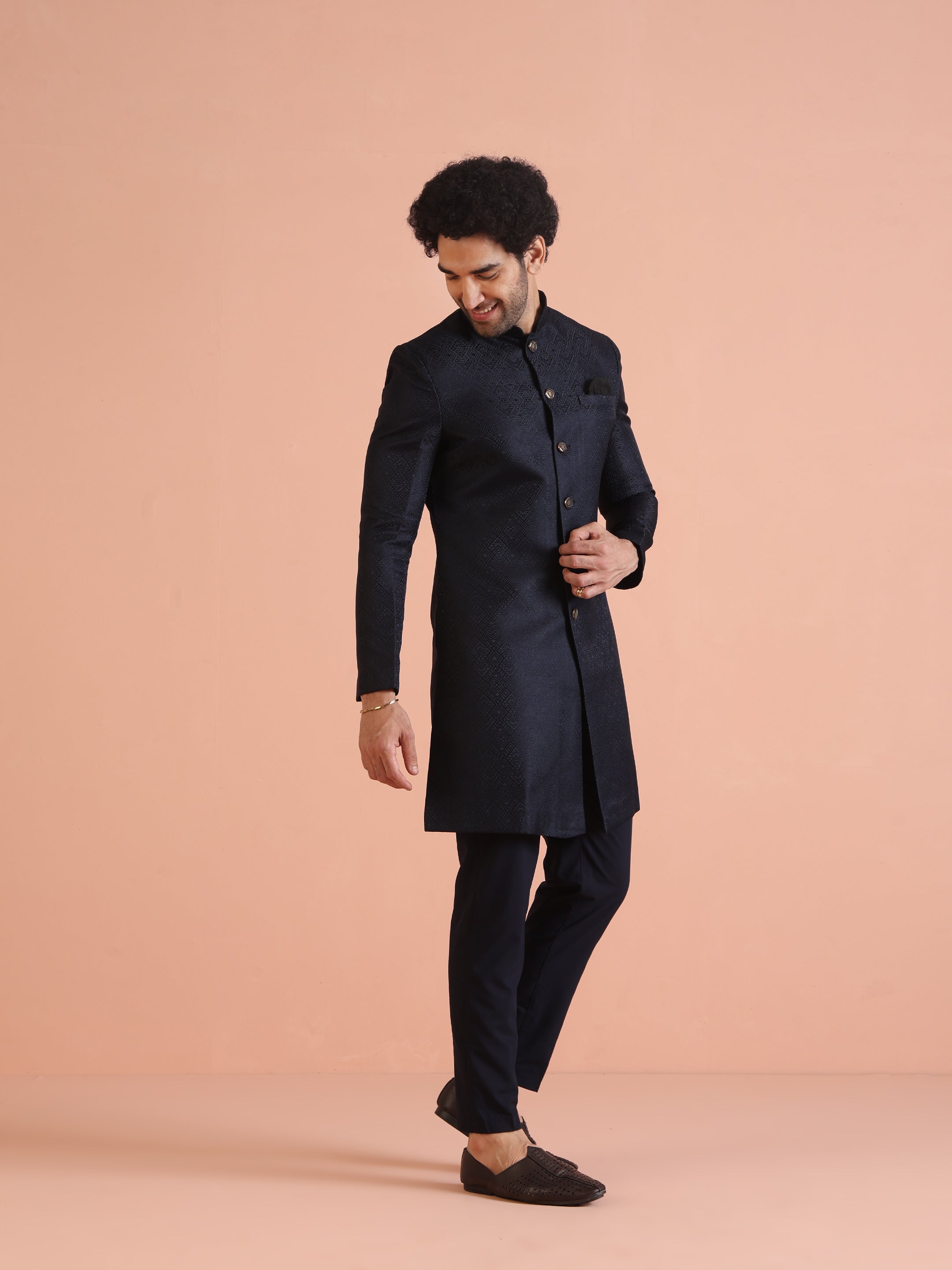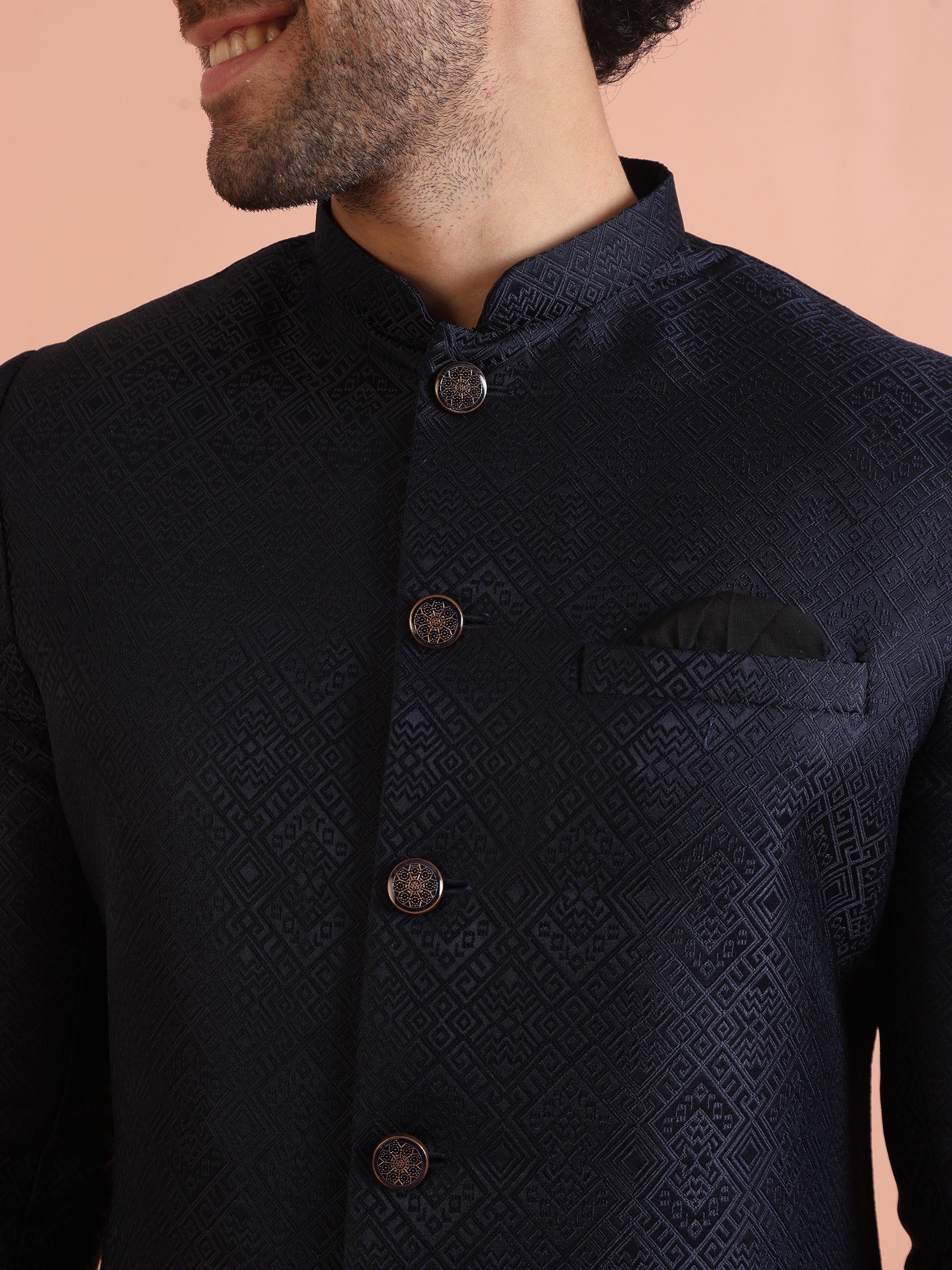 Feel like a star at your next celebration with this Navy Blue Silk Blend Jacquard Indowestern Trouser Set. The striking textured design and regular fit combine for a perfect mix of elegance and comfort. Ideal for weddings or festive events, this set offers a sophisticated look with modern appeal. The luxurious fabric and attention to detail make it a standout piece in your wardrobe, effortlessly elevating your festive style. .