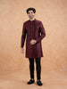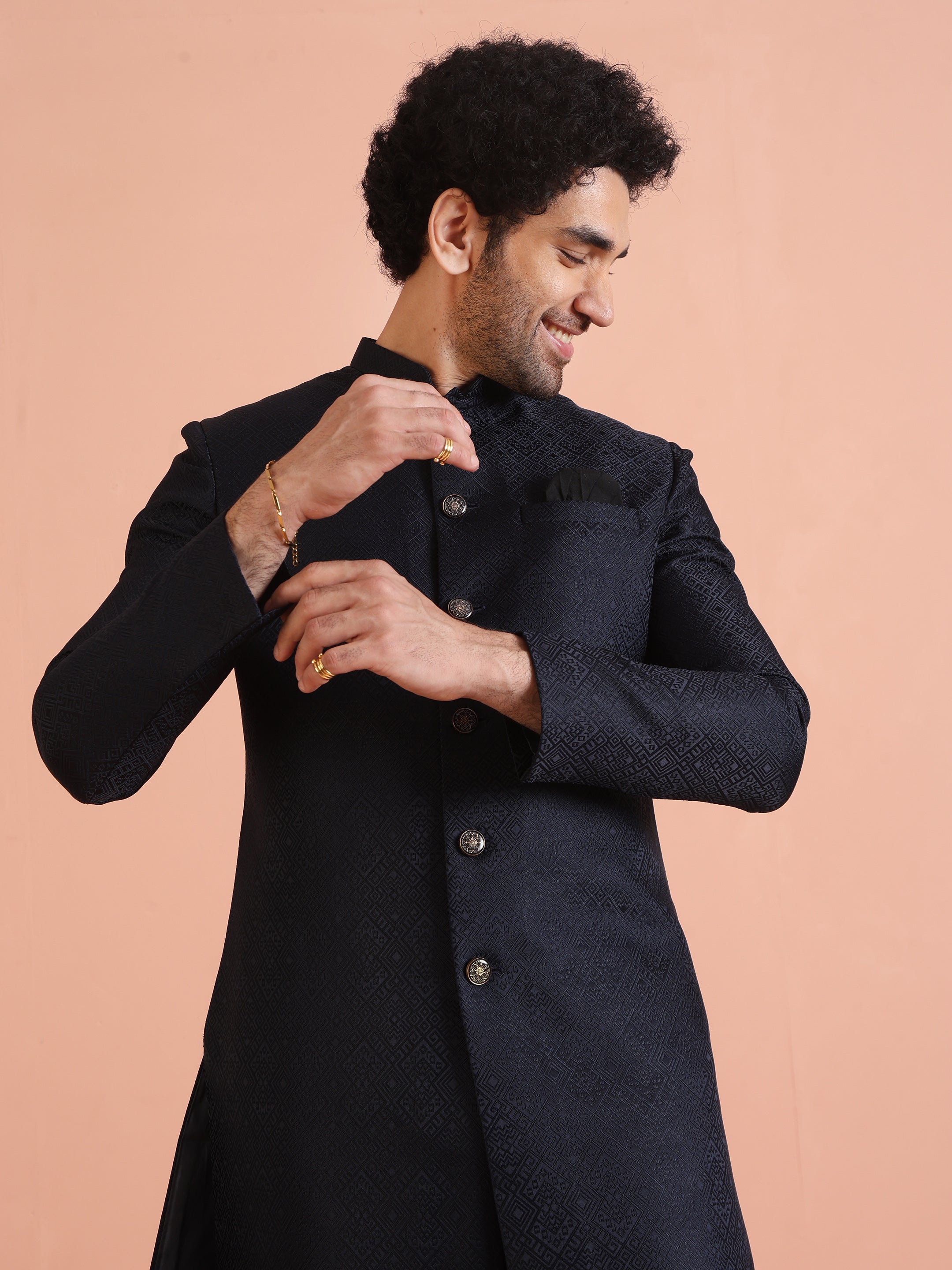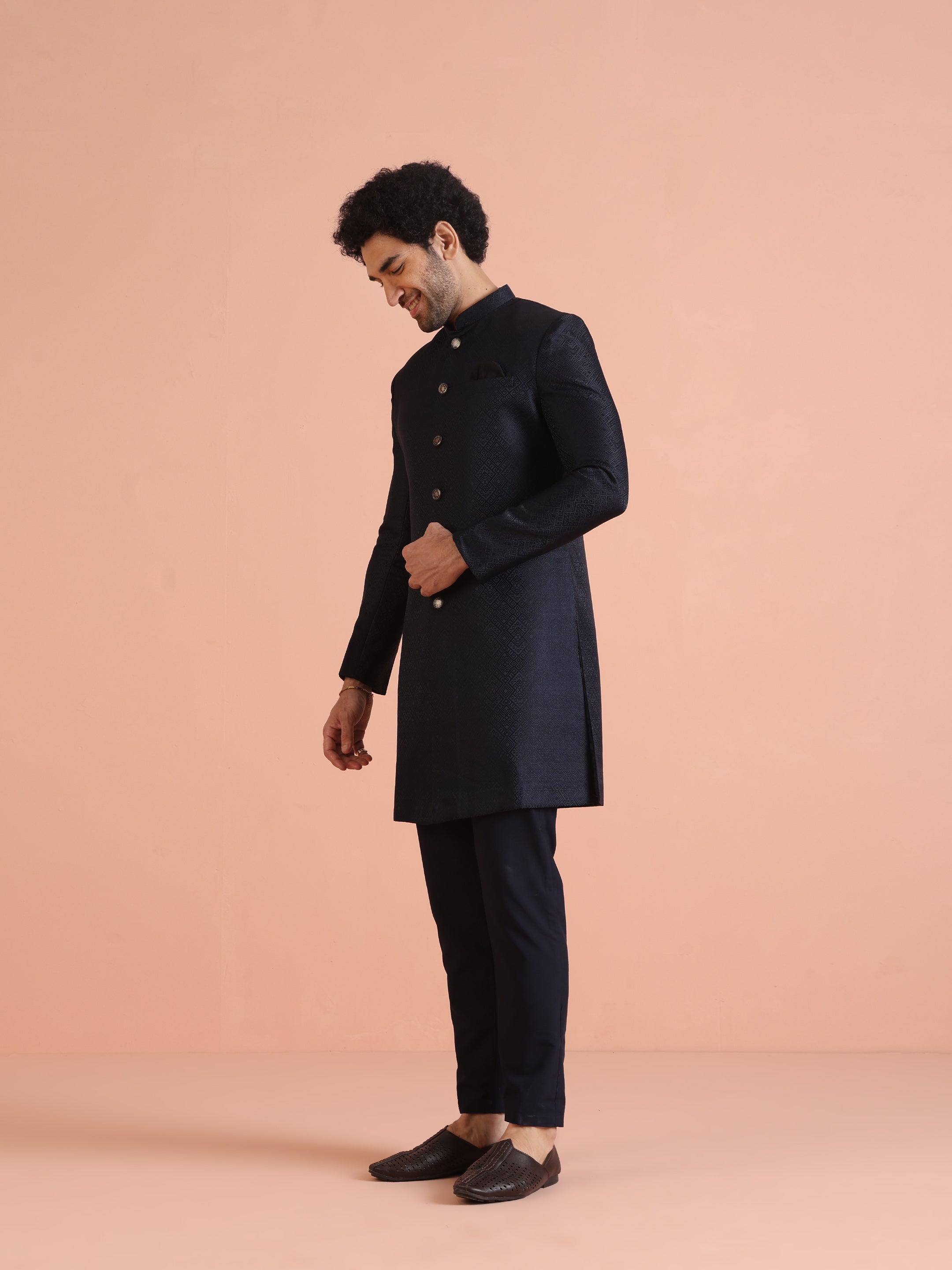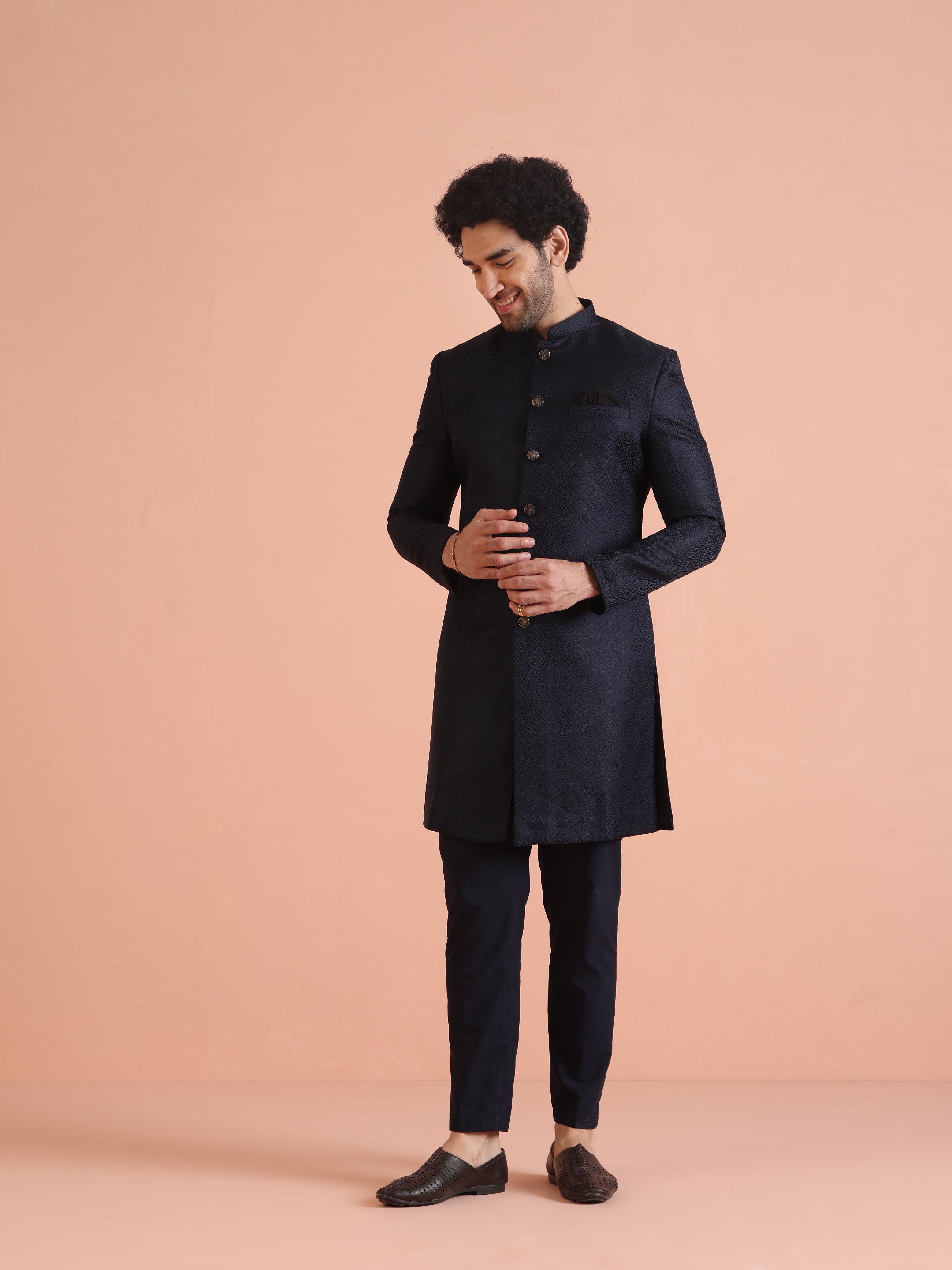 Feel like a star at your next celebration with this Navy Blue Silk Blend Jacquard Indowestern Trouser Set. The striking textured design and regular fit combine for a perfect mix of elegance and comfort. Ideal for weddings or festive events, this set offers a sophisticated look with modern appeal. The luxurious fabric and attention to detail make it a standout piece in your wardrobe, effortlessly elevating your festive style. .