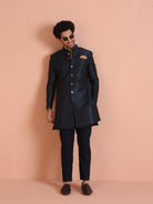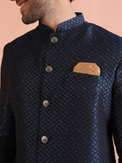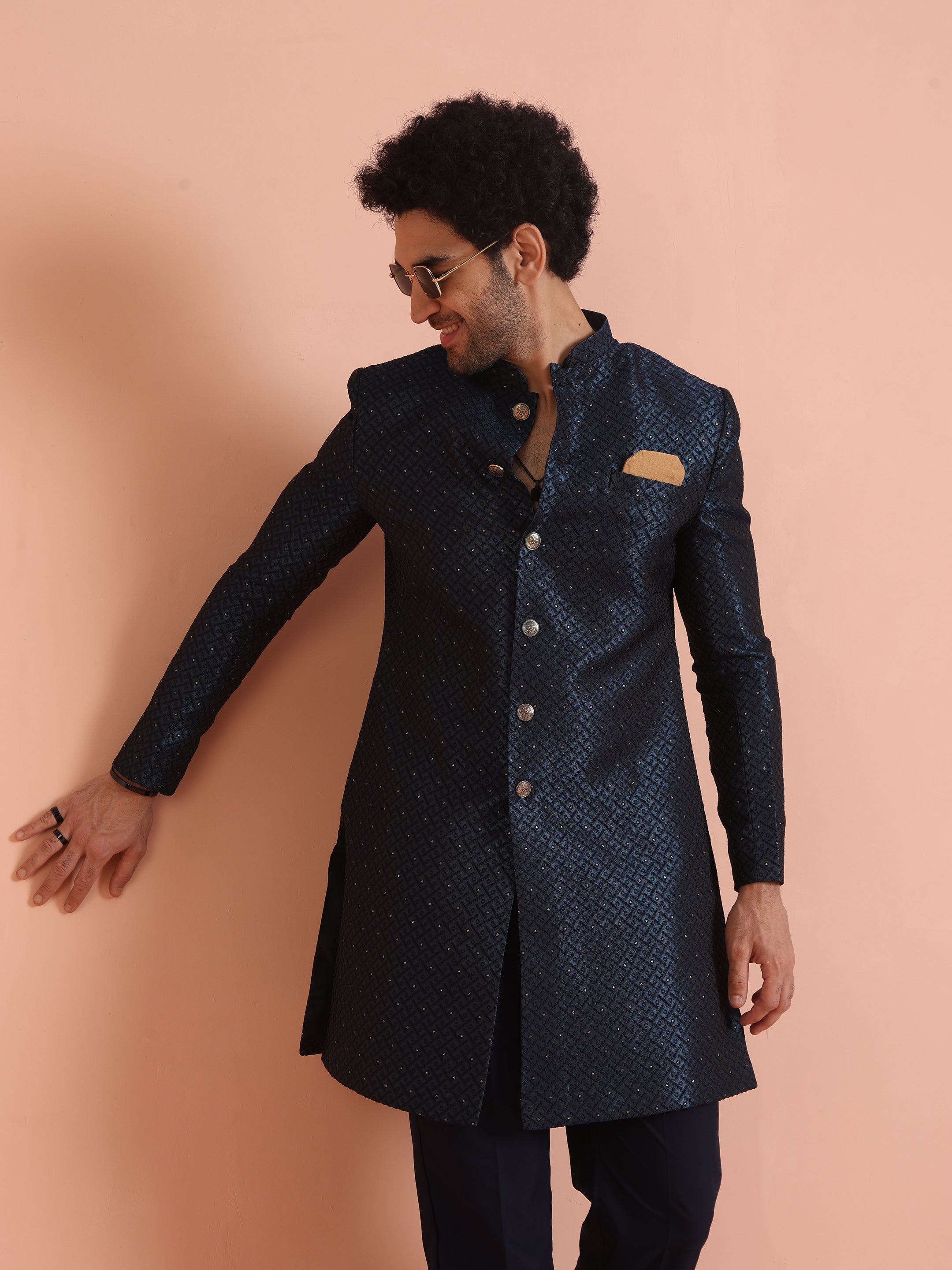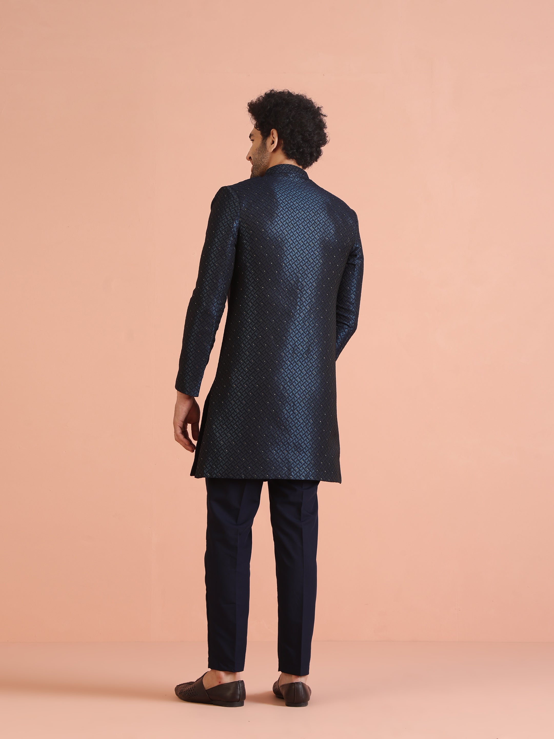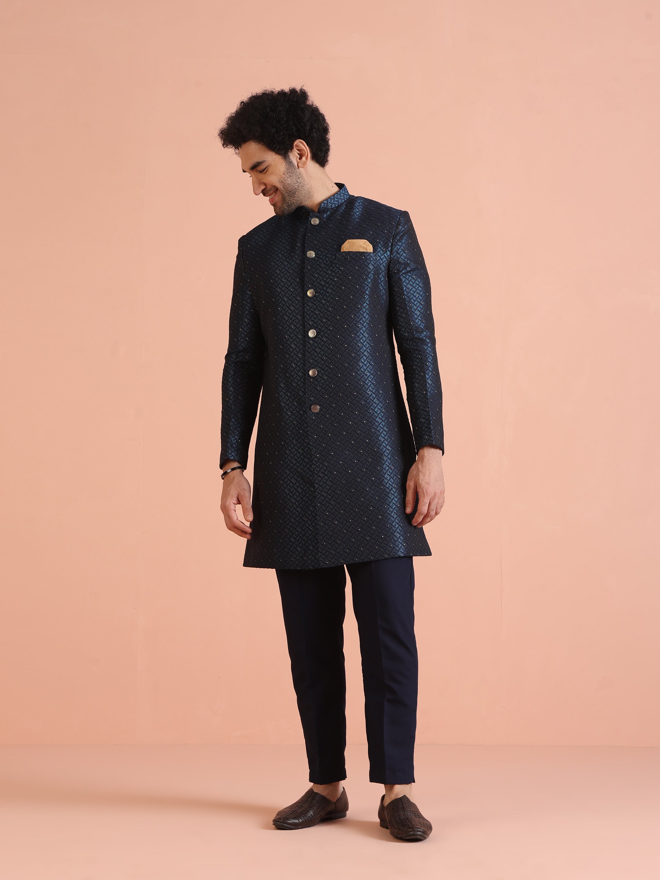 Upgrade your festive wardrobe with this Navy Blue Silk Blend Jacquard Indowestern Trouser Set for men. The intricate embellished design brings a touch of grandeur, while the tailored regular fit ensures an effortlessly refined silhouette. Perfect for high-profile events or festive celebrations, this ensemble exudes sophistication and modern elegance, making it an essential for any stylish occasion.