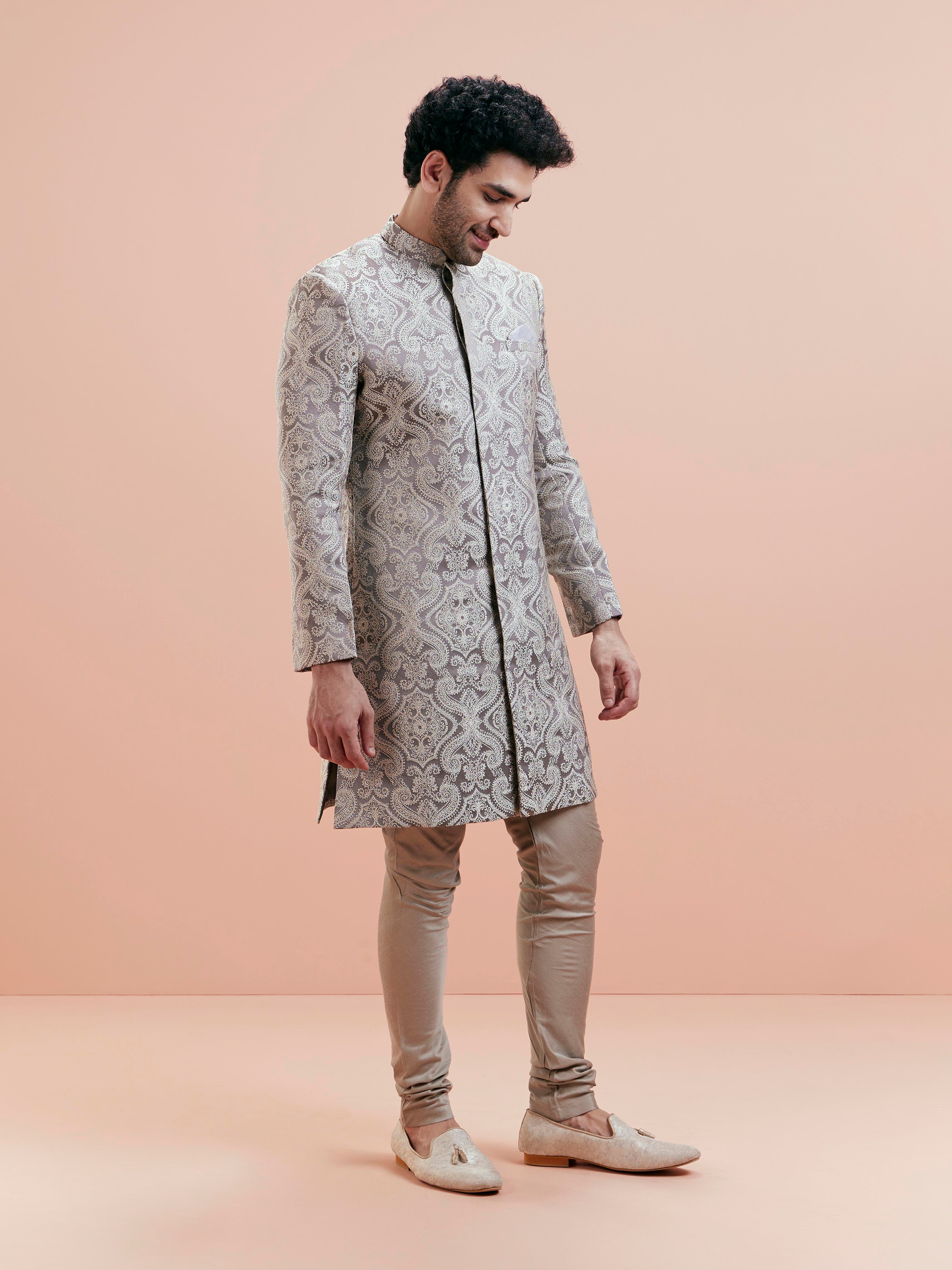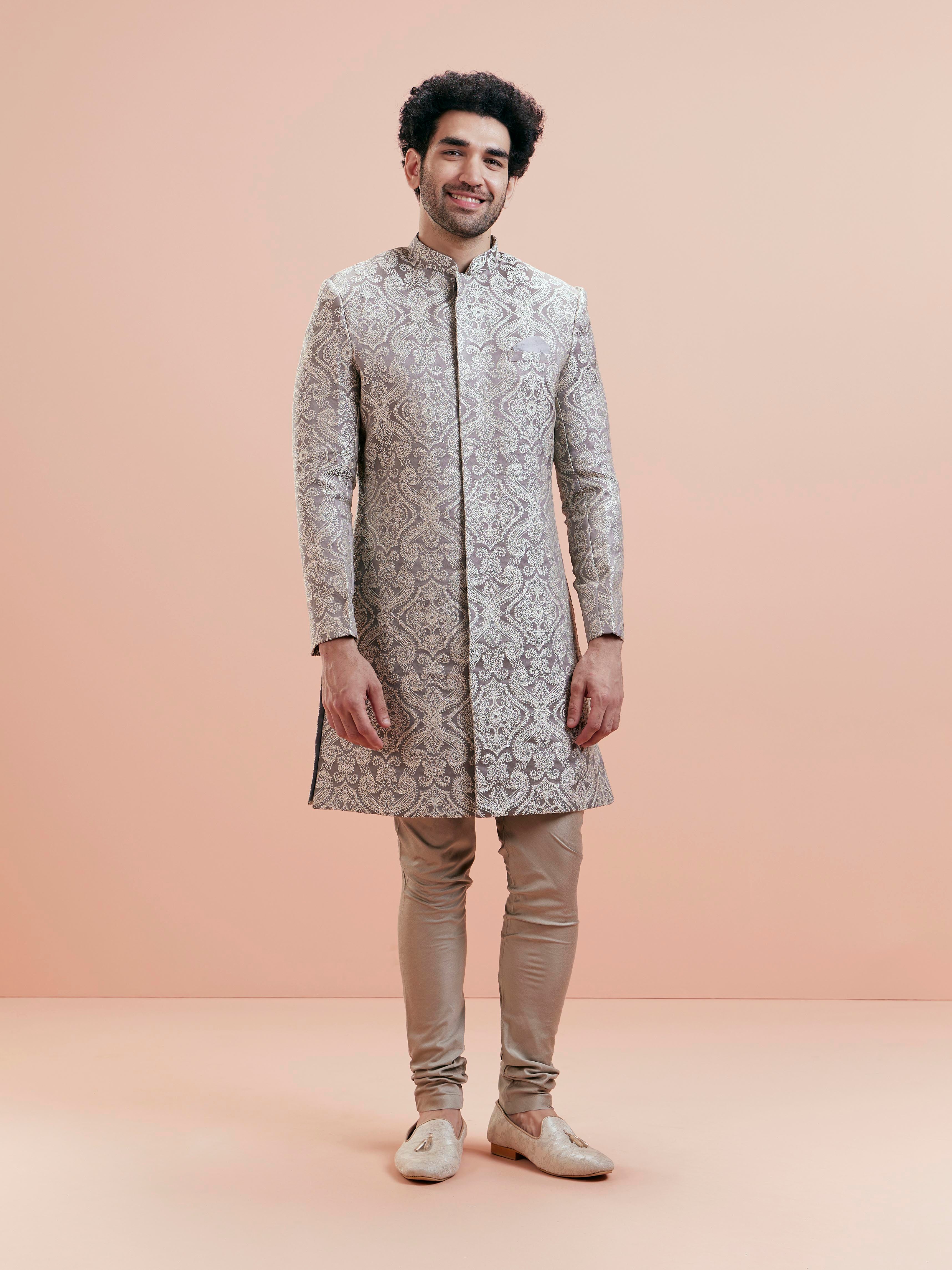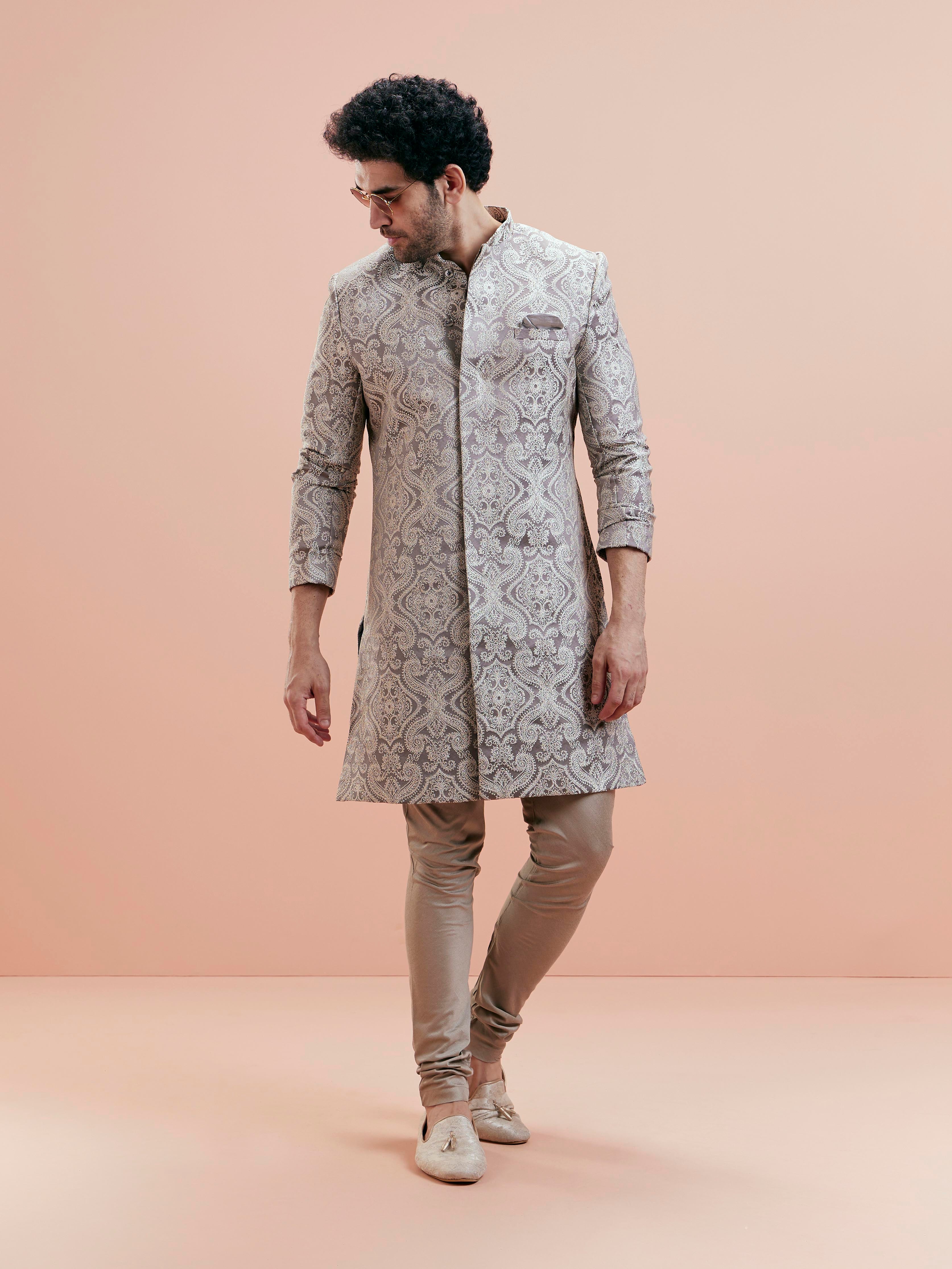 This Grey Silk Blend Sherwani Set is designed for timeless elegance. The all-over textured detail, structured silhouette, and churidar make it perfect for weddings and festive events. A refined look for celebrations.