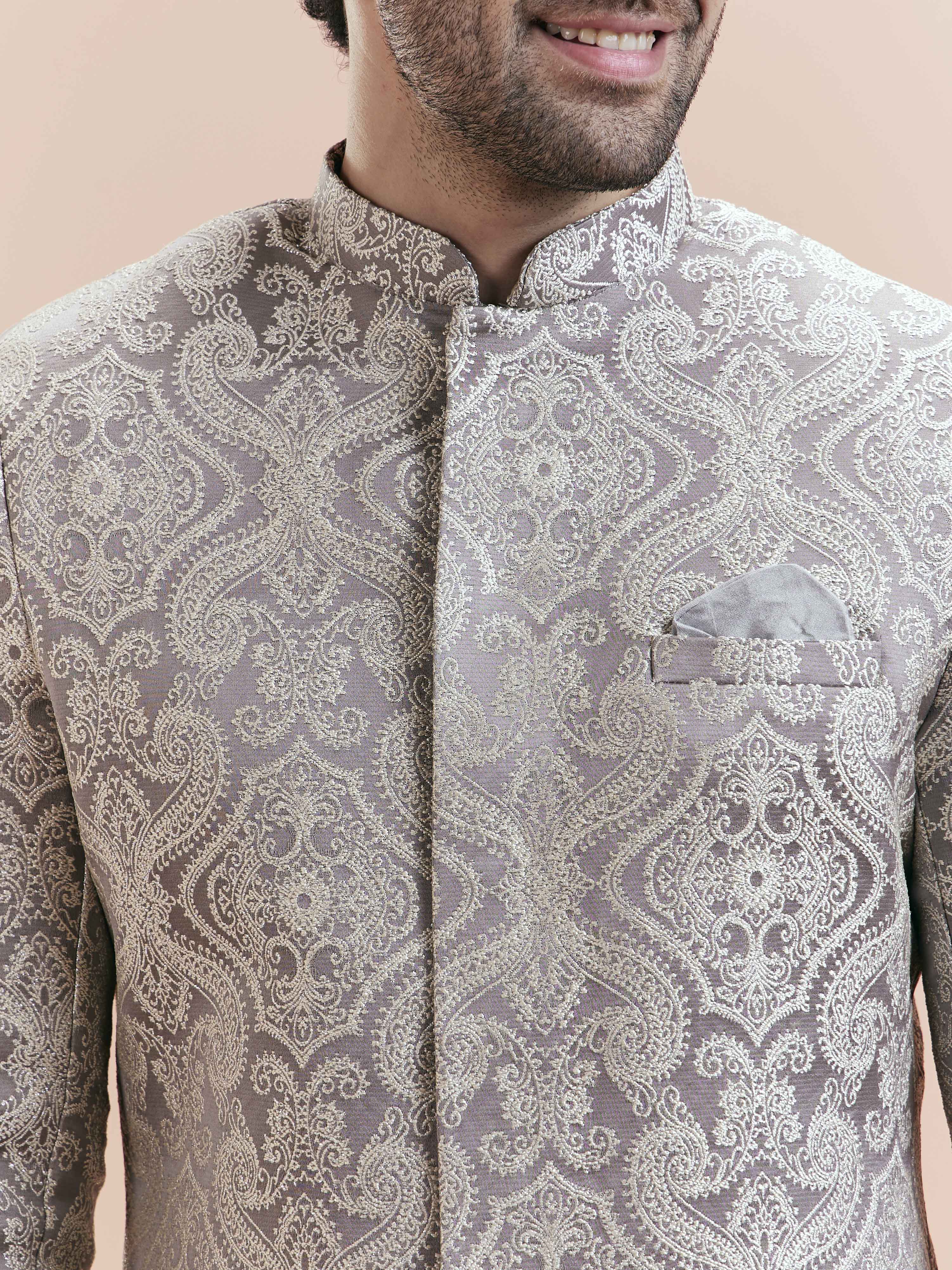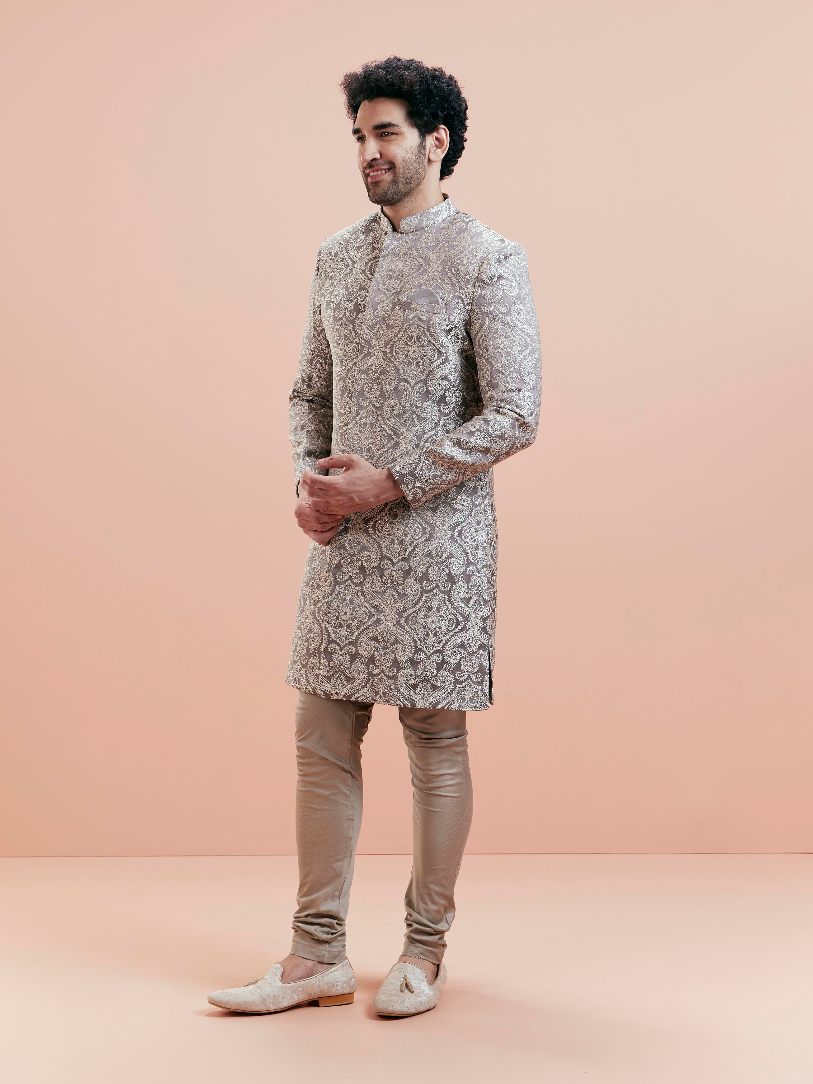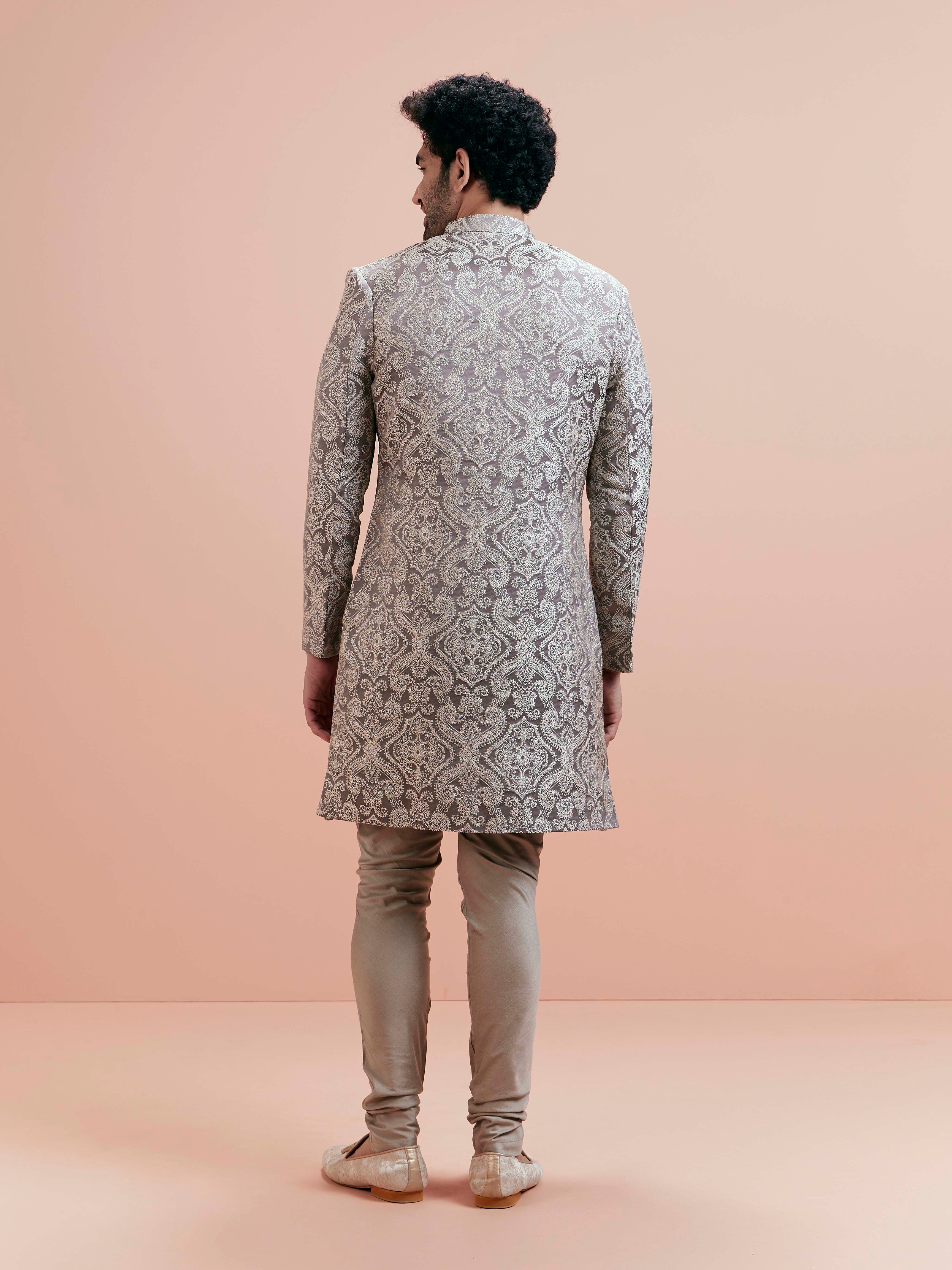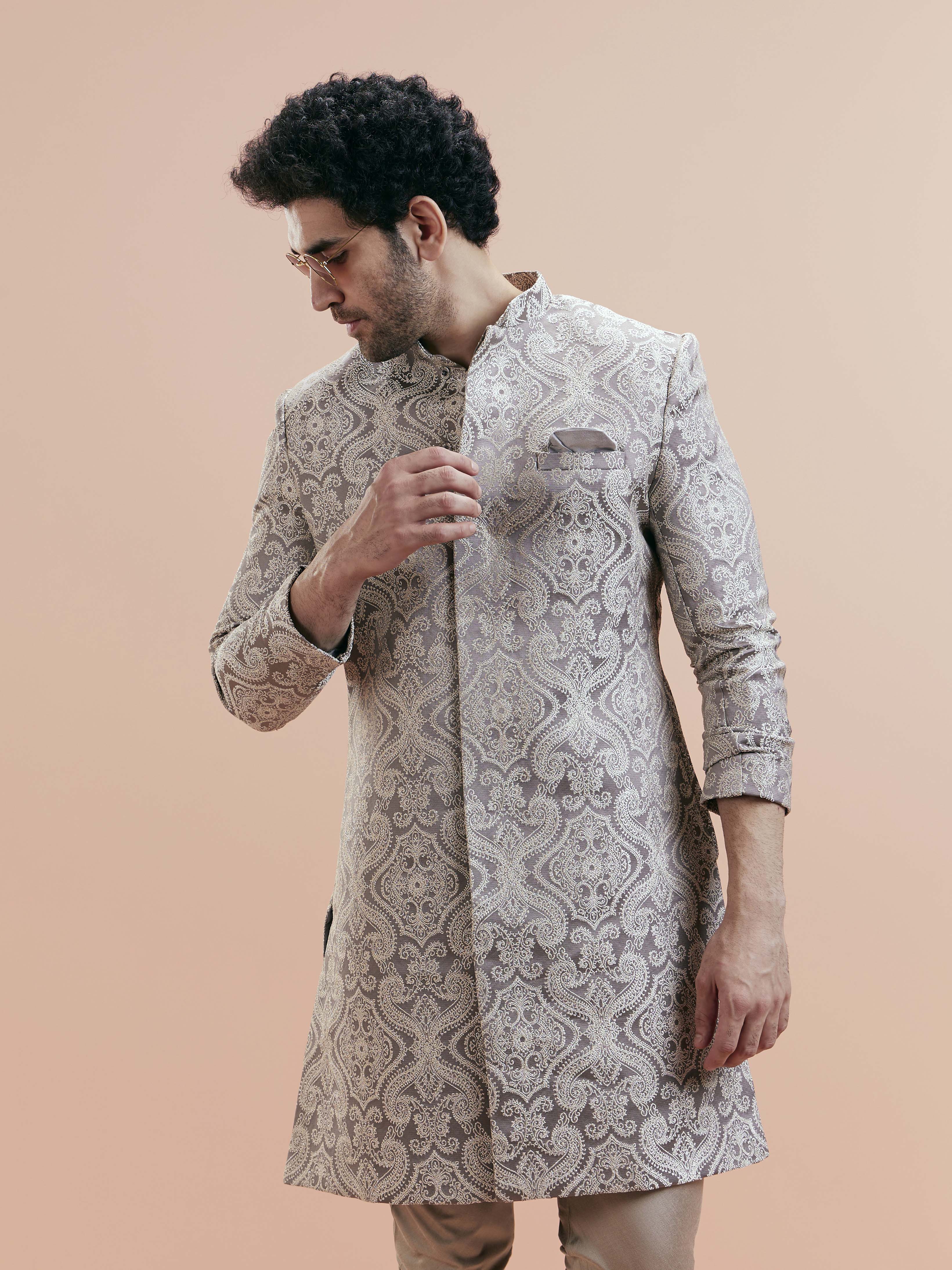 This Grey Silk Blend Sherwani Set is designed for timeless elegance. The all-over textured detail, structured silhouette, and churidar make it perfect for weddings and festive events. A refined look for celebrations.