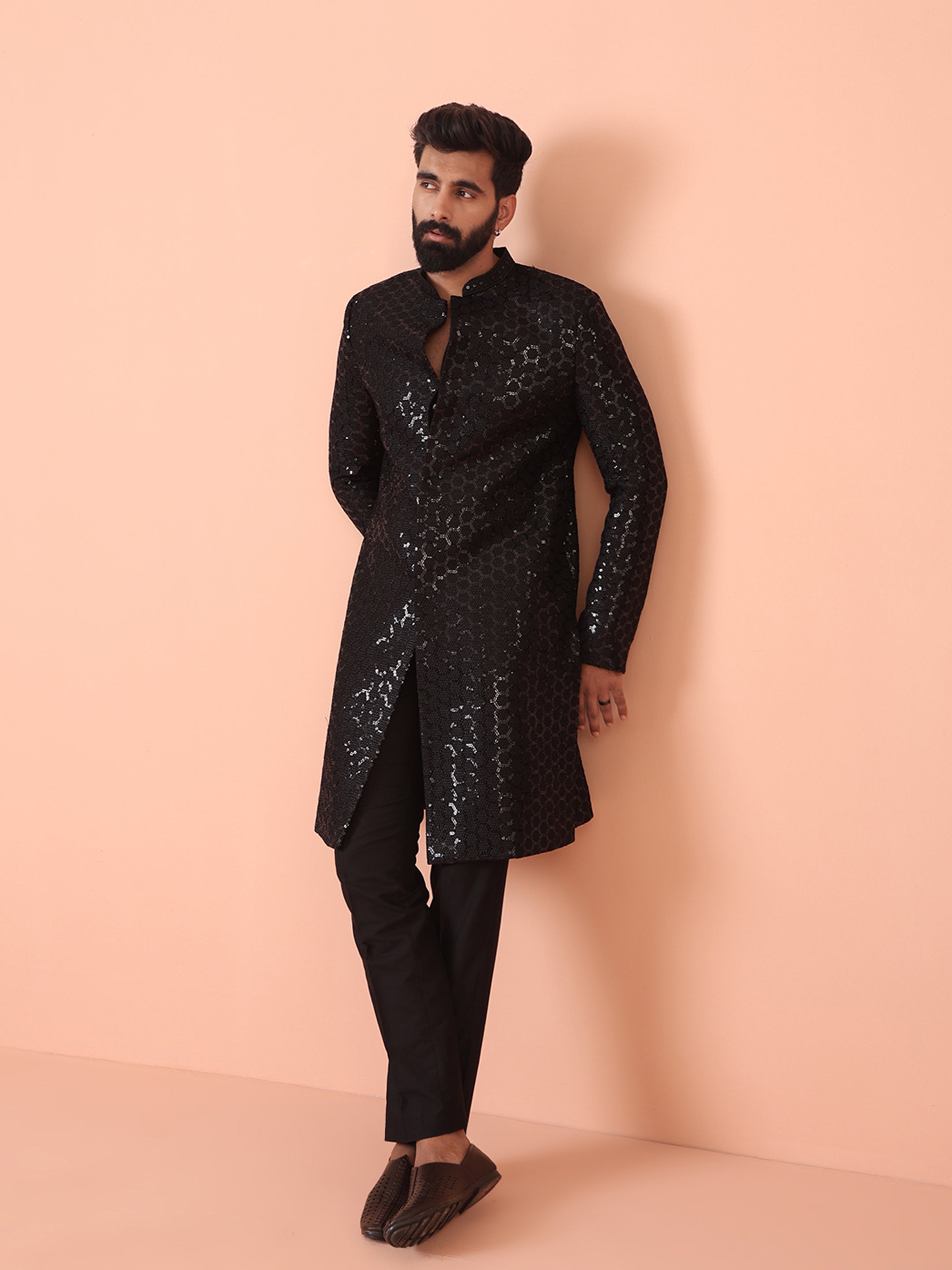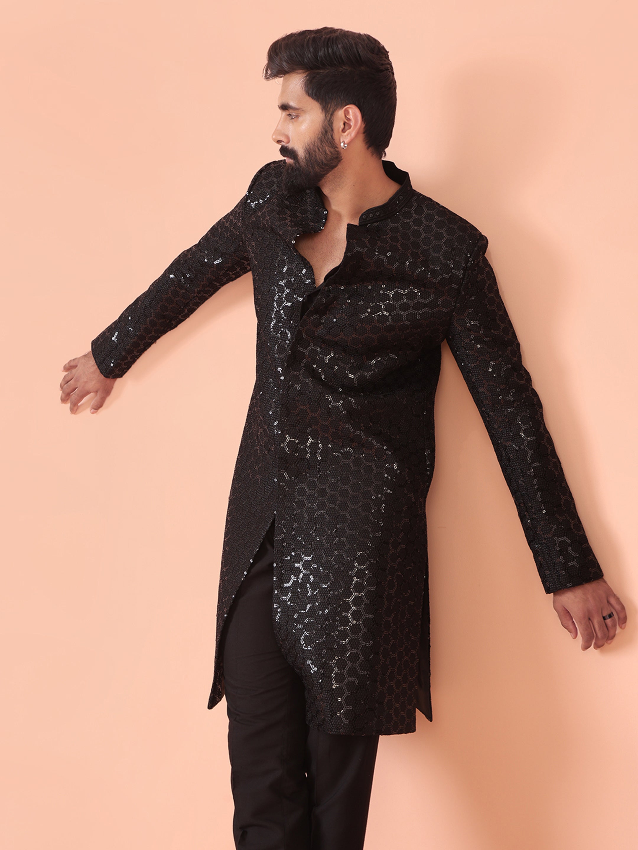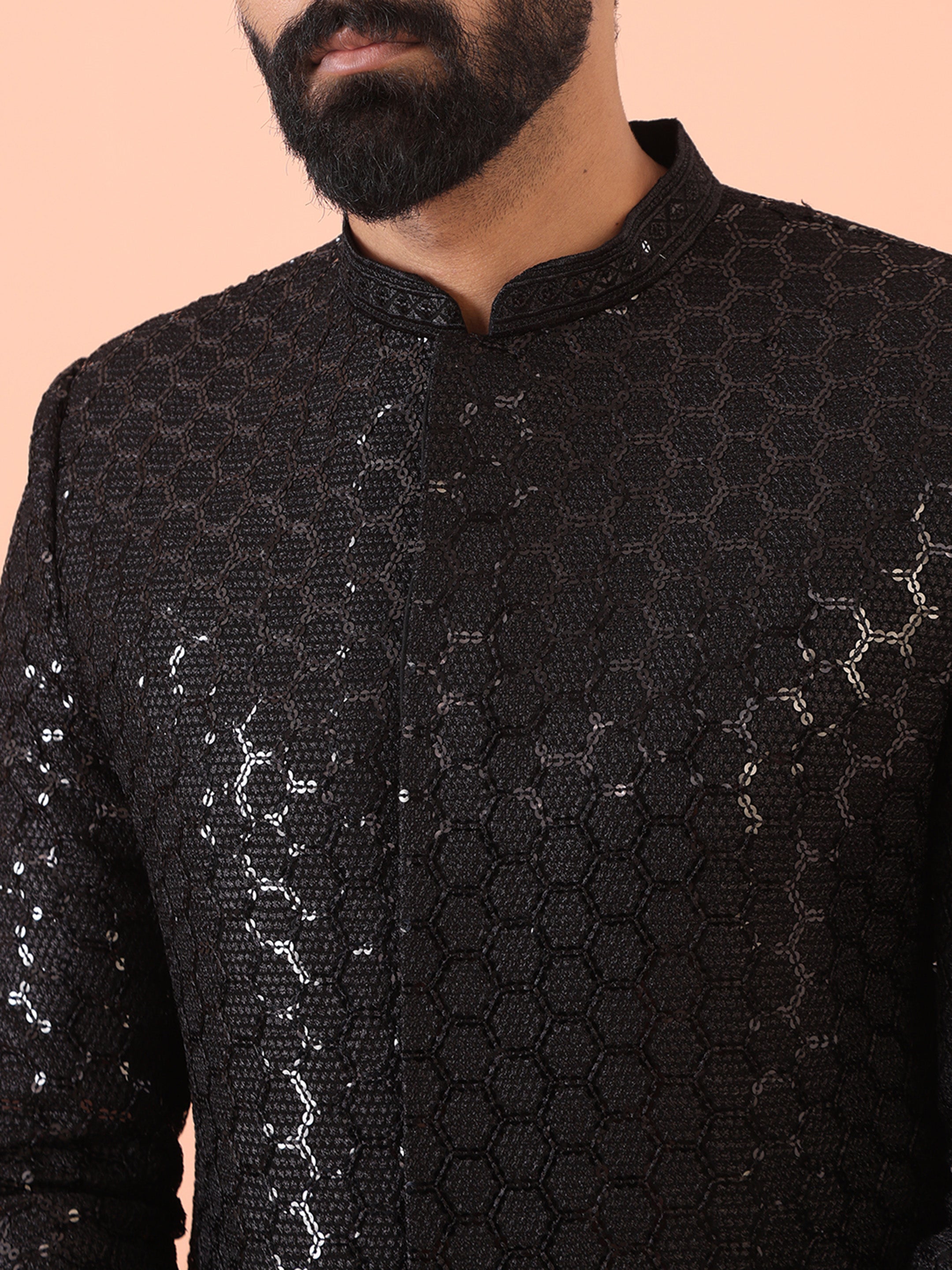 Experience classic elegance with this Men Black Embellished Indowestern Trouser Set with Sequinned. The breathable Silk Blend fabric ensures comfort throughout the day. Ideal for festive events or casual wear.