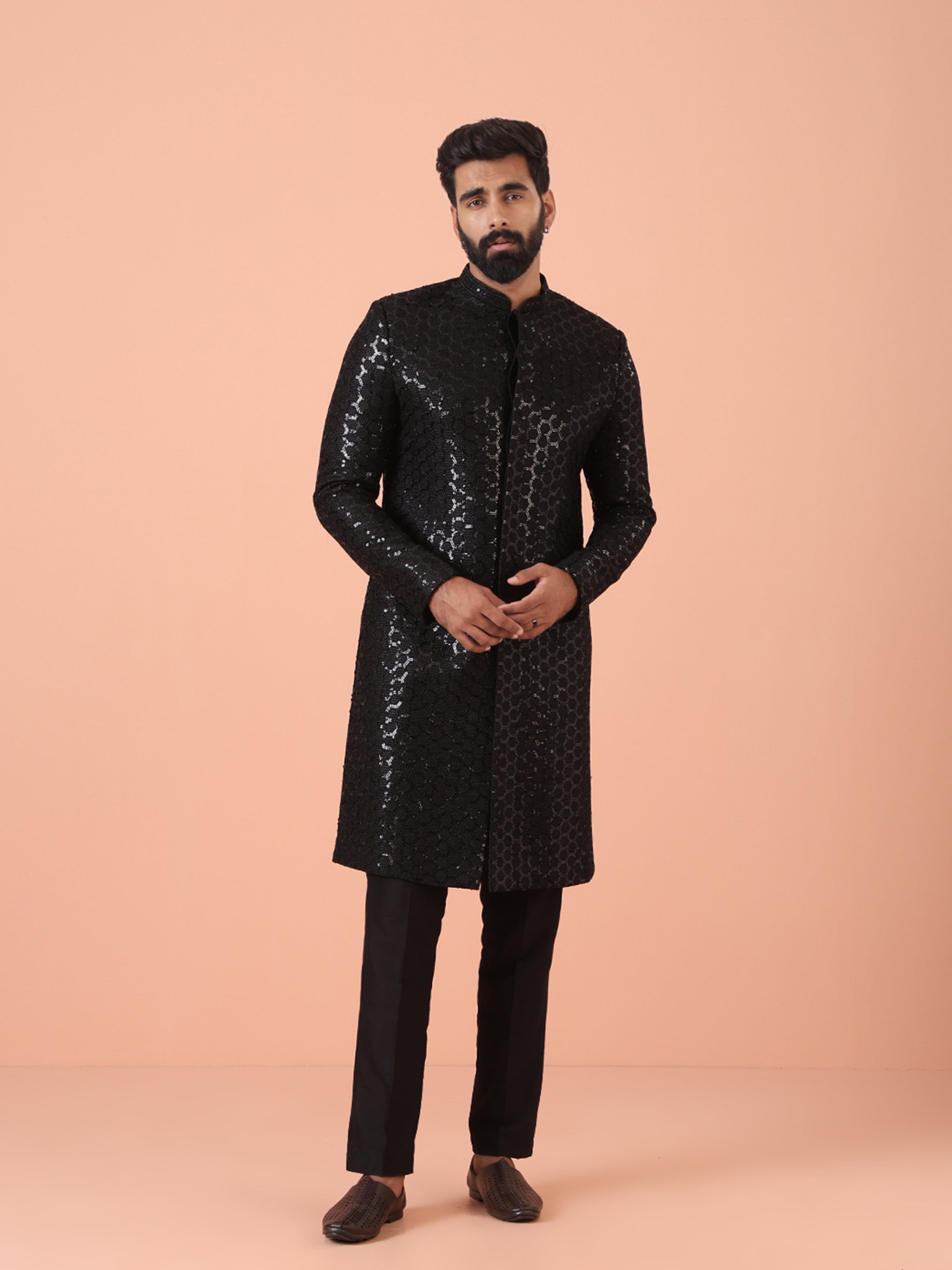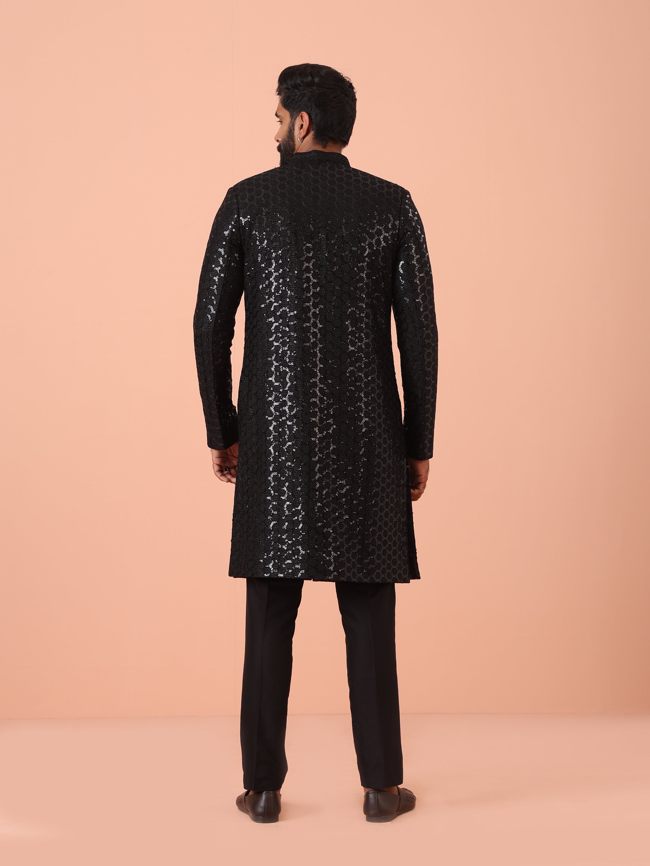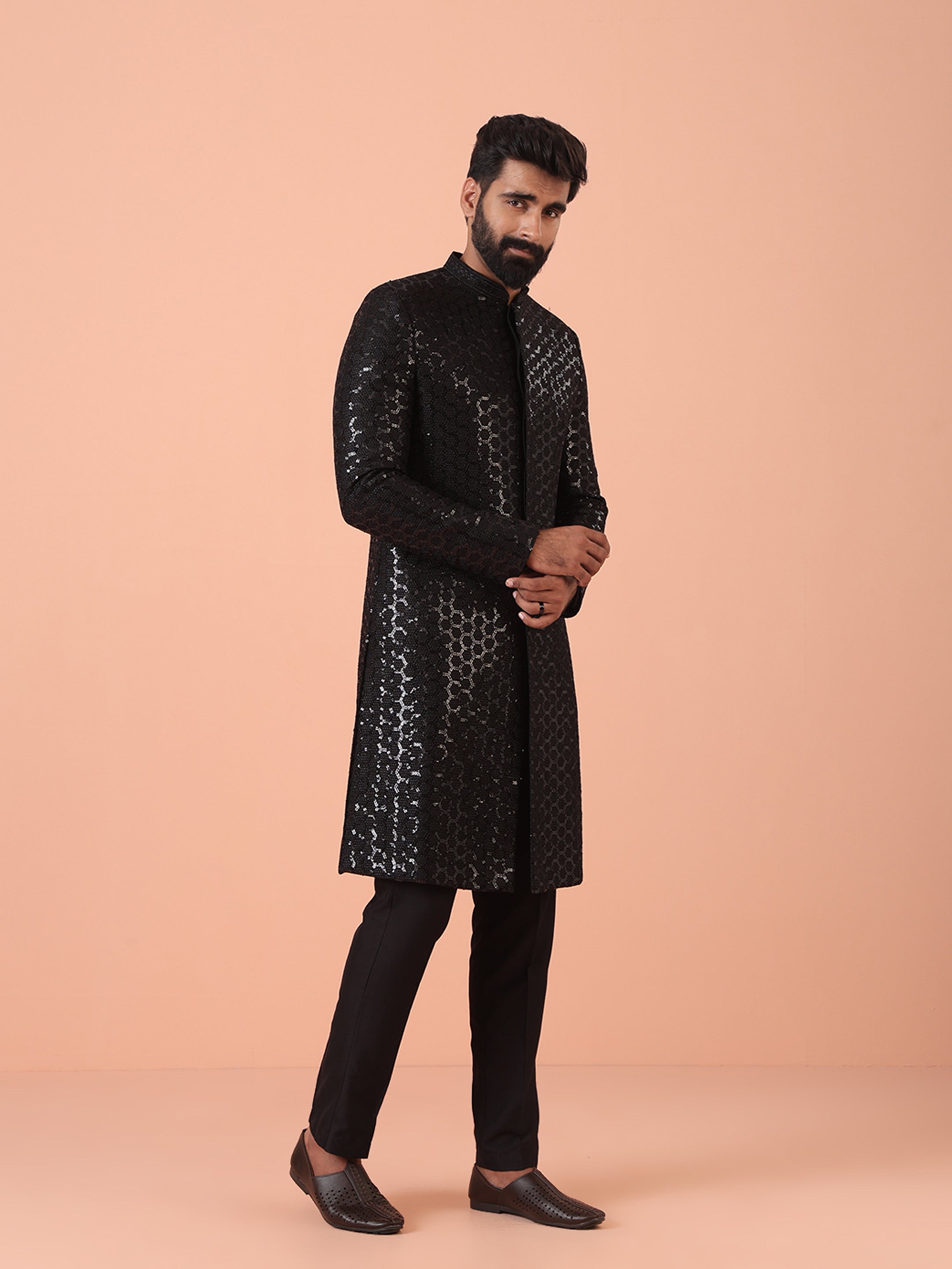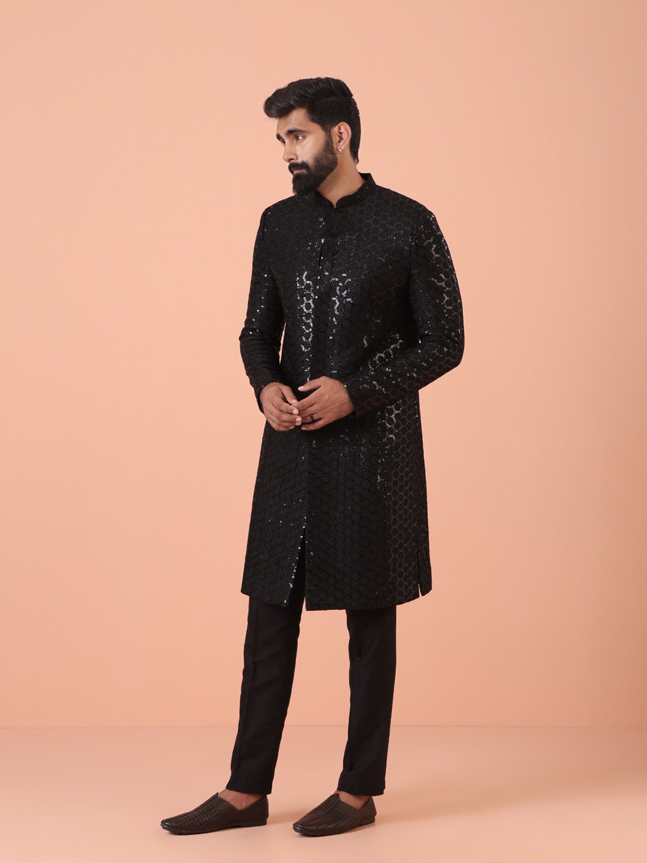 Experience classic elegance with this Men Black Embellished Indowestern Trouser Set with Sequinned. The breathable Silk Blend fabric ensures comfort throughout the day. Ideal for festive events or casual wear.