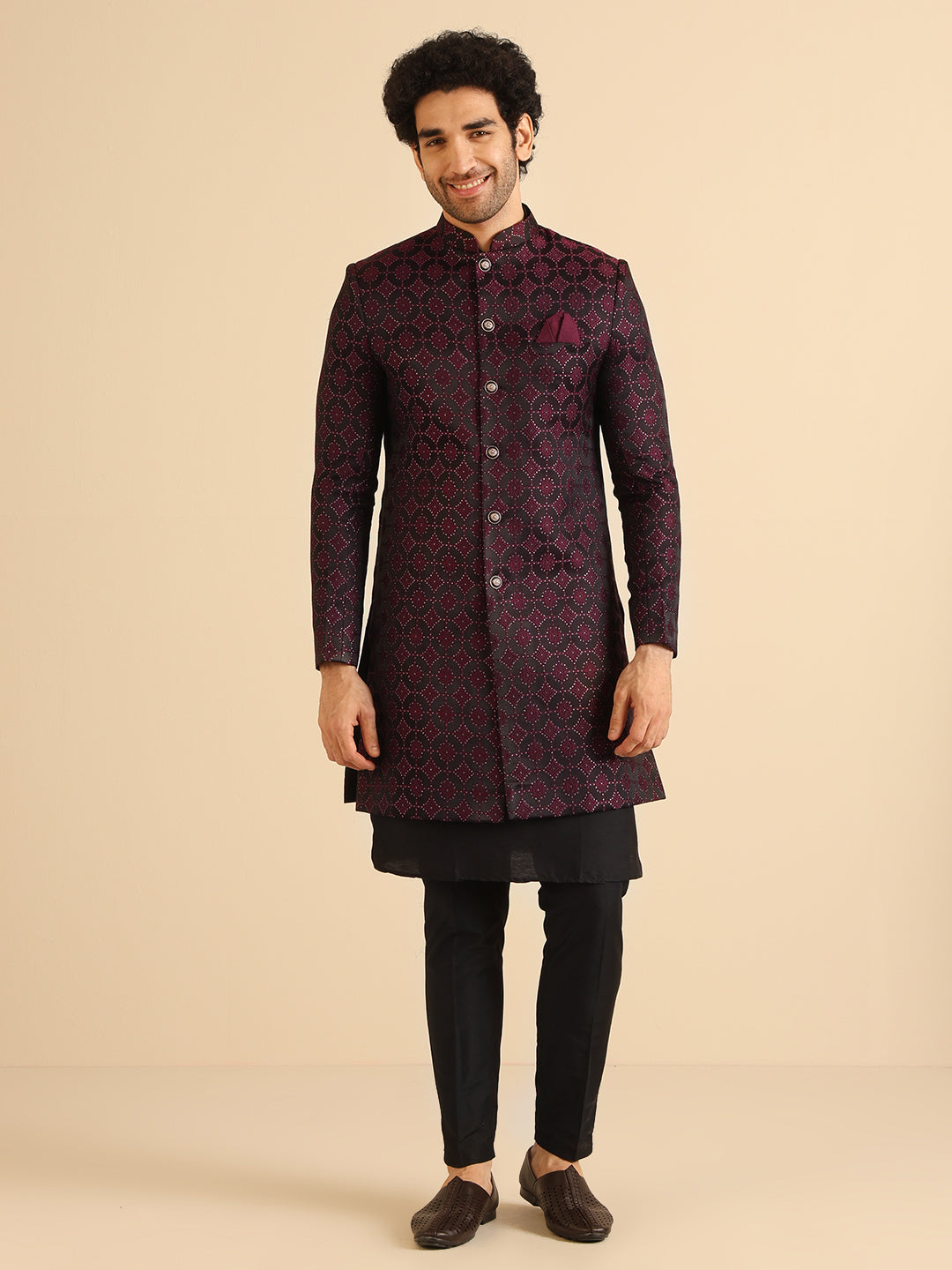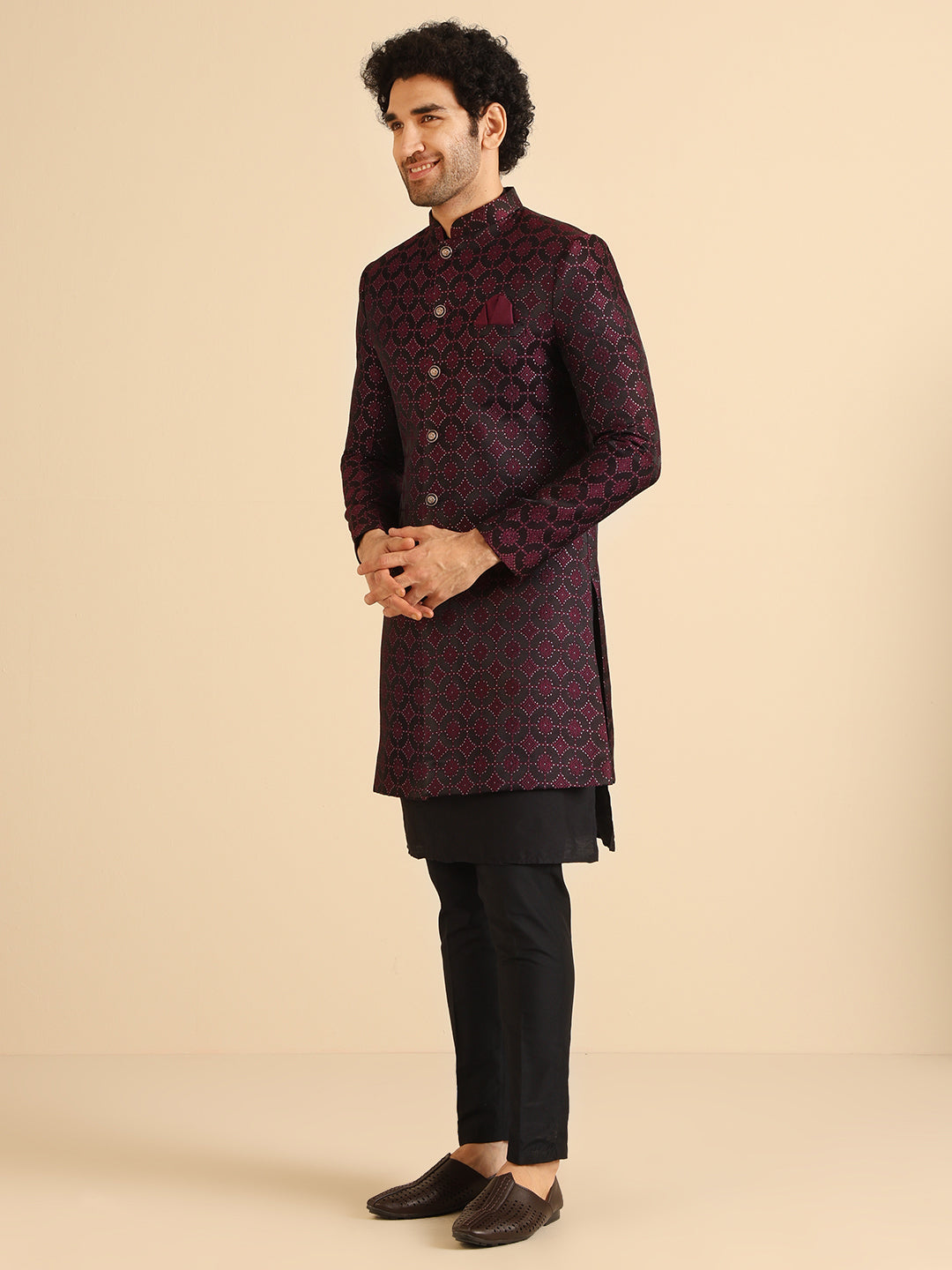 Men Black and Burgandy Textured Kurta Indowestern Trouser Set