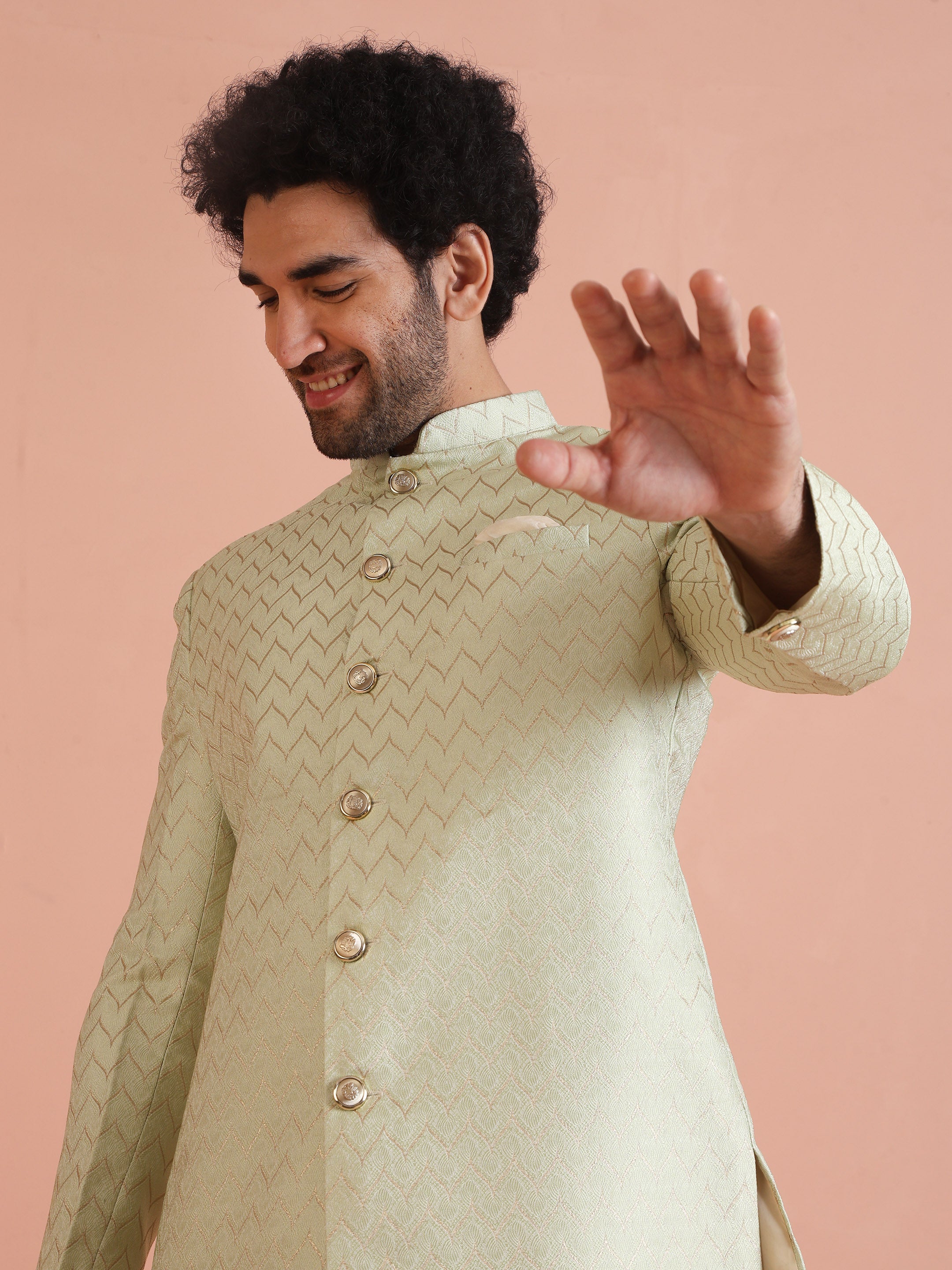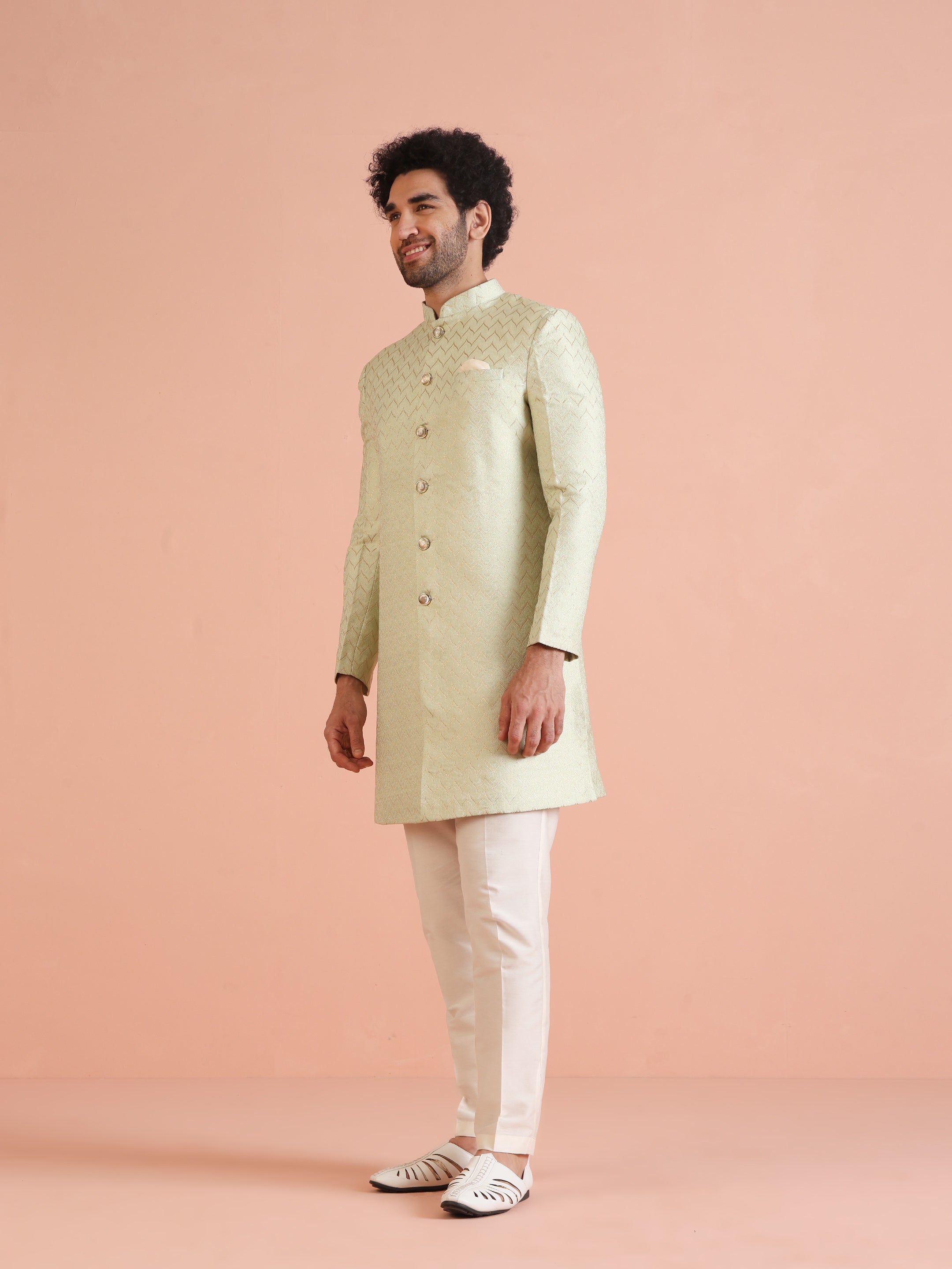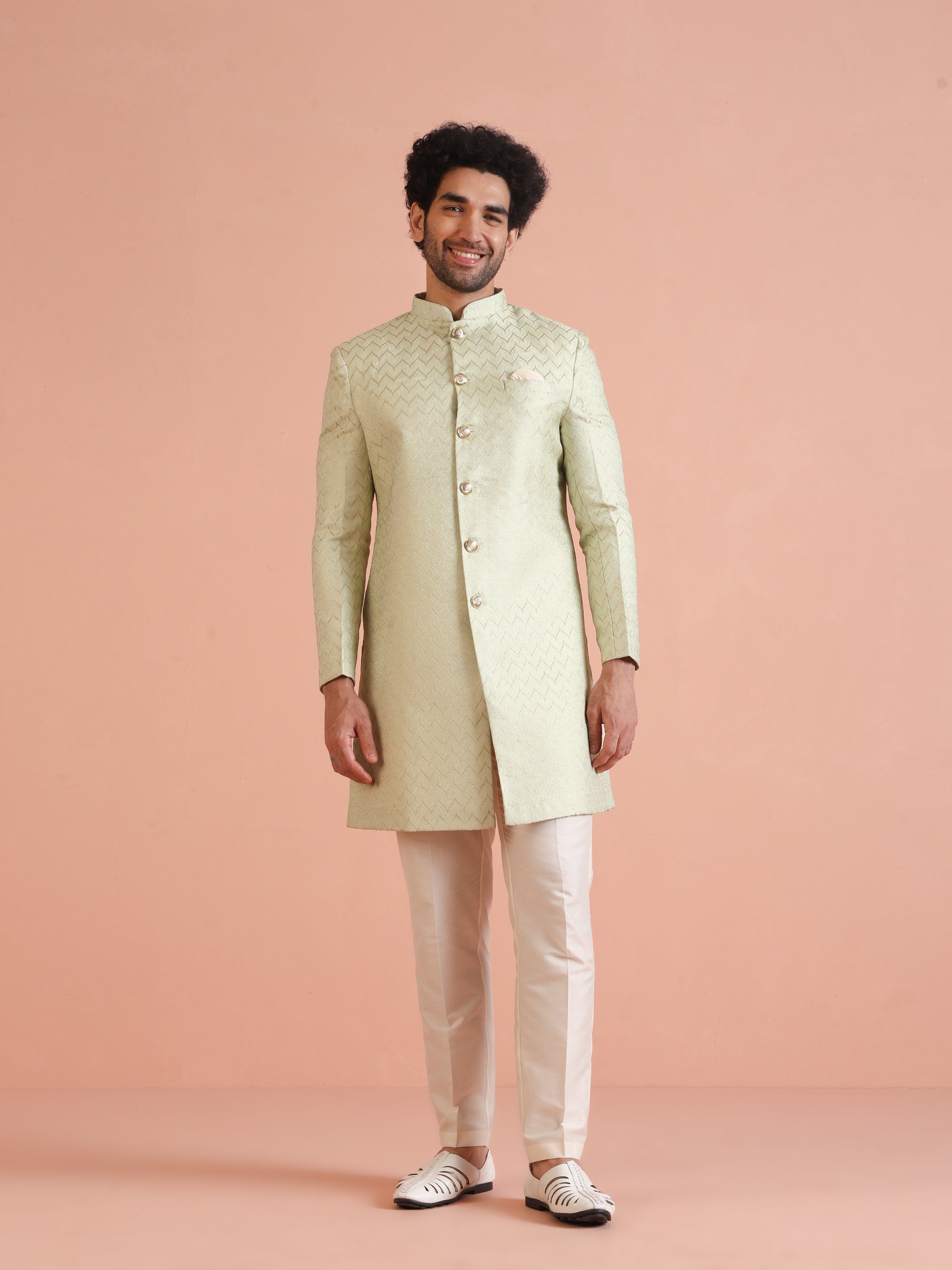 Experience classic elegance with this Kisah Men Grey Jacquard Indowestern Trouser Set. The breathable Silk Blend fabric with Jacquard Patternn ensures comfort throughout the day. Ideal for festive events or casual wear.