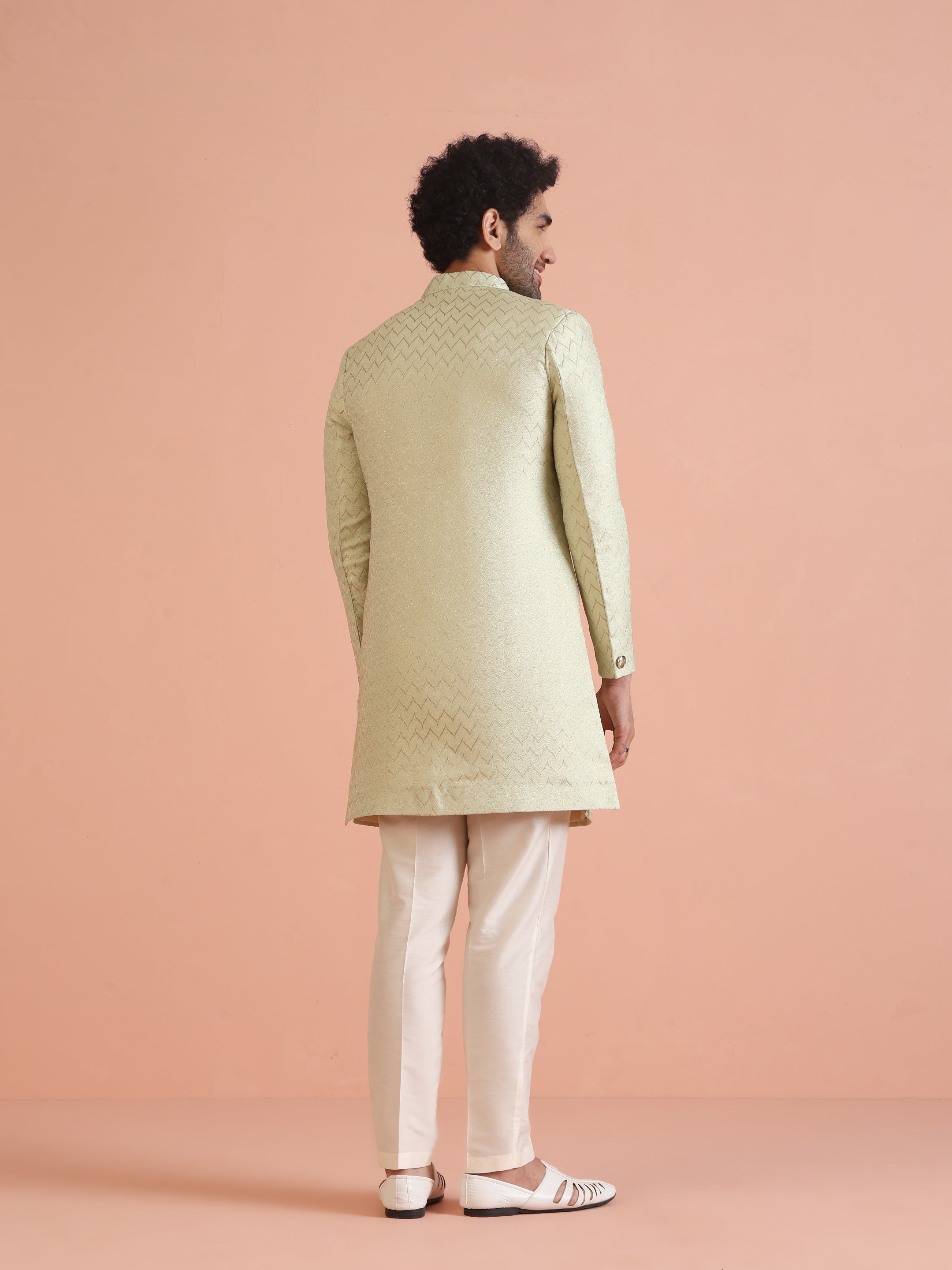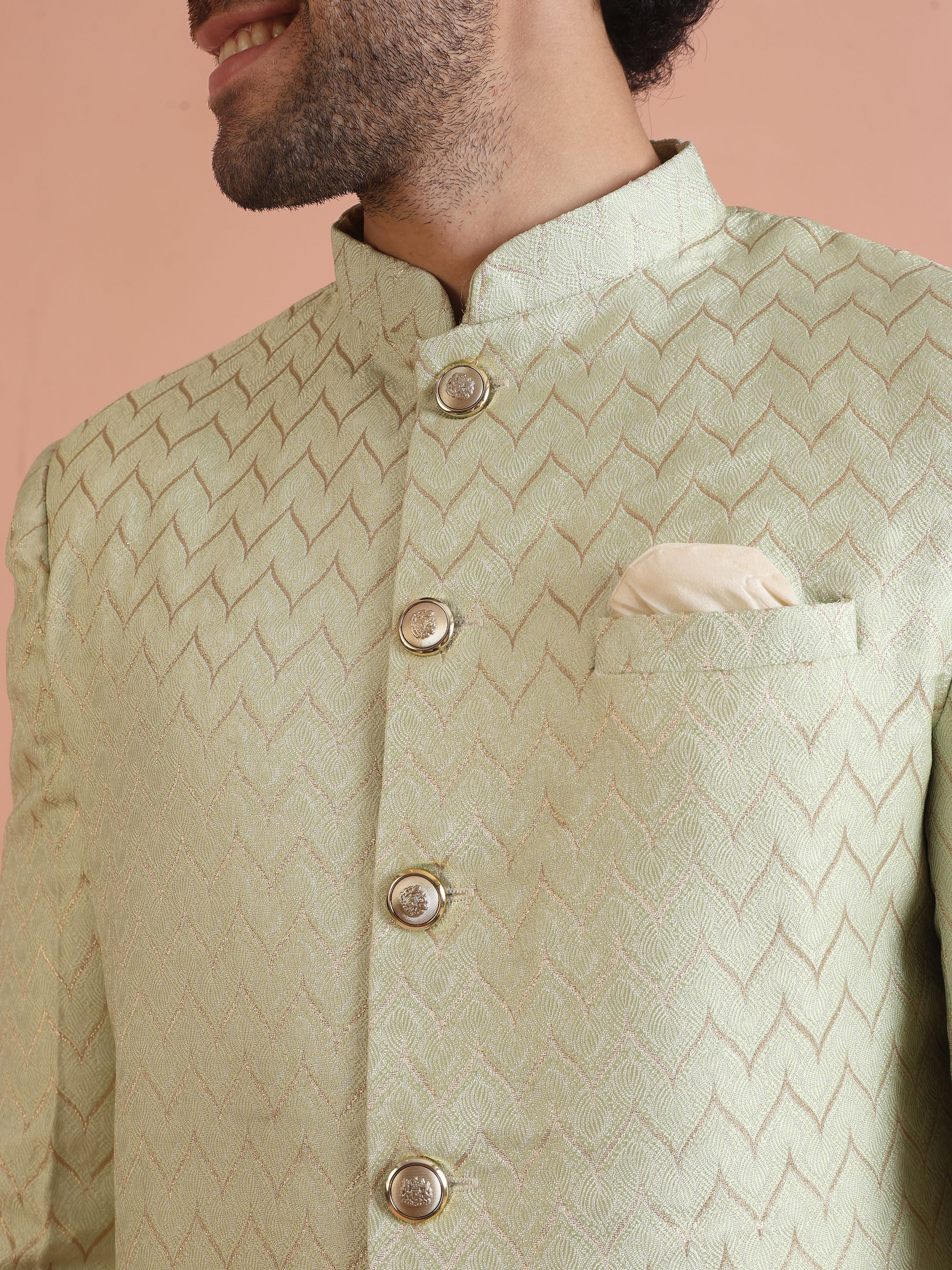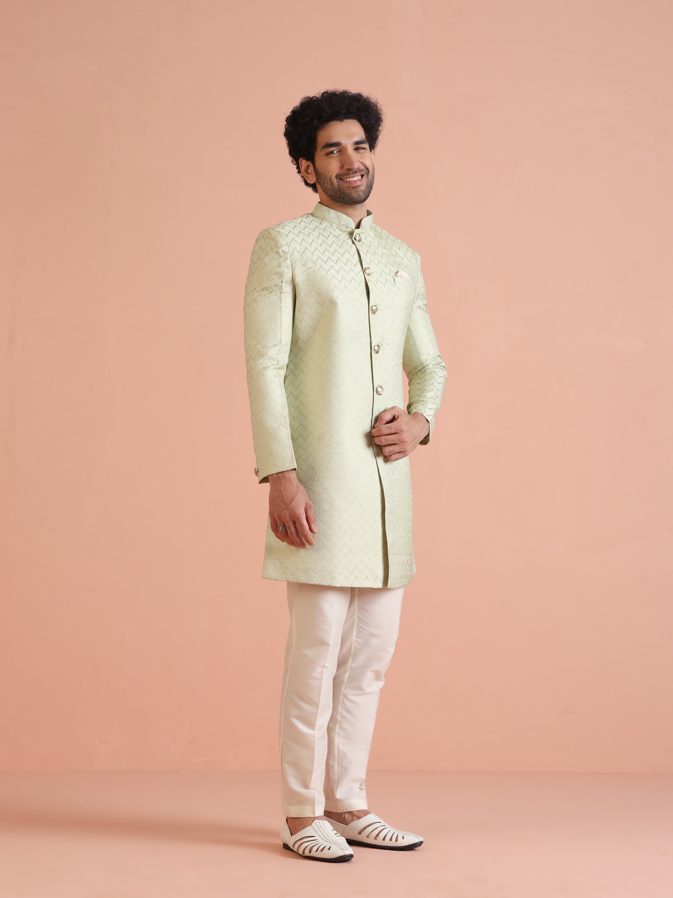 Experience classic elegance with this Kisah Men Grey Jacquard Indowestern Trouser Set. The breathable Silk Blend fabric with Jacquard Patternn ensures comfort throughout the day. Ideal for festive events or casual wear.