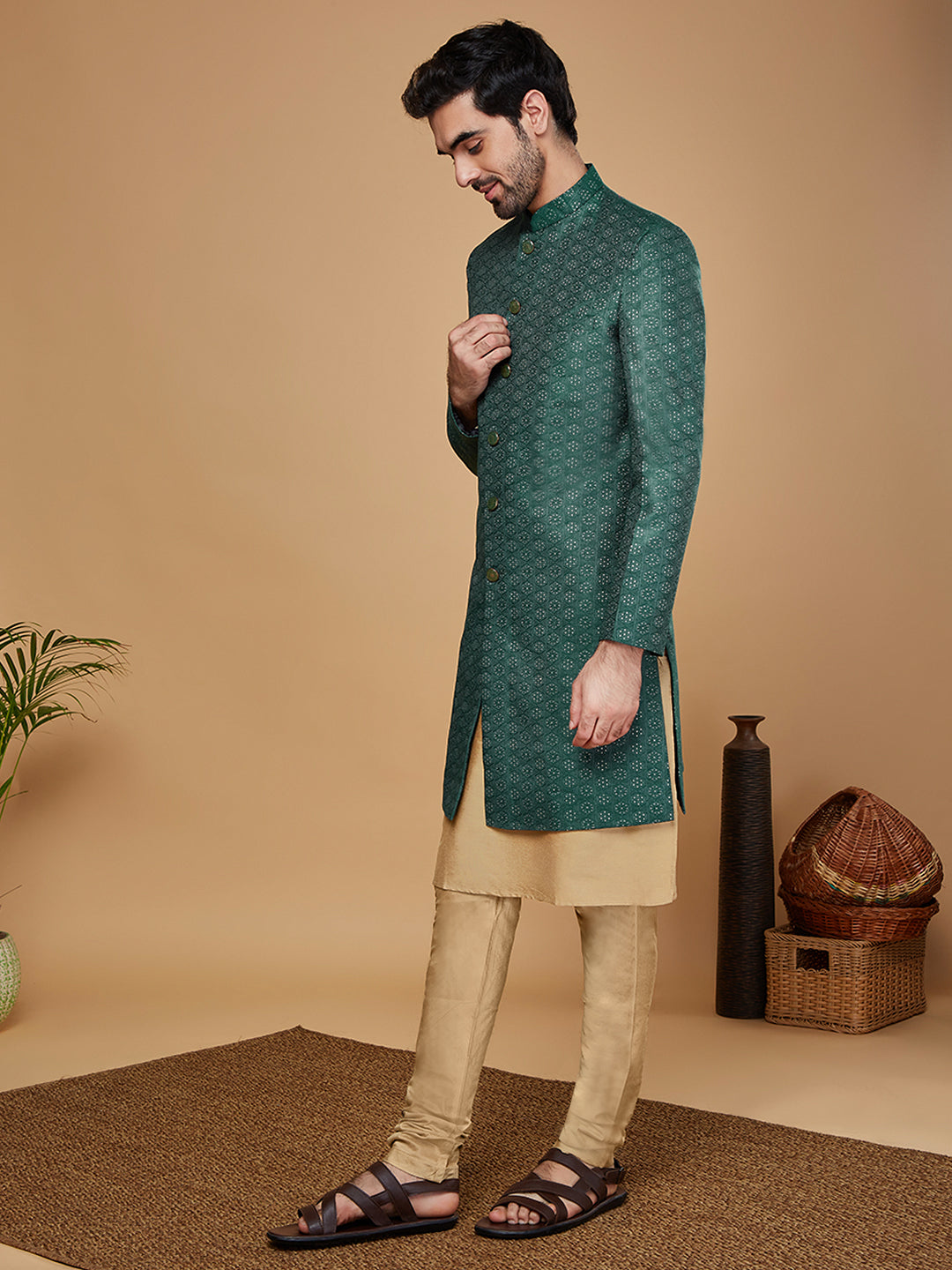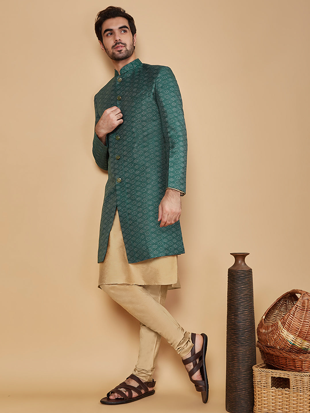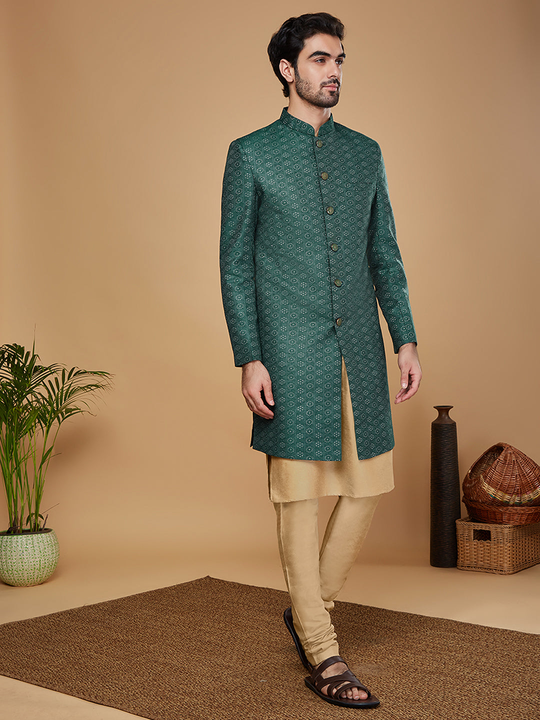 Flaunt your look in this Sherwani set crafted by the designers at Kisah. This Sherwani set is an exquisite set designed in Silk Blend Fabric in Gold. The design all over the Sherwani sets a parting glamorous style.This is a look that satiates traditional fashion needs at its best..
